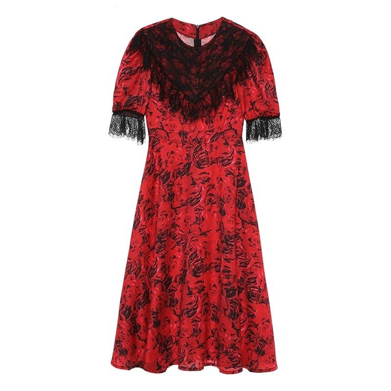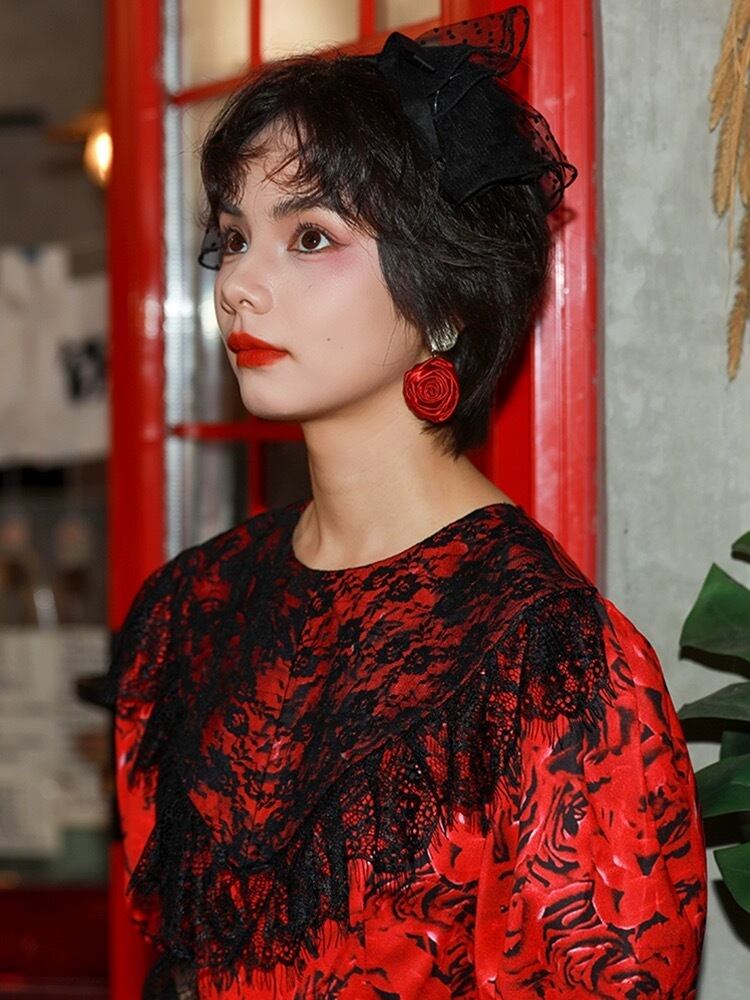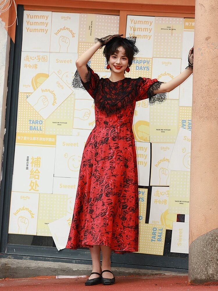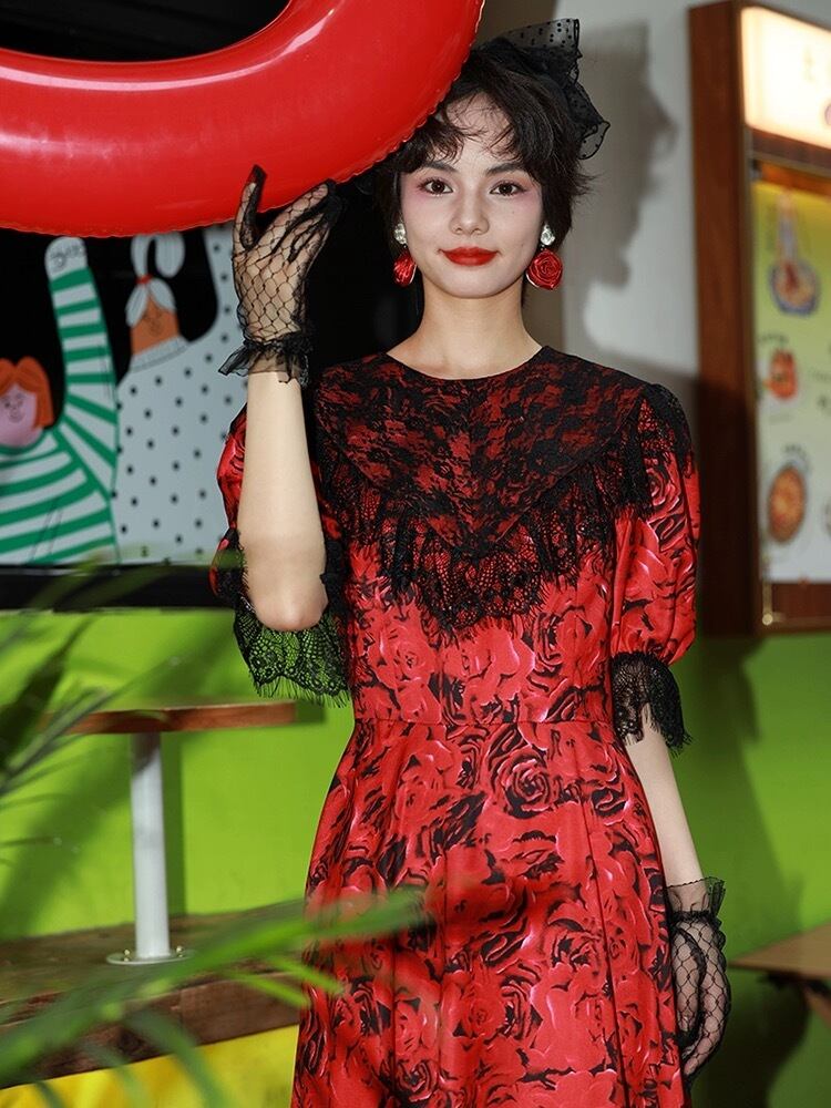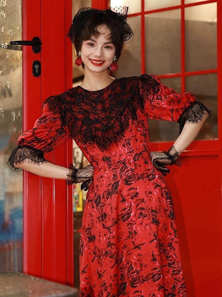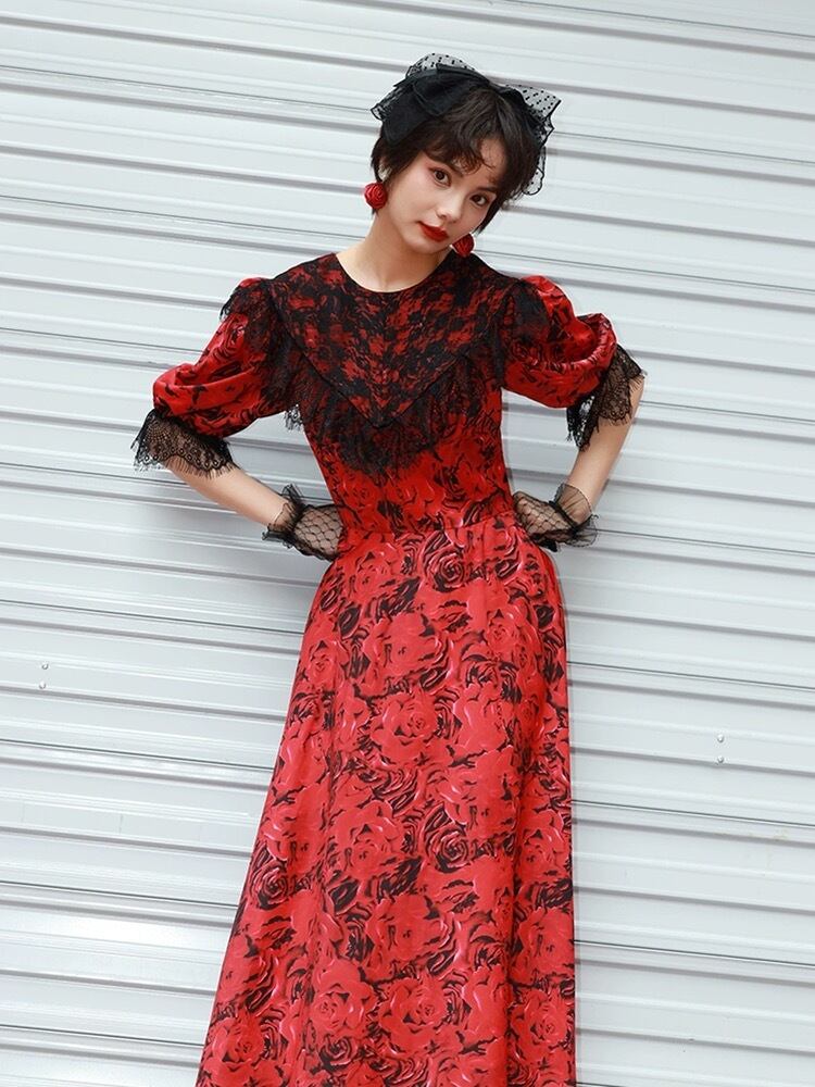 赤 花柄 フラワー 黒 レース クラシック ガーリー レトロ 丸襟 ブラウス ワンピース 原宿 80年代 アイドル 古着 昭和 ブラウス ワンピース