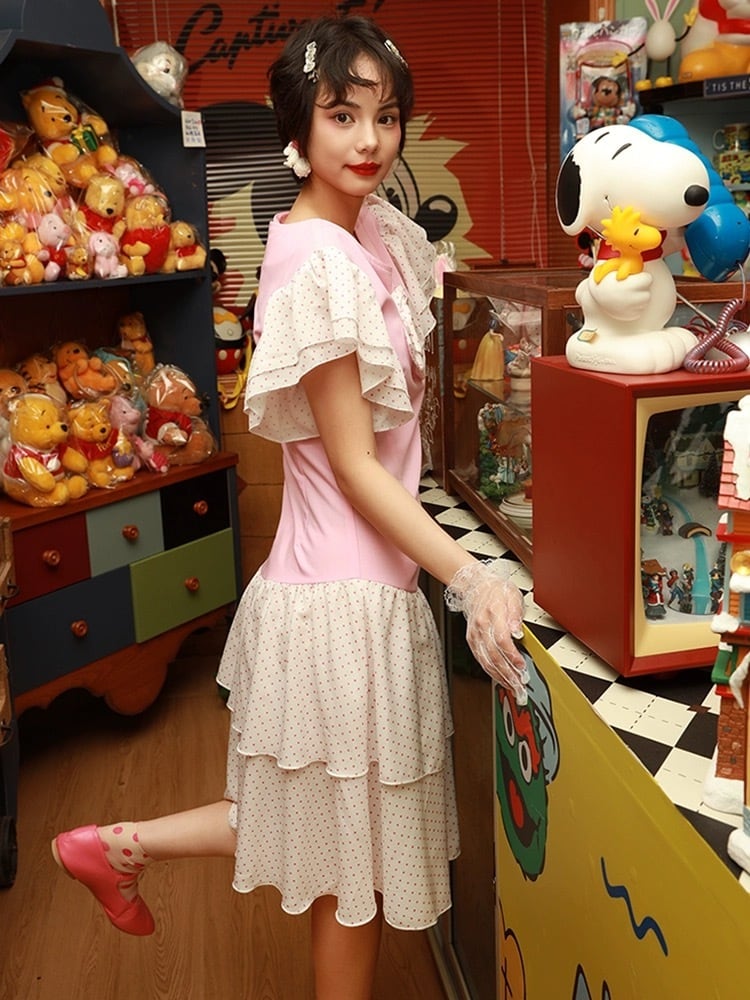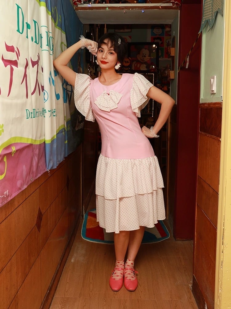ピンク 水玉 ドット クラシック ガーリー レトロ 丸襟 ブラウス ワンピース 原宿 80年代 アイドル 古着 昭和 ブラウス ワンピース リボン