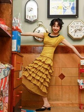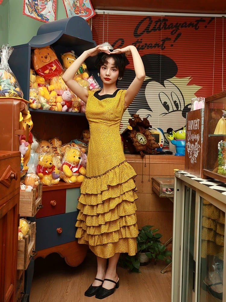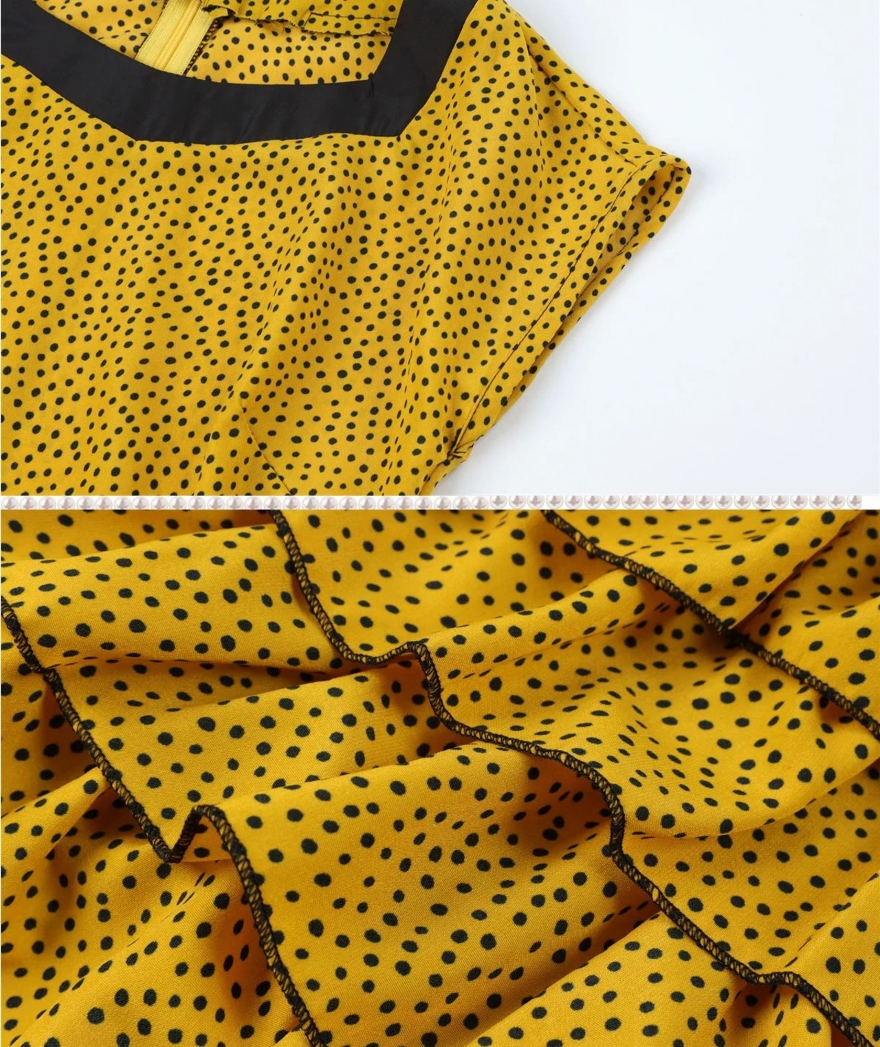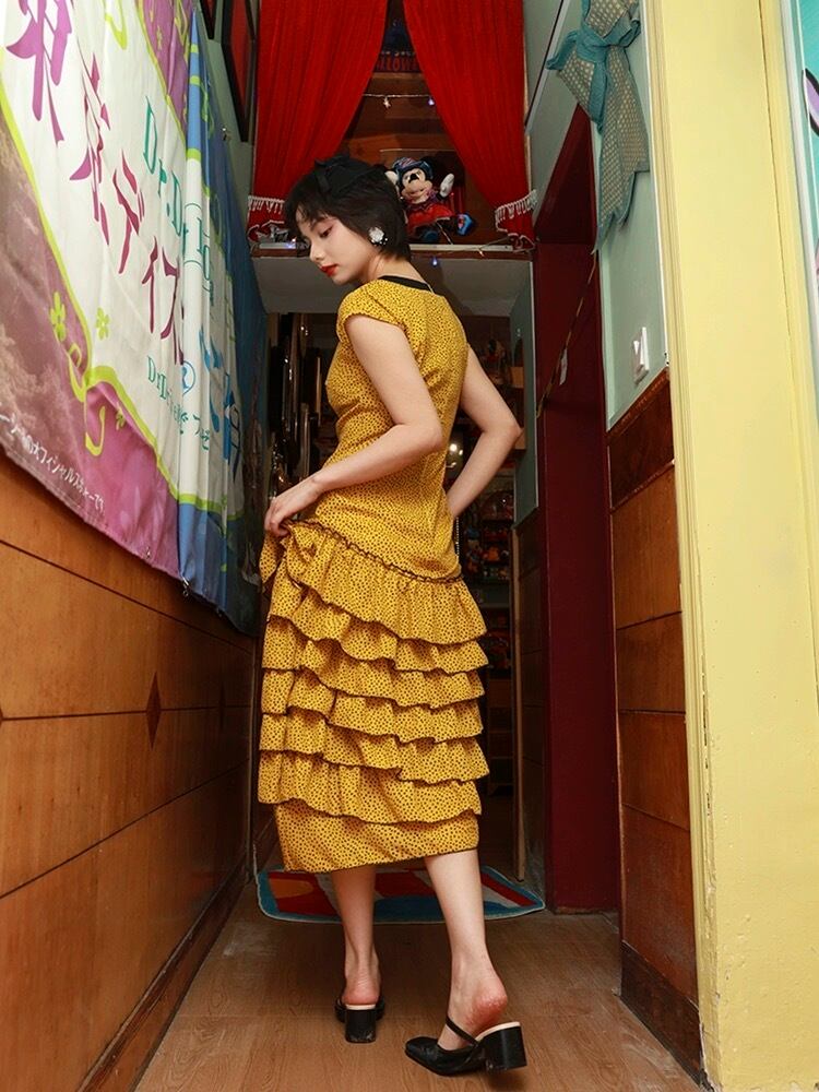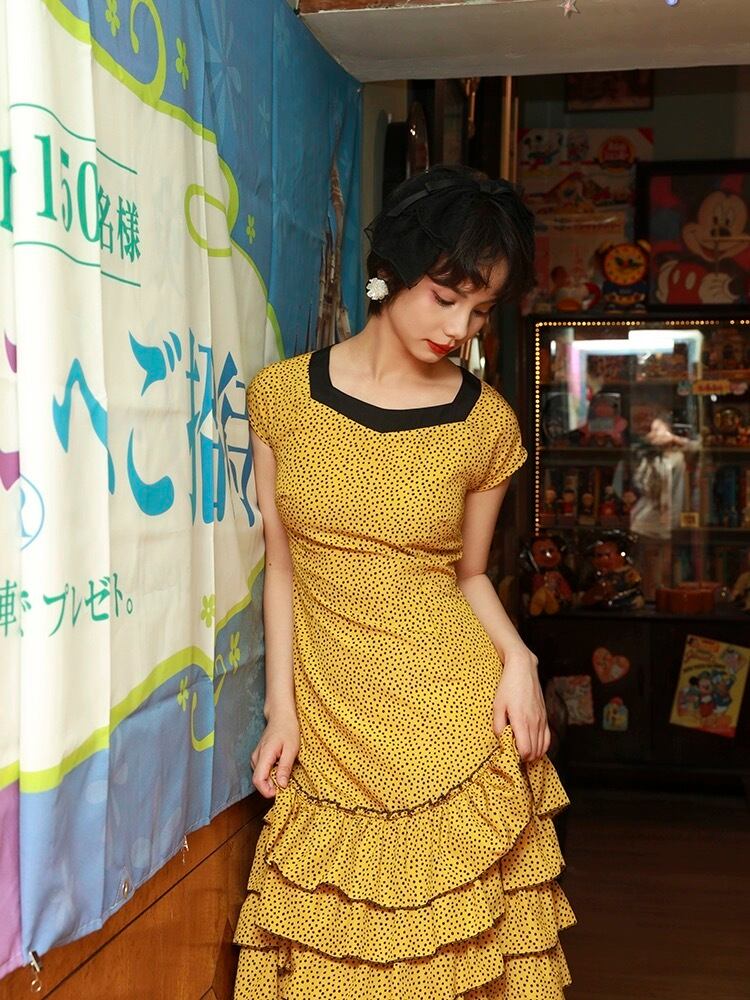 黄色 ドット 黒 水玉 クラシック ガーリー レトロ 丸襟 ブラウス ワンピース 原宿 80年代 アイドル 古着 昭和 ブラウス ワンピース