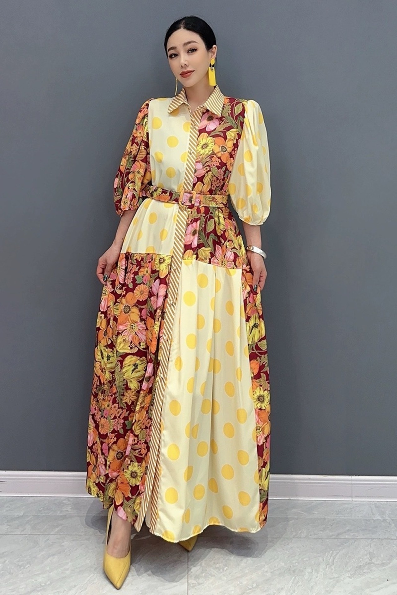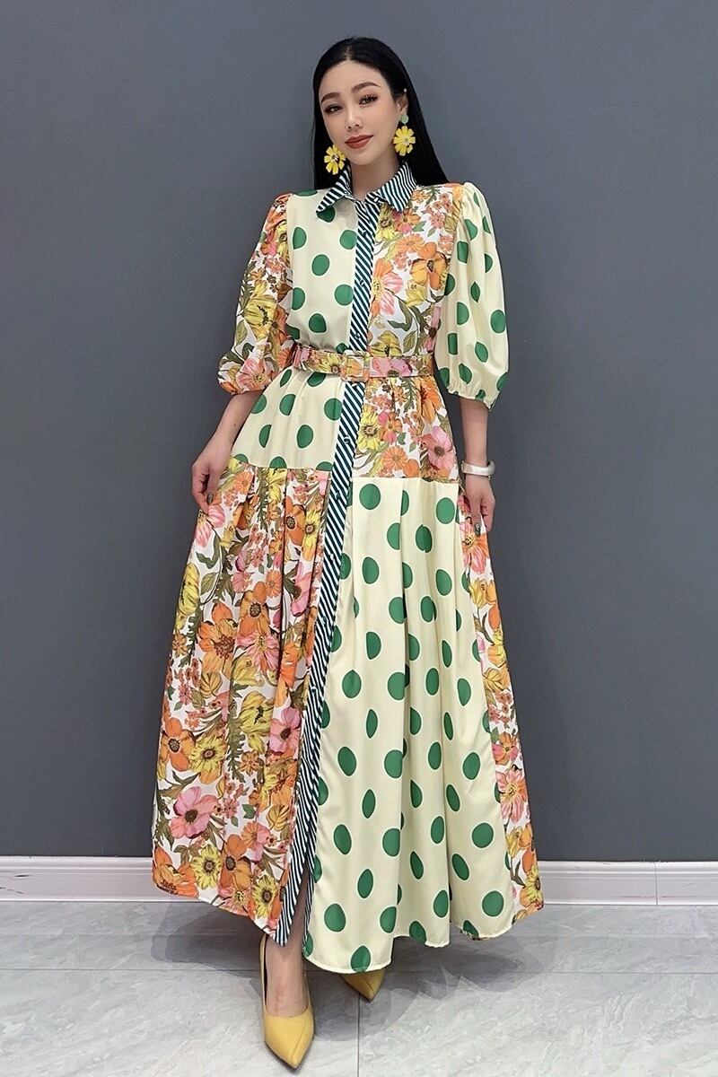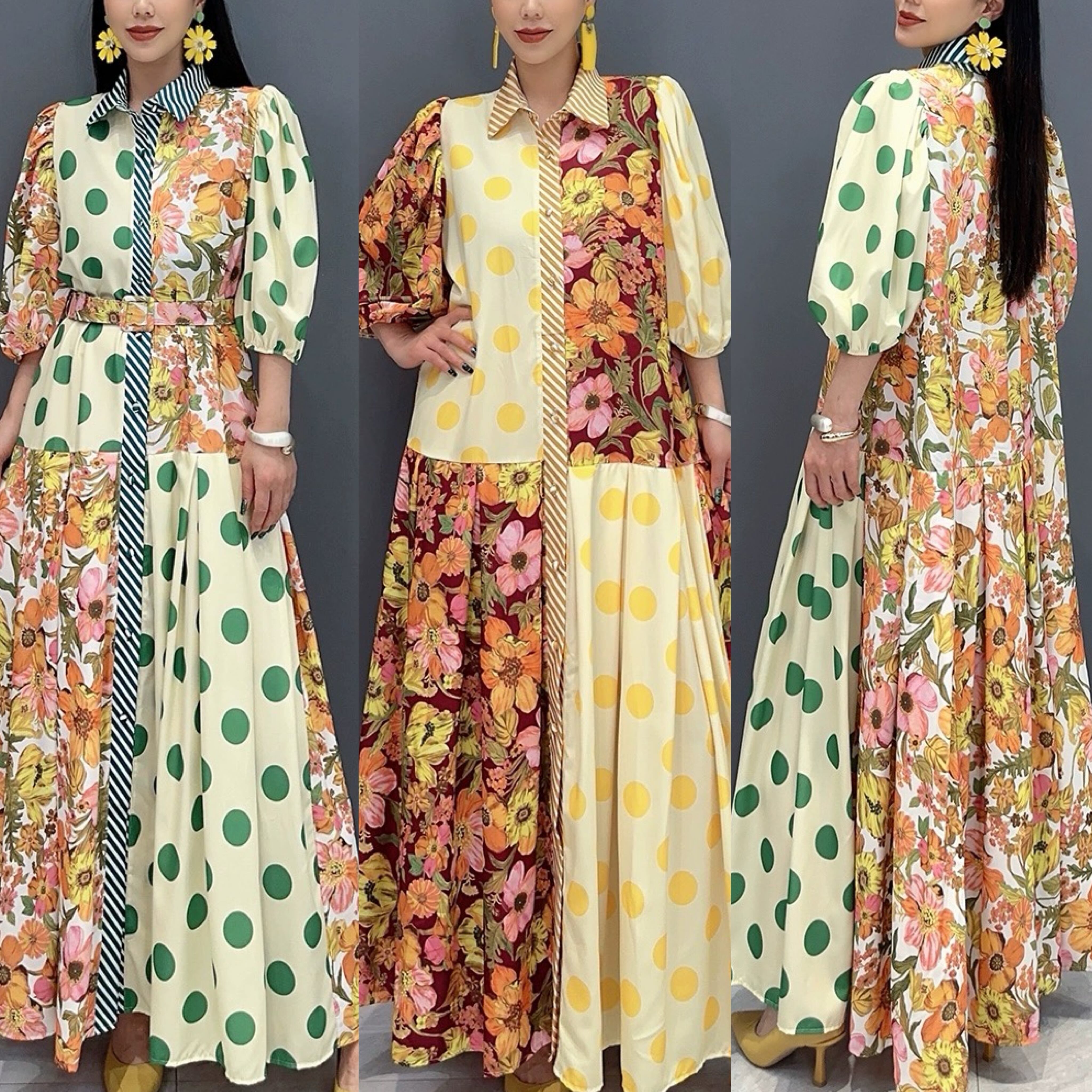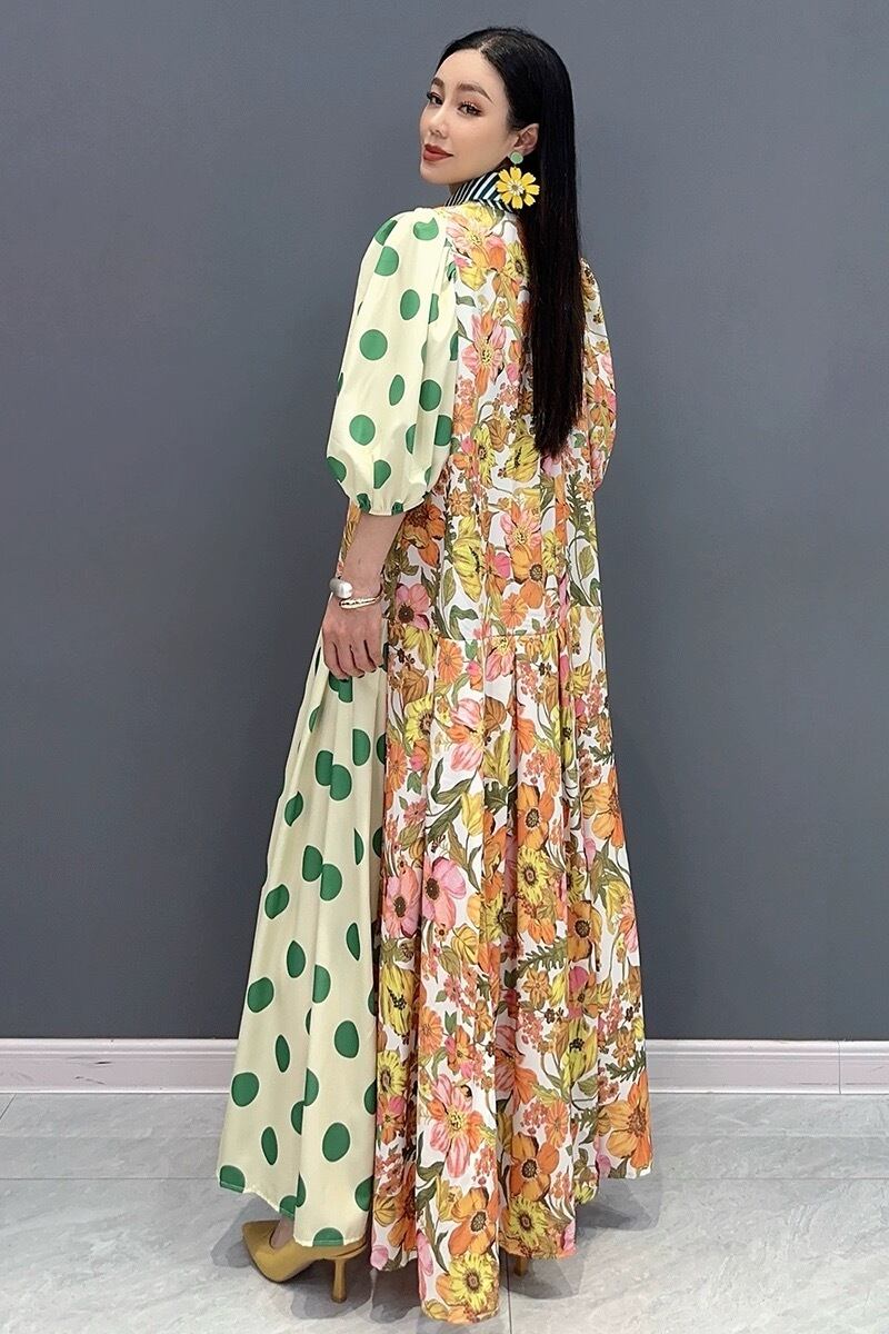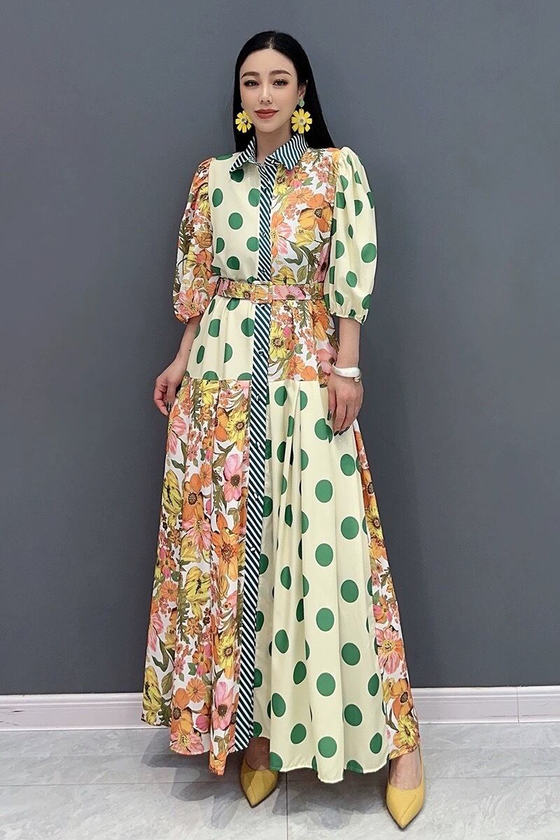 黄色 水玉 緑 ドット ブラウス マキシ 花柄 フラワー ロング スカート XL