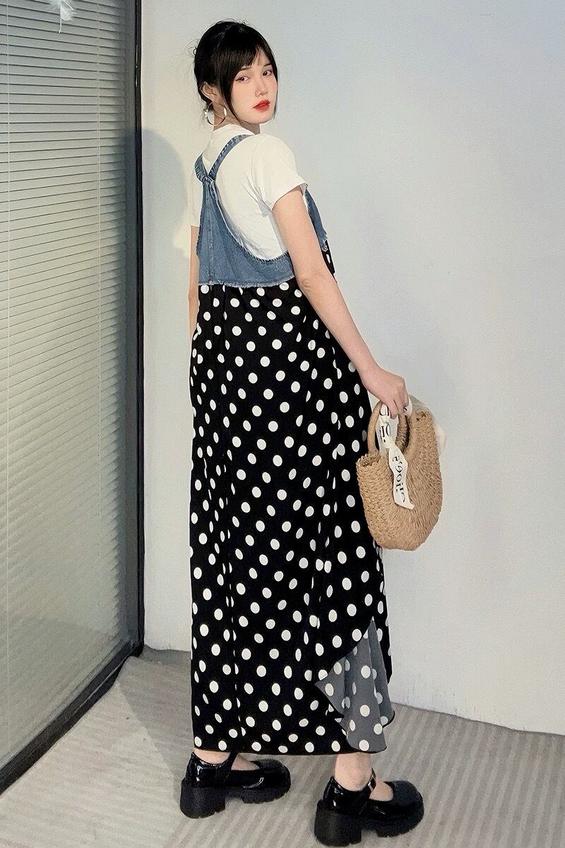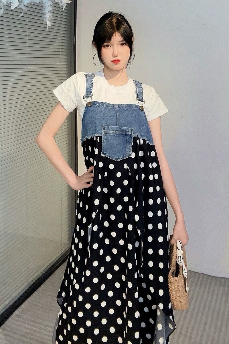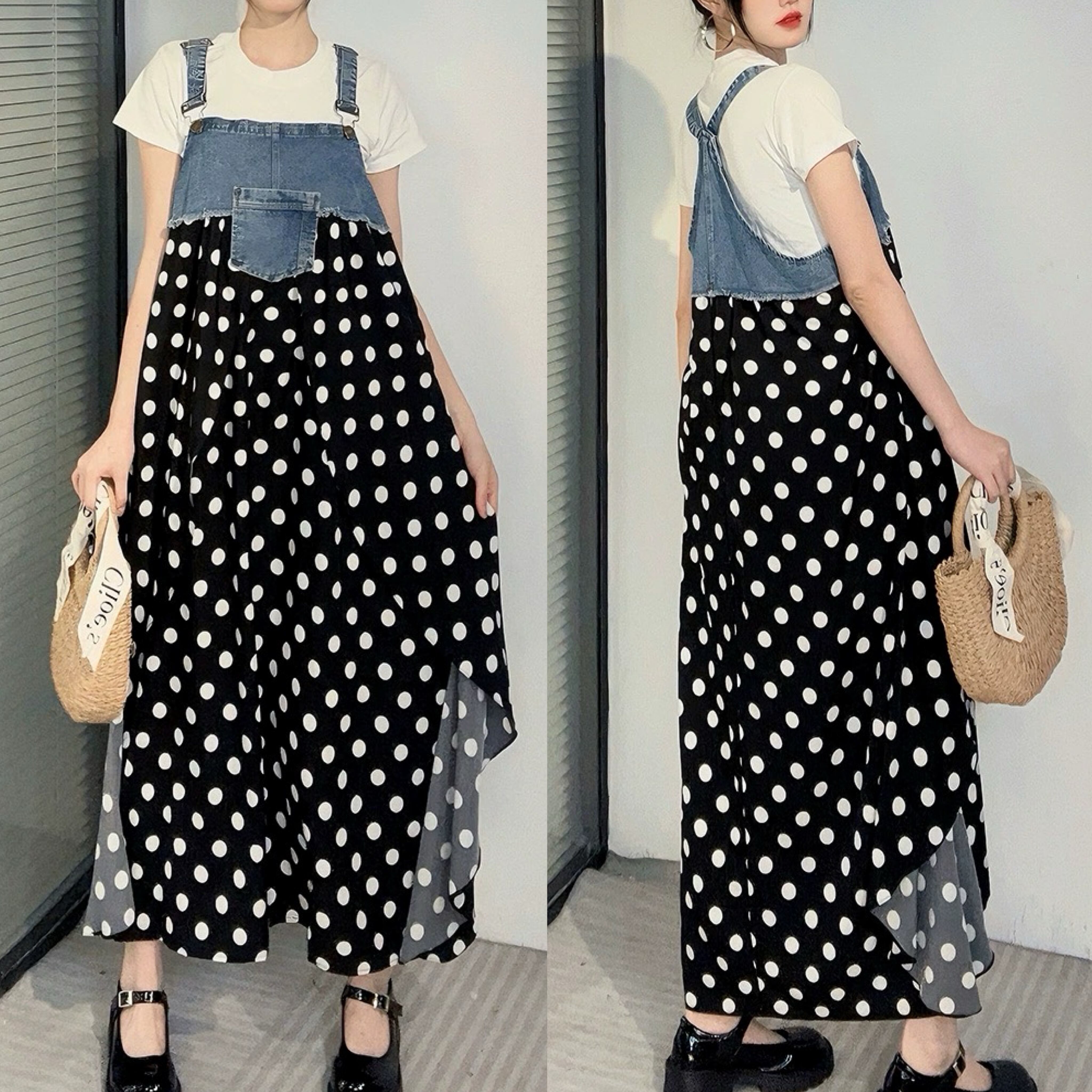 デニム 水玉 ドット 黒 ワンピース カジュアル ゆったり つなぎ オールインワン