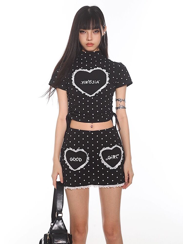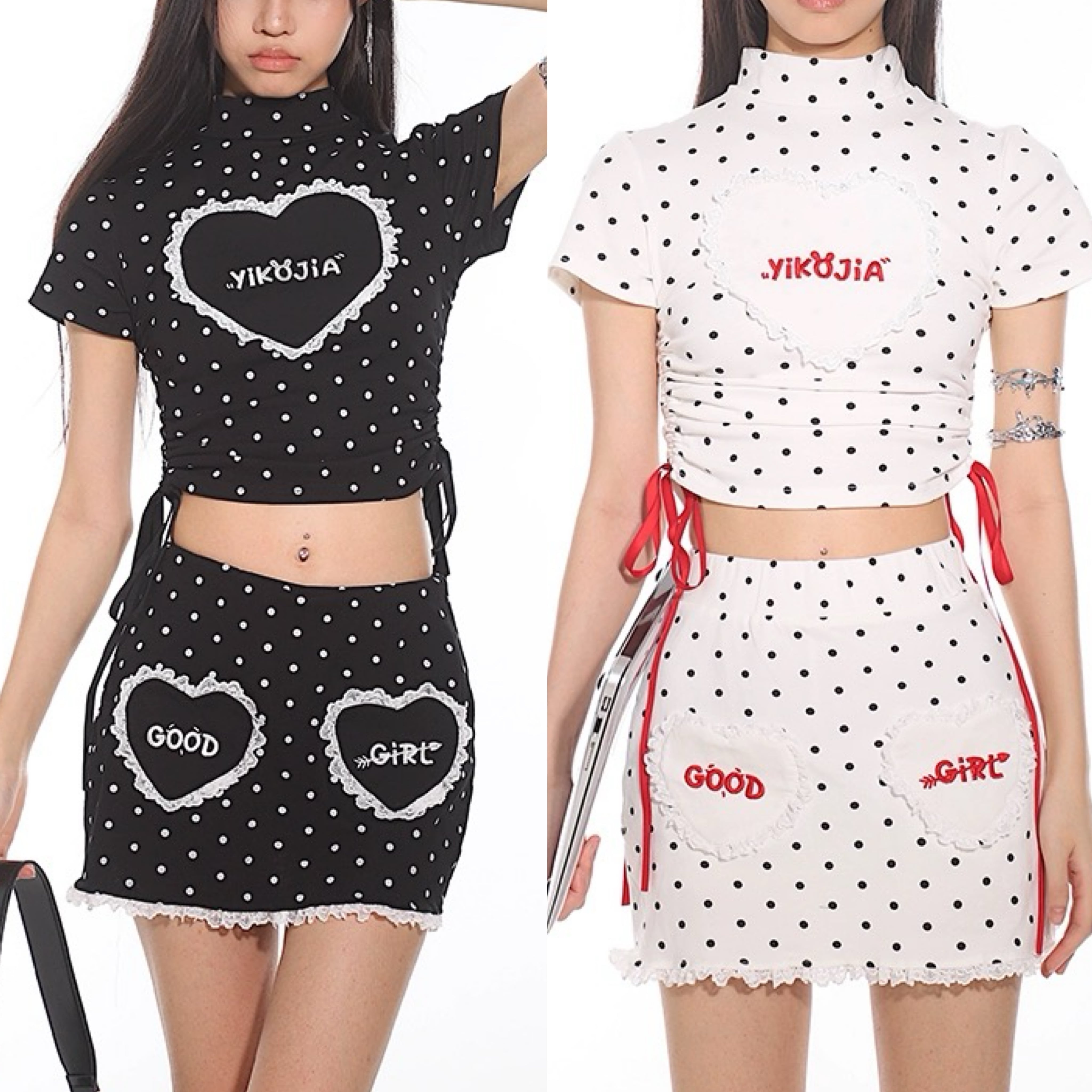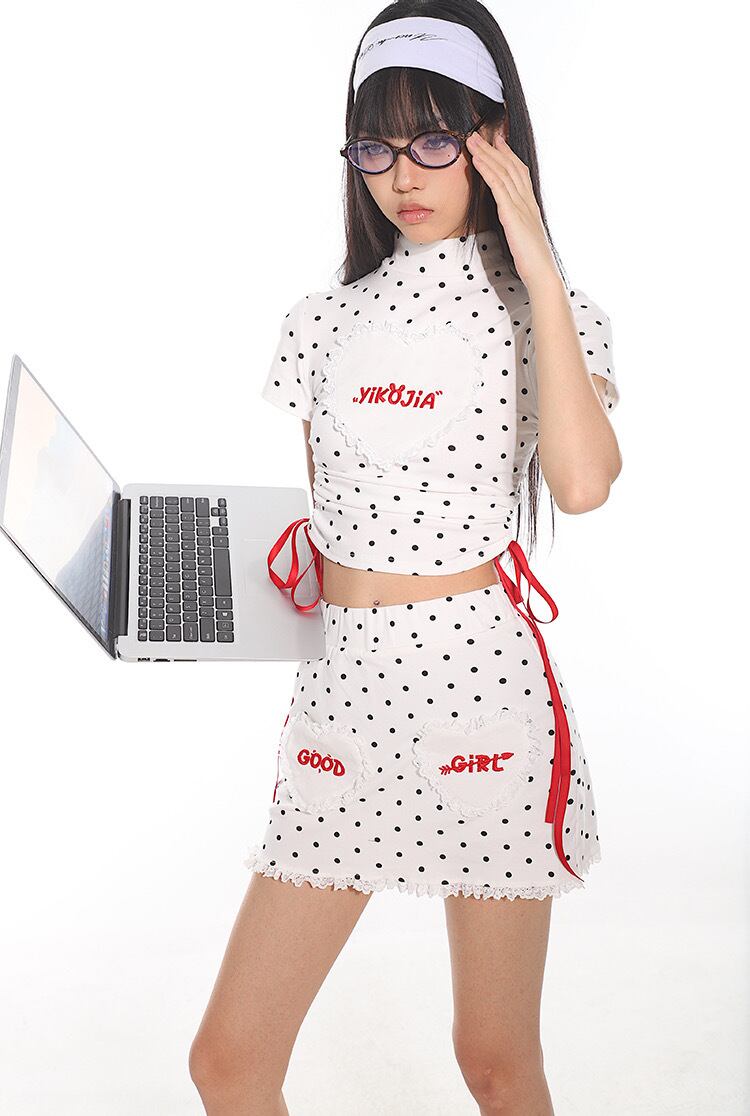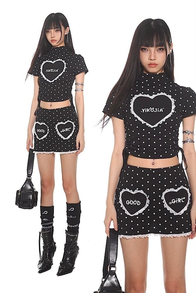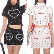 【セットアップ】白 黒 水玉 ドット 赤 Tシャツ 可愛い ミニスカート ハート Tシャツ 渋谷 原宿 クラブ 可愛い