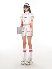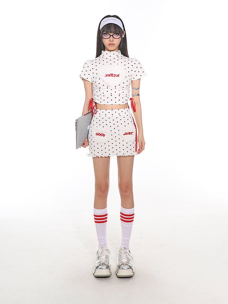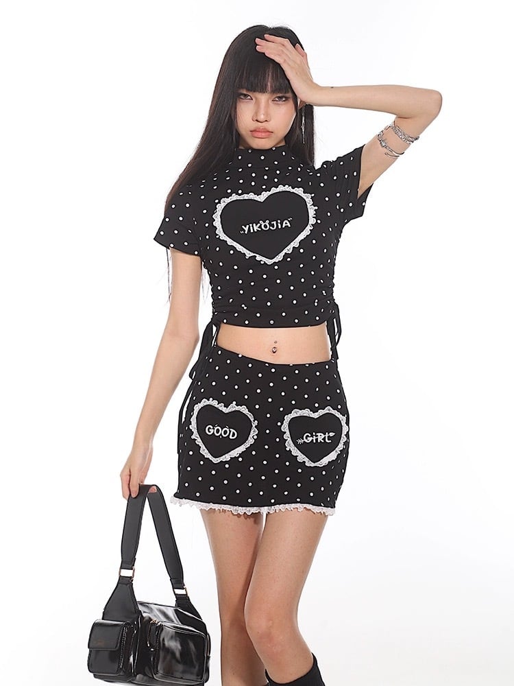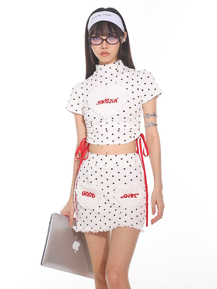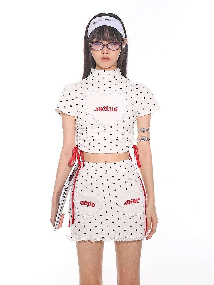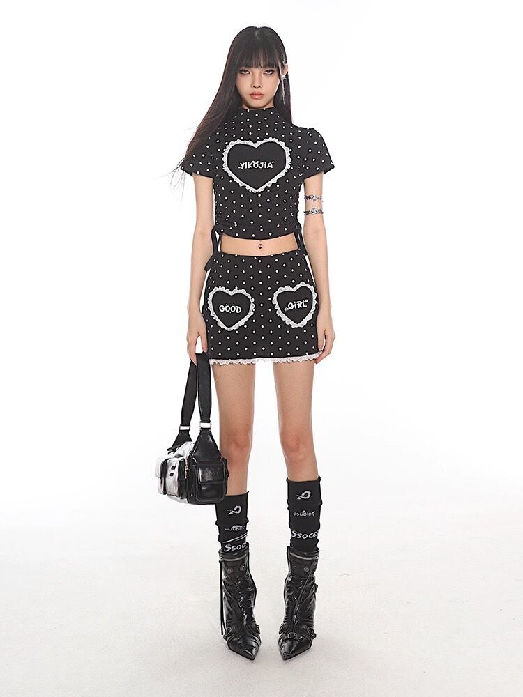 【セットアップ】白 黒 水玉 ドット 赤 Tシャツ 可愛い ミニスカート ハート Tシャツ 渋谷 原宿 クラブ 可愛い
