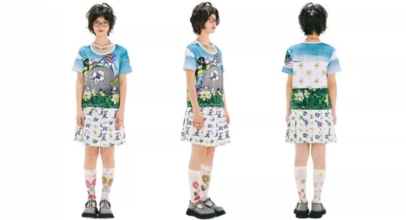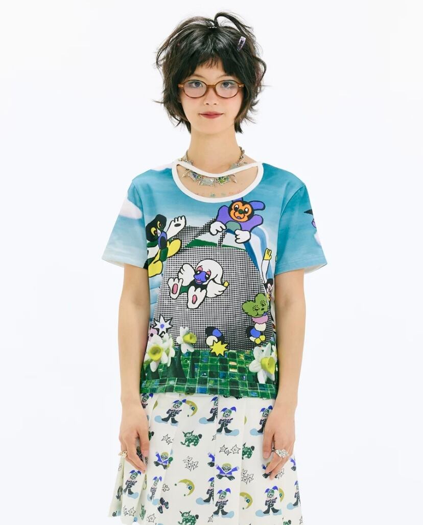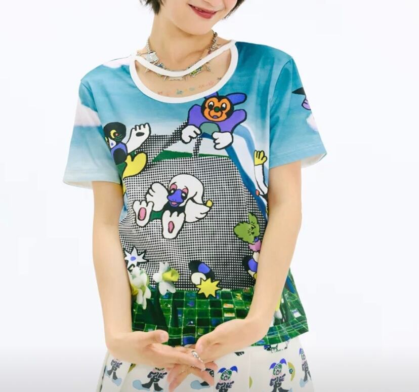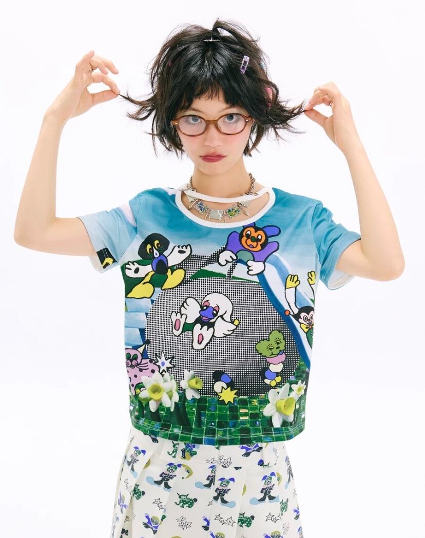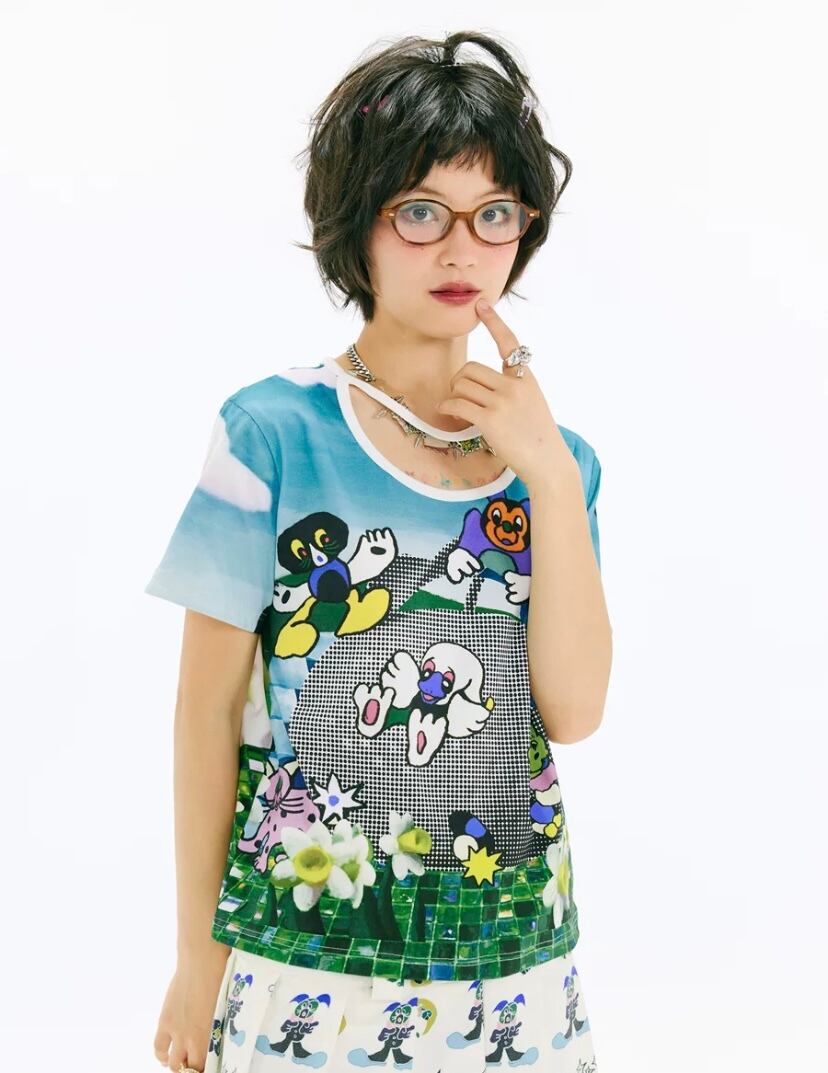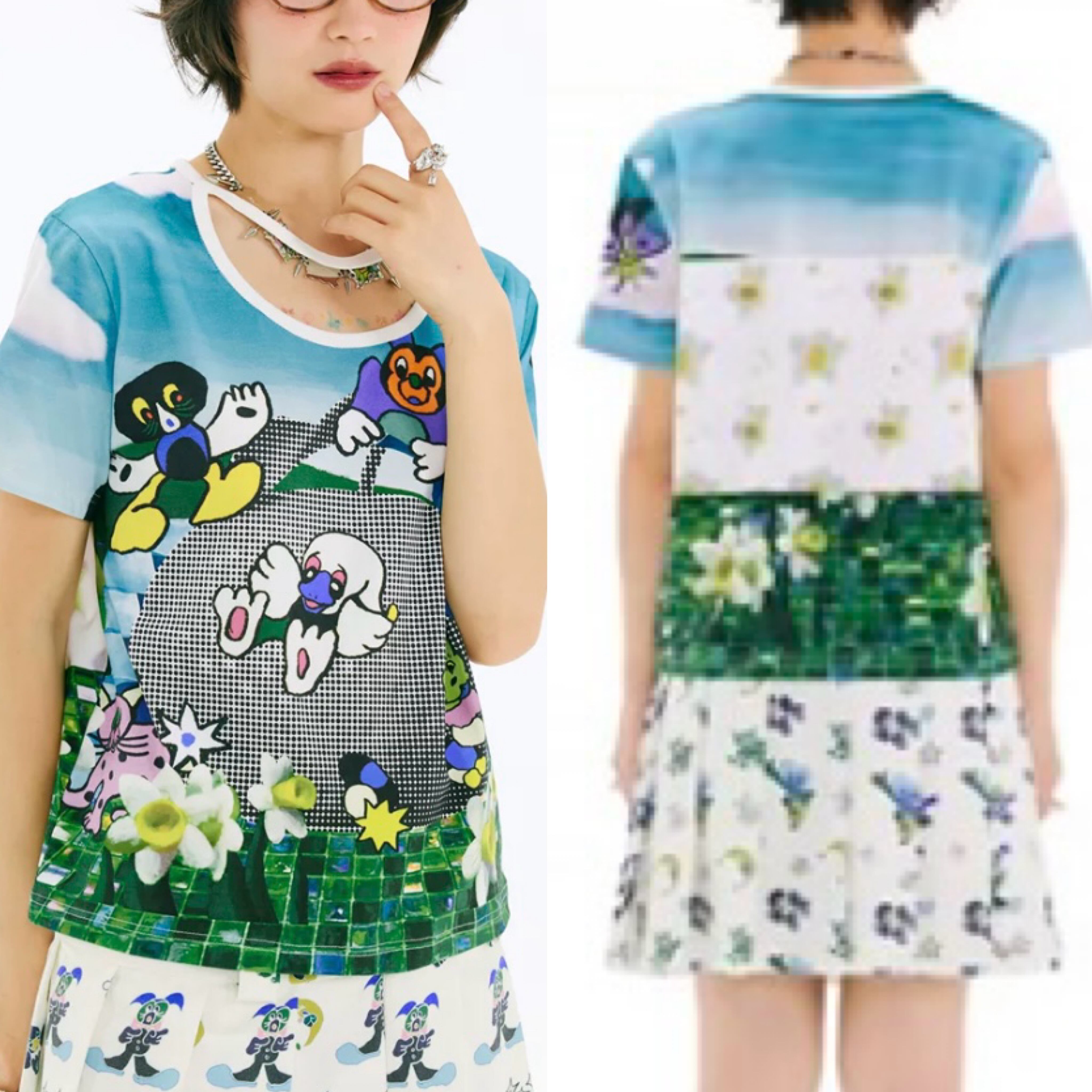 カジュアル 緑 トップス 原宿 可愛い 柄 水仙 花柄 Tシャツ ブラウス