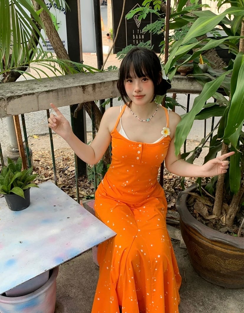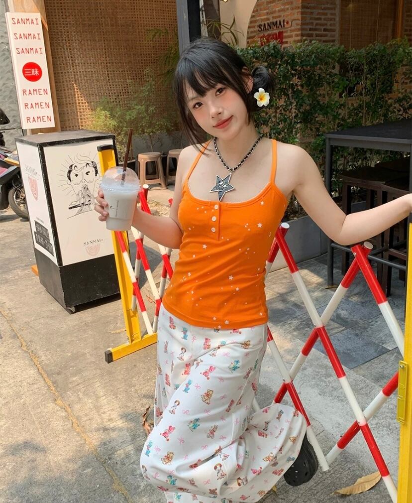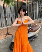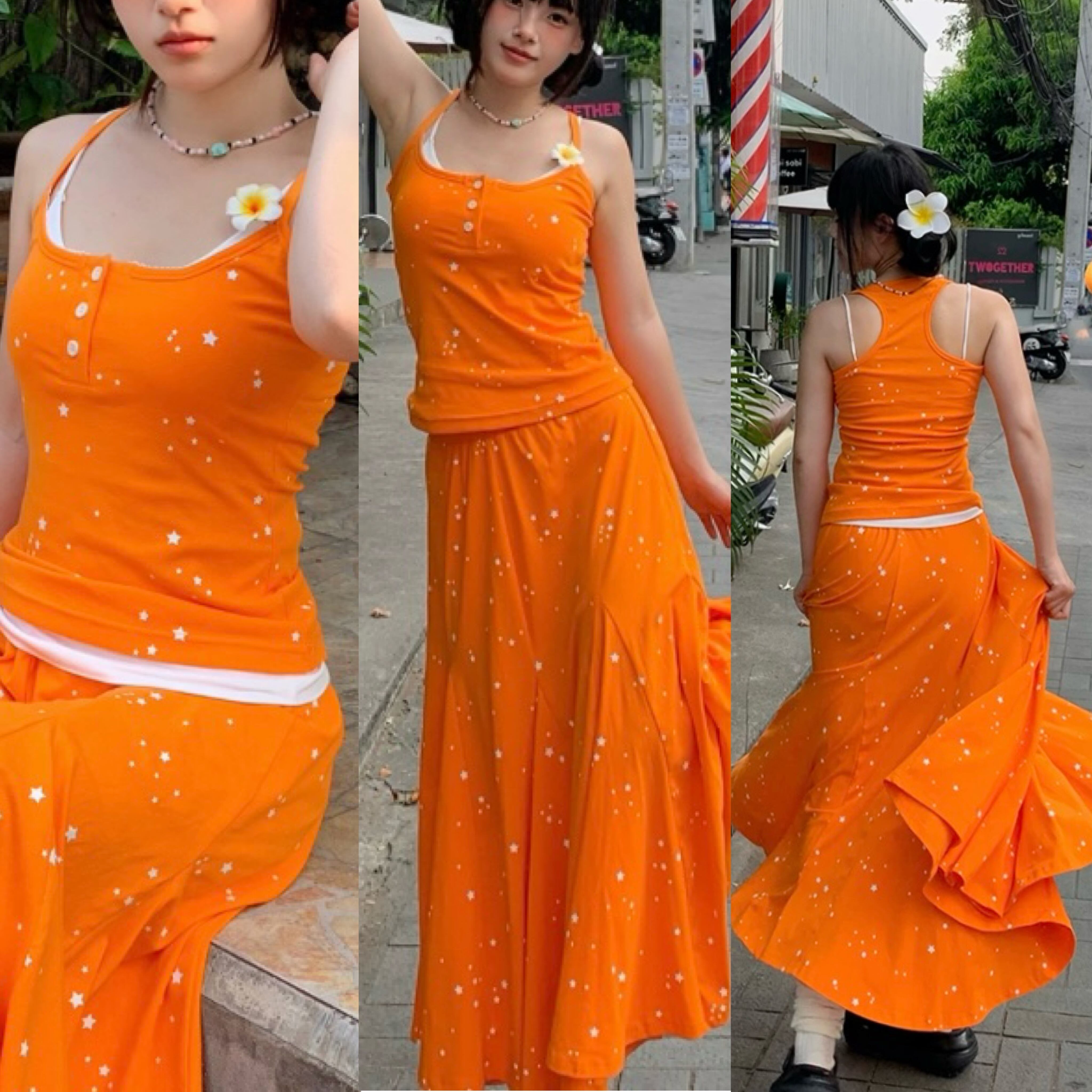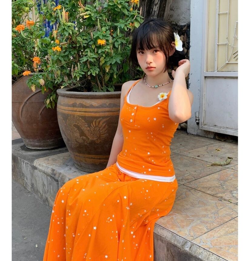 【セットアップ】オレンジ スカート フレア キャミソール ボトムス トップス ワンピース ブラウス タンクトップ 原宿 カジュアル かわい可愛い
