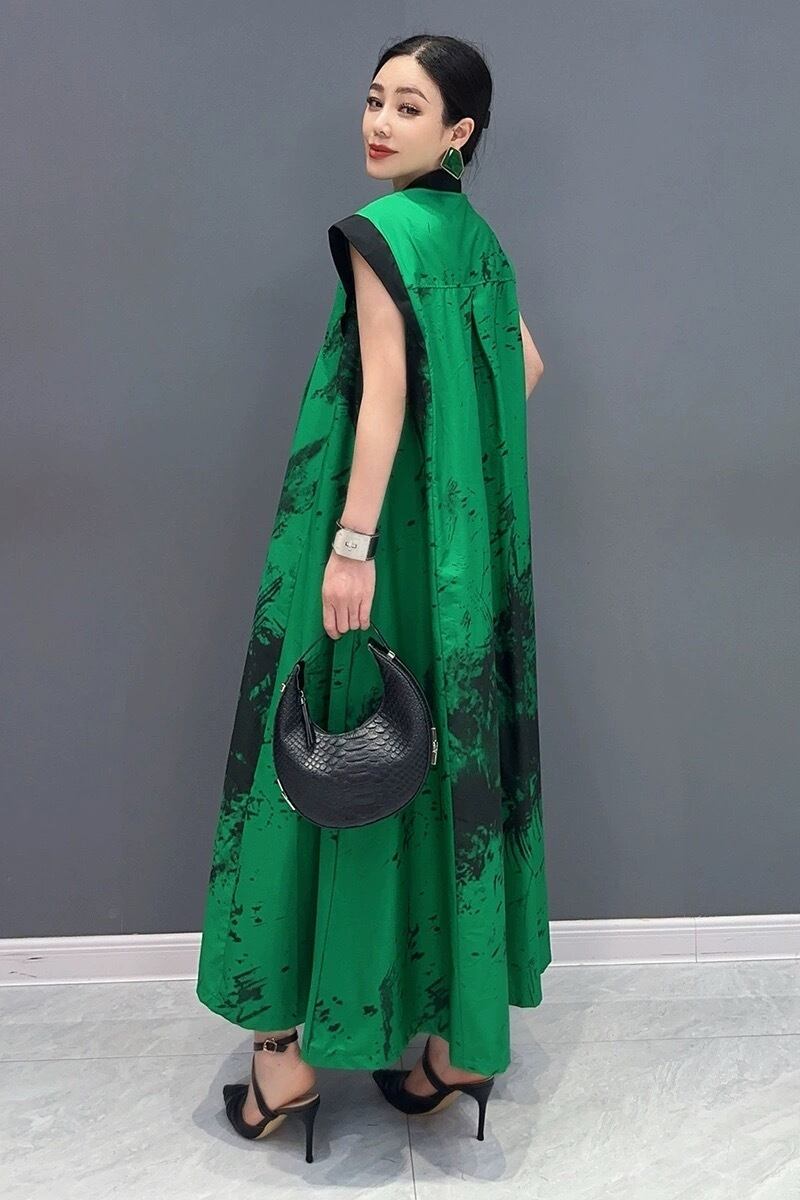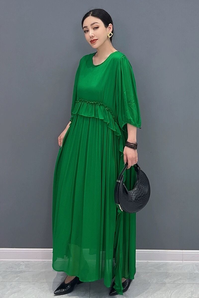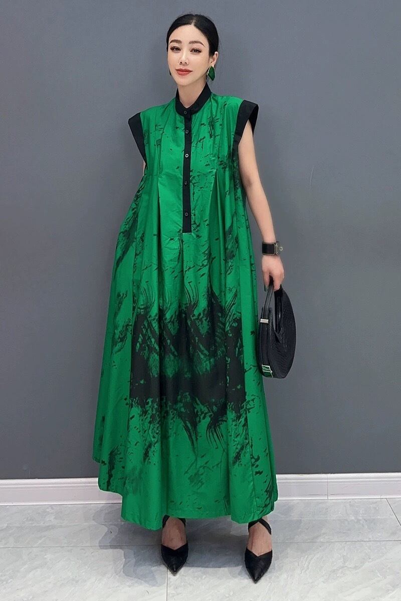 緑 黒 ワンピース カジュアル シンプル マキシ ロング