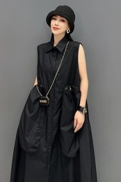 ノースリーブ ゆったり 黒 ベージュ グリーン ワンピース ブラウス ストリート ポケット