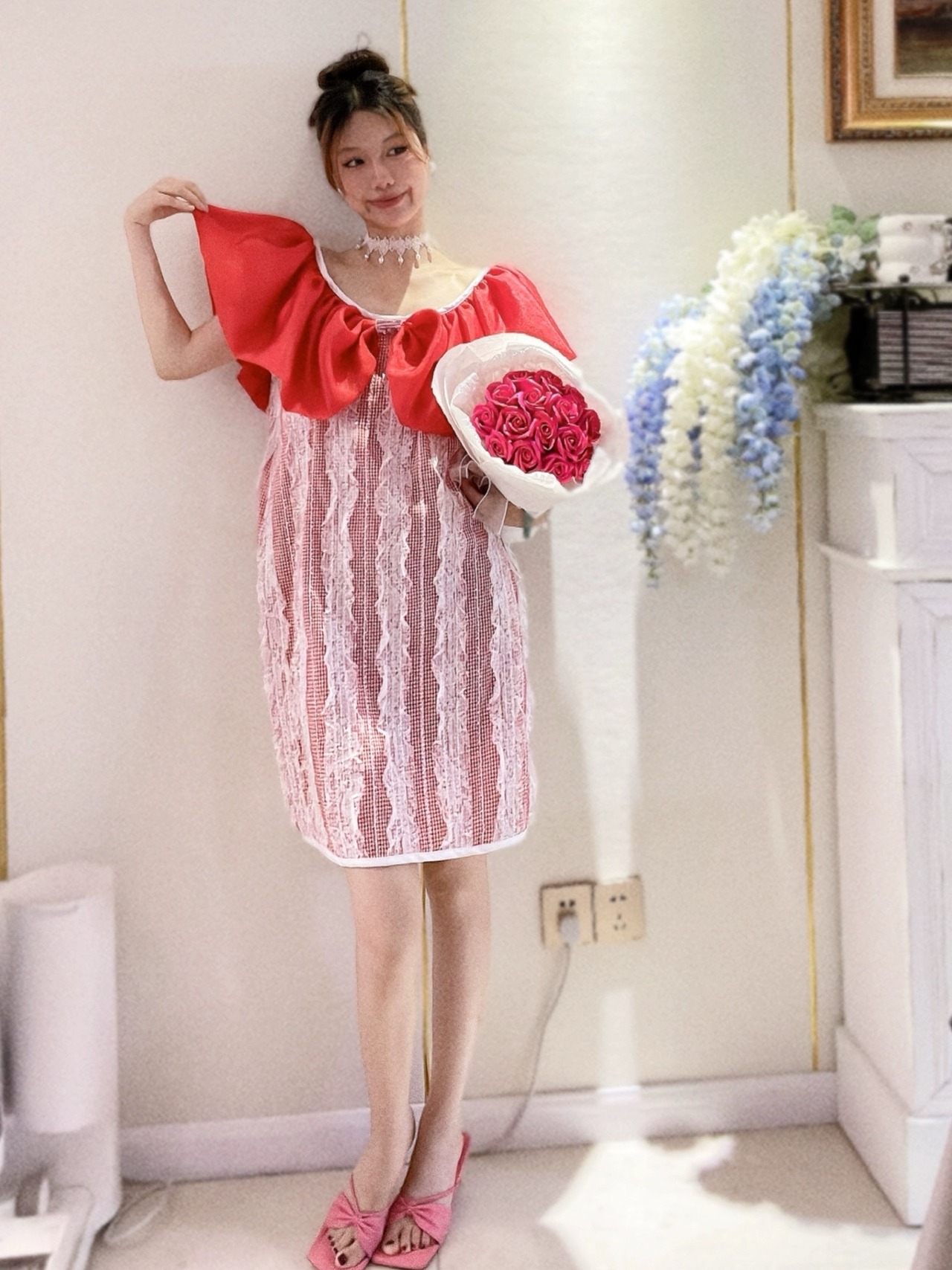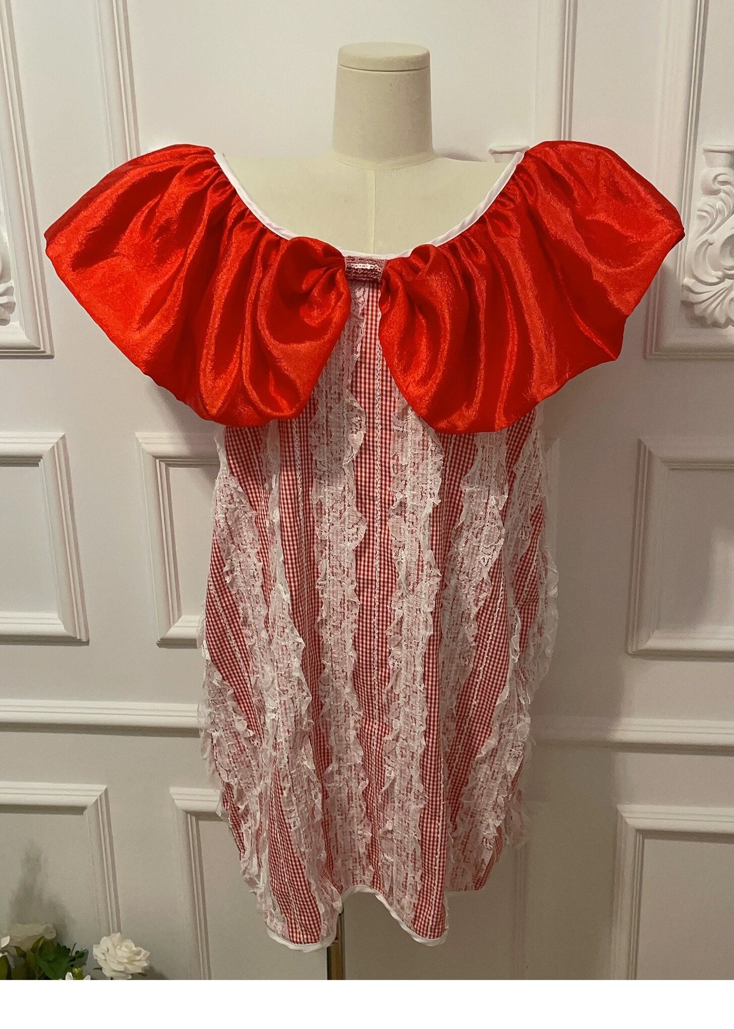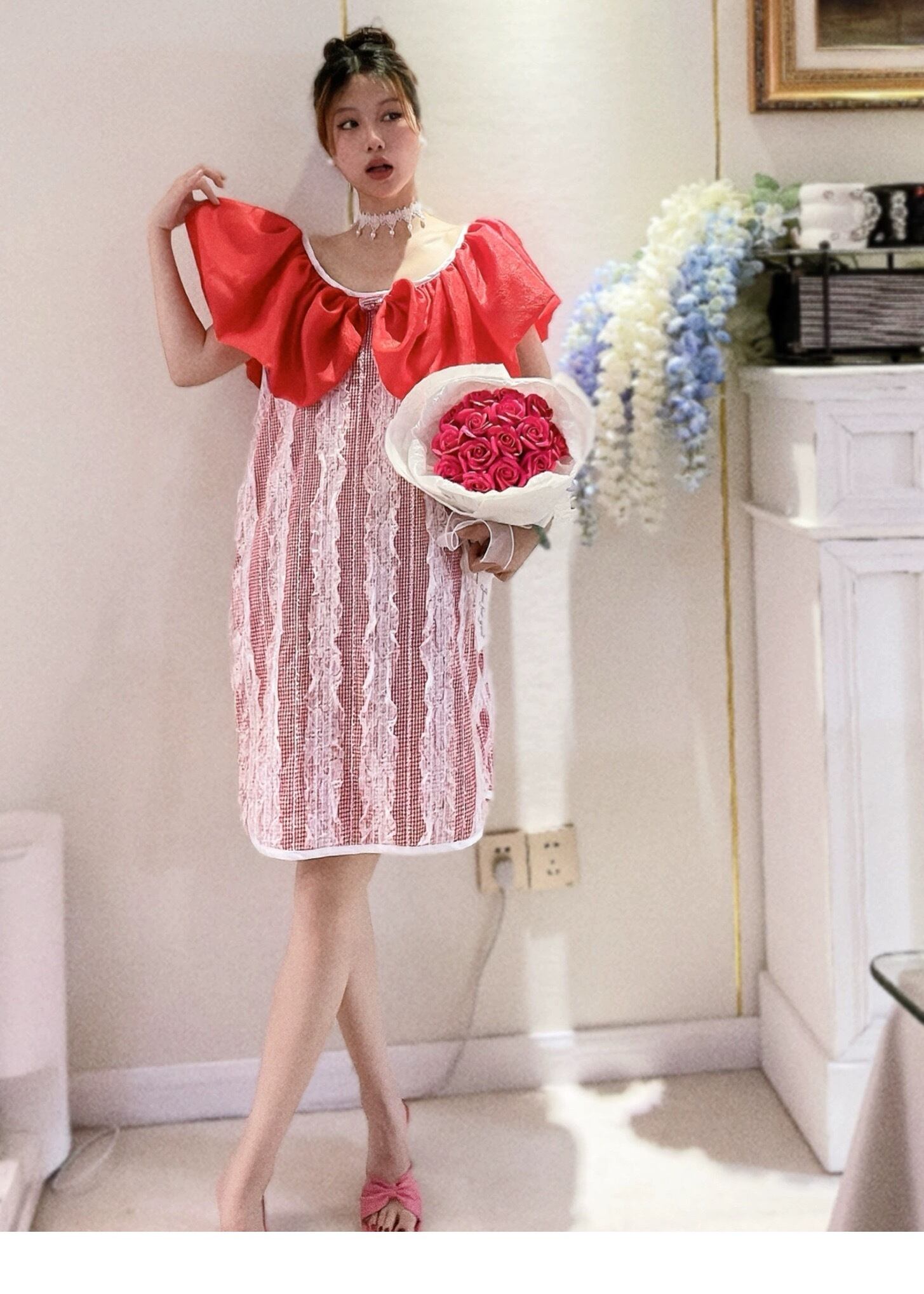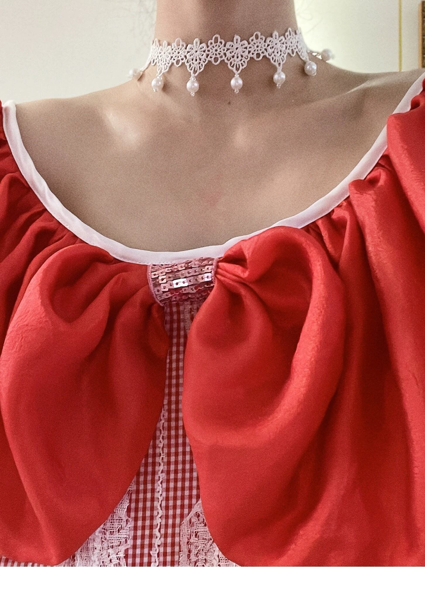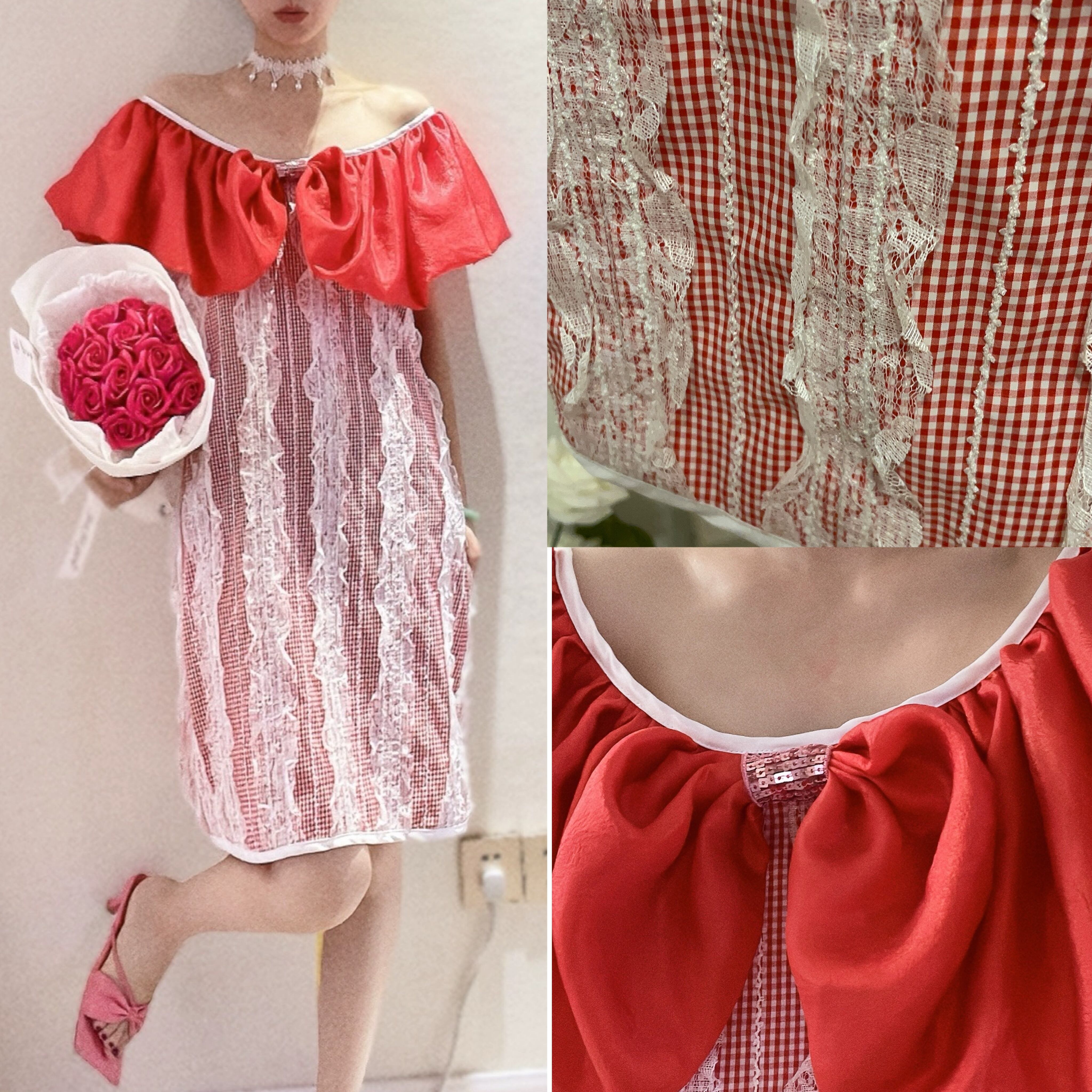 赤 チェック ピンク リボン ワンピース ガーリー かわいい