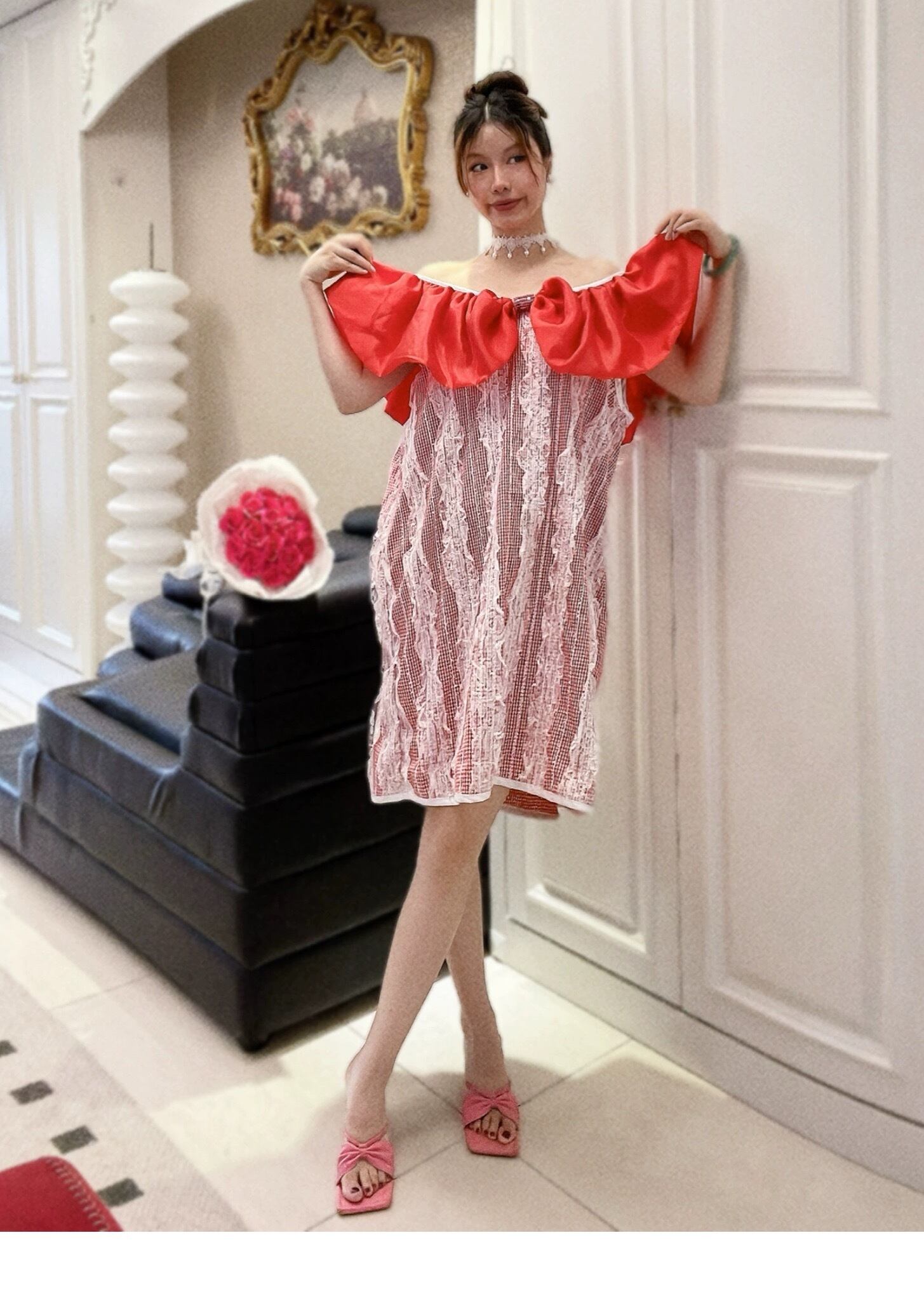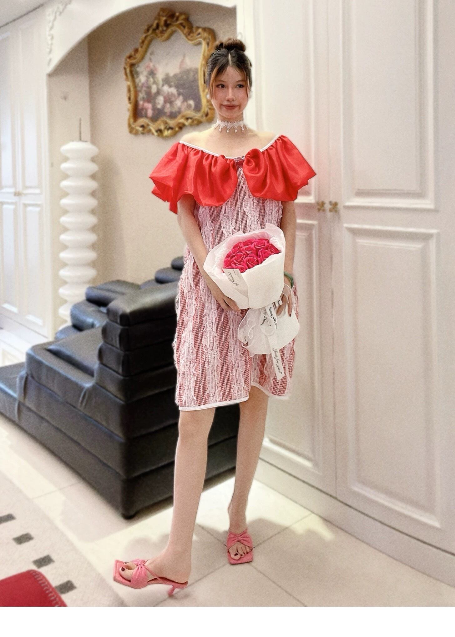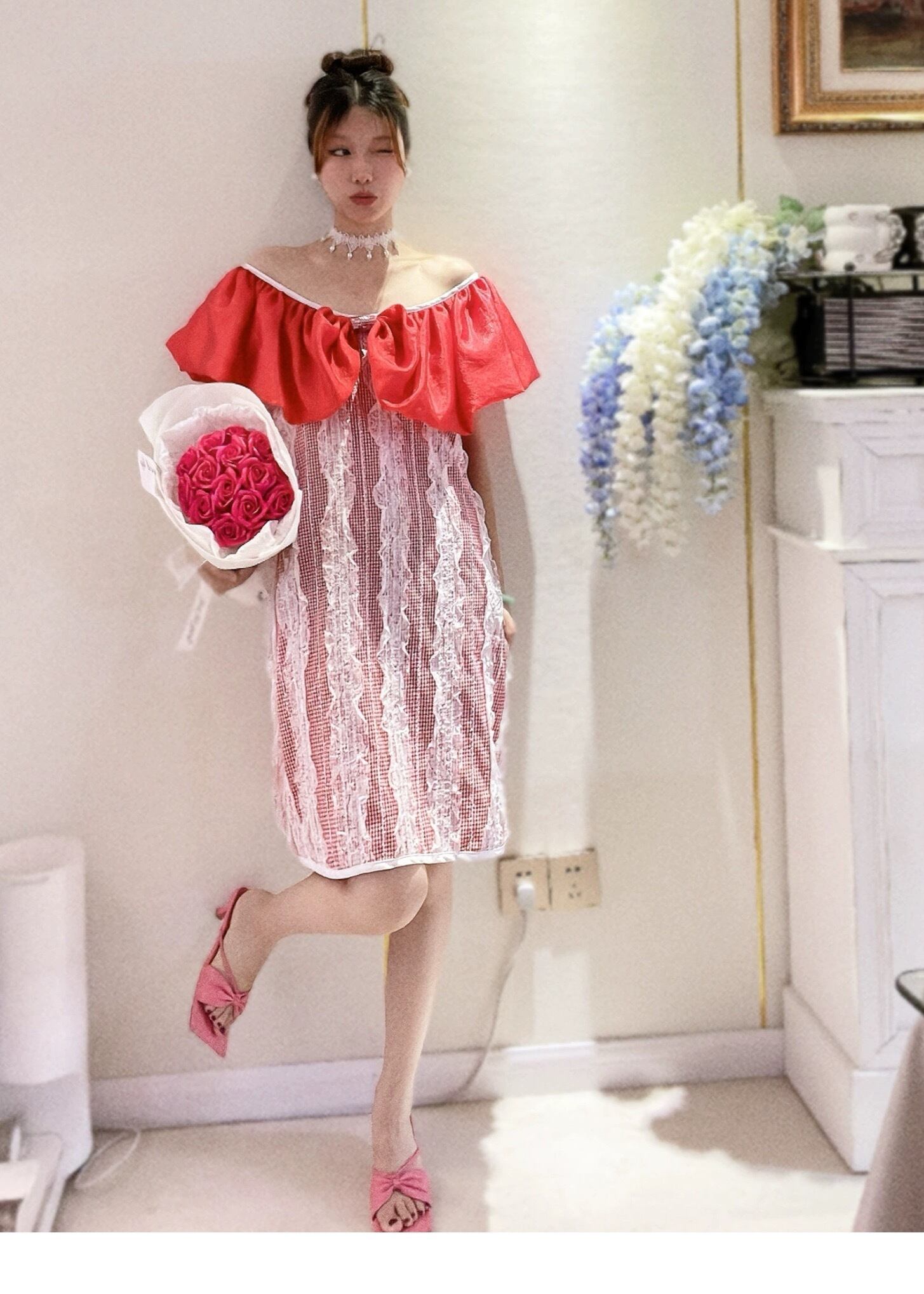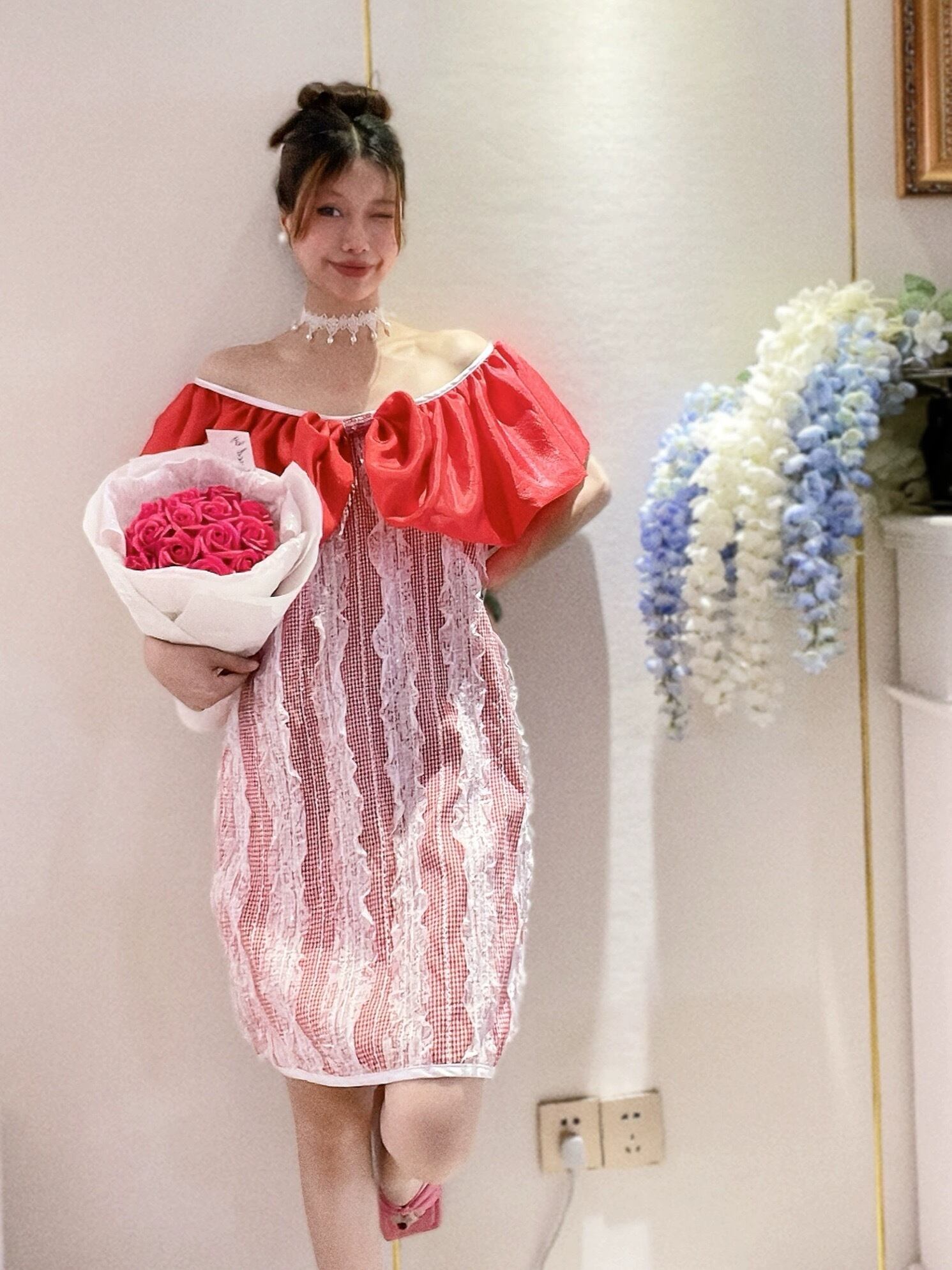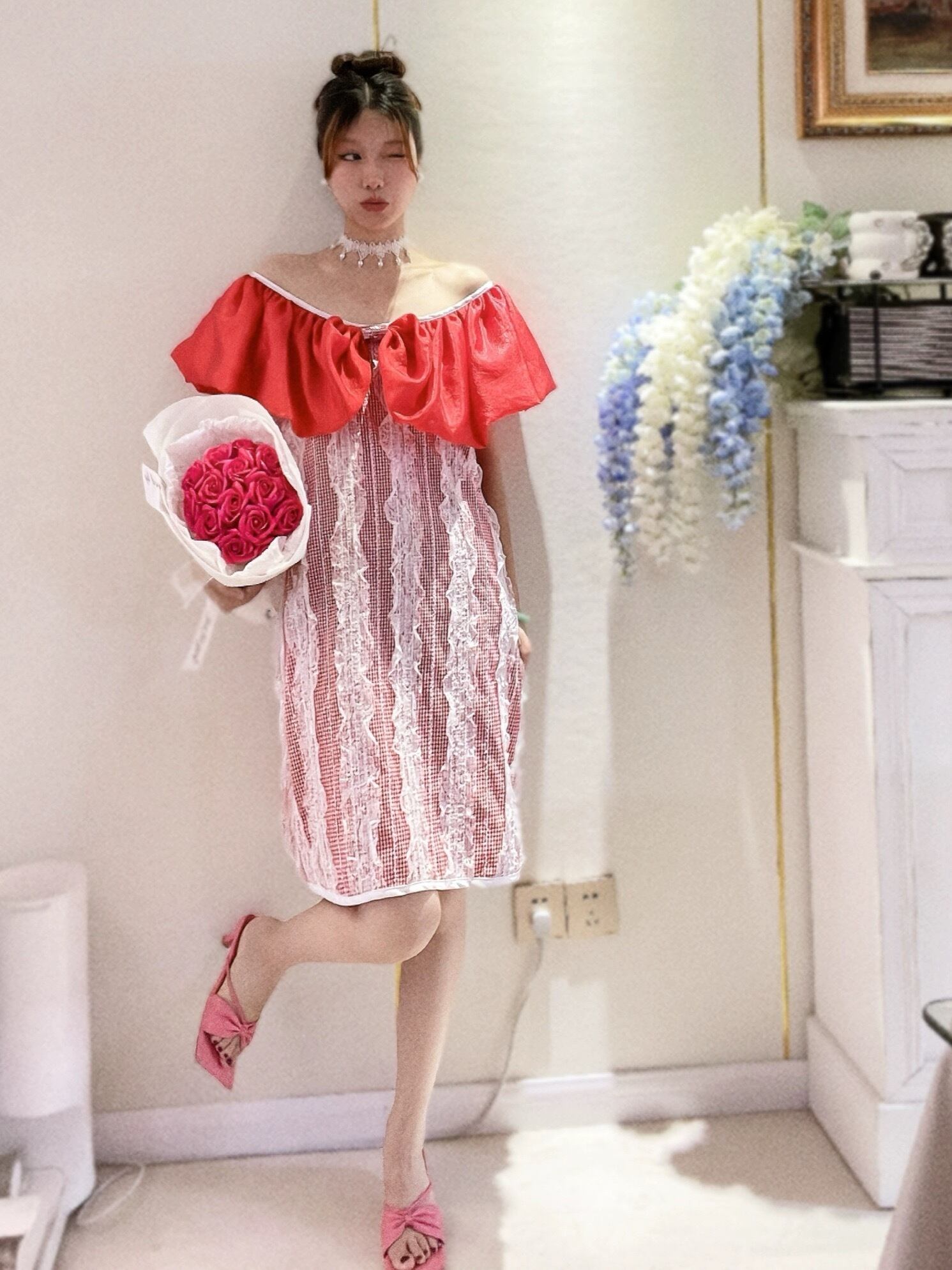赤 チェック ピンク リボン ワンピース ガーリー かわいい