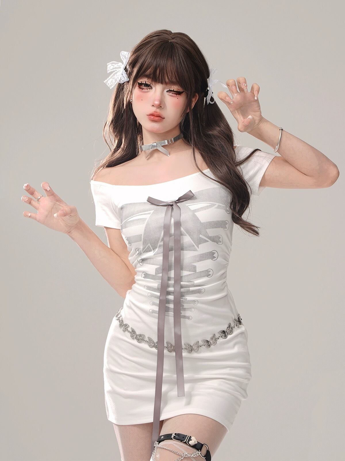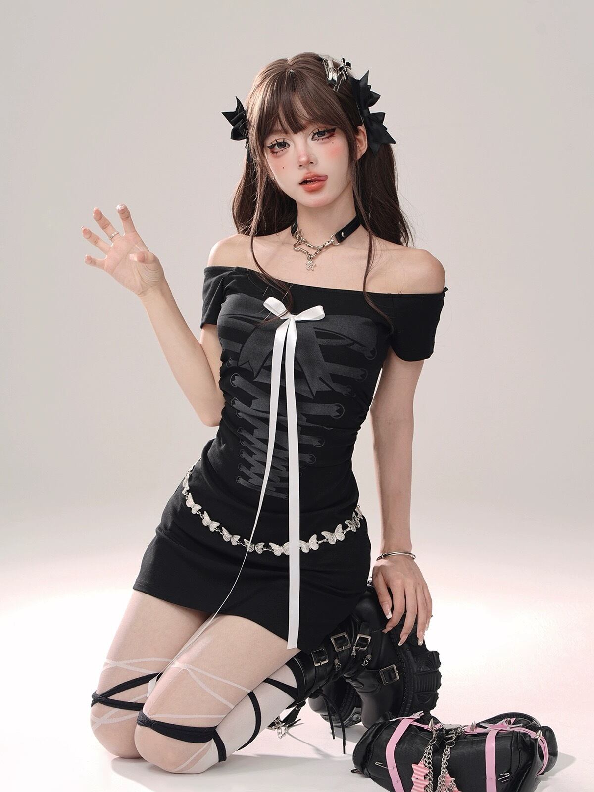 黒 白 カジュアル リボン オフショルダー だましえ ガーリー