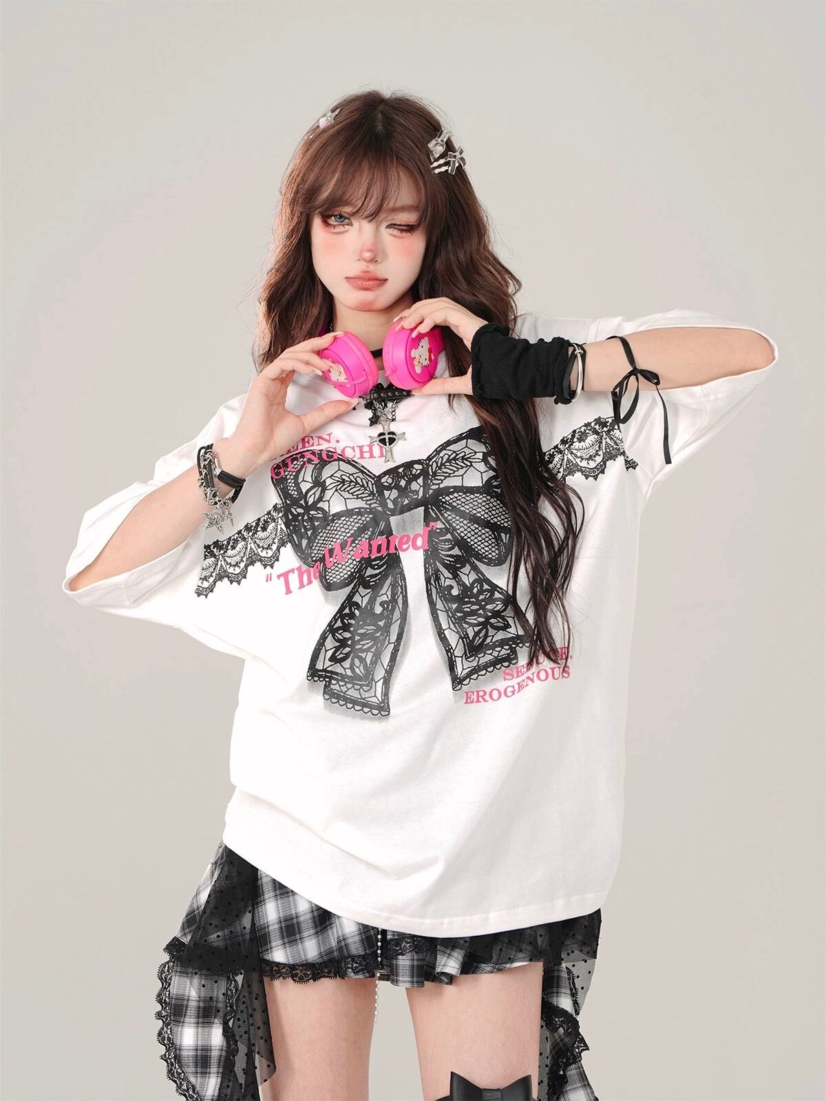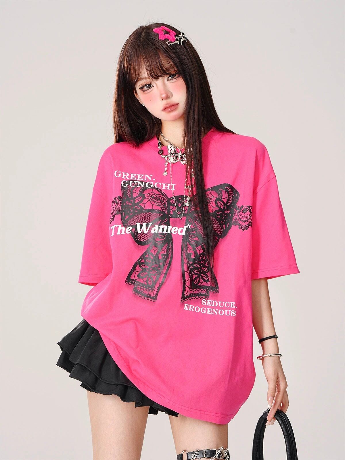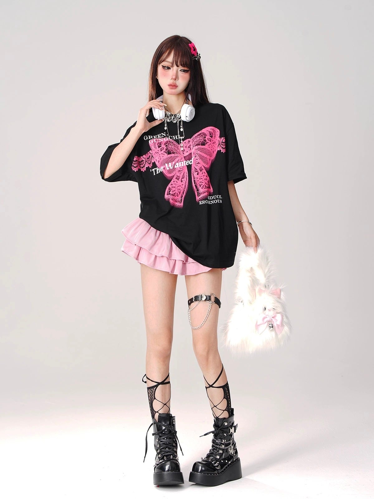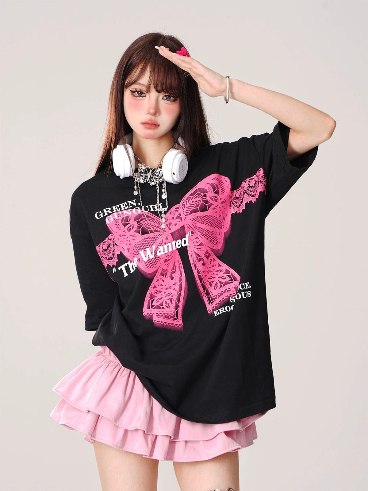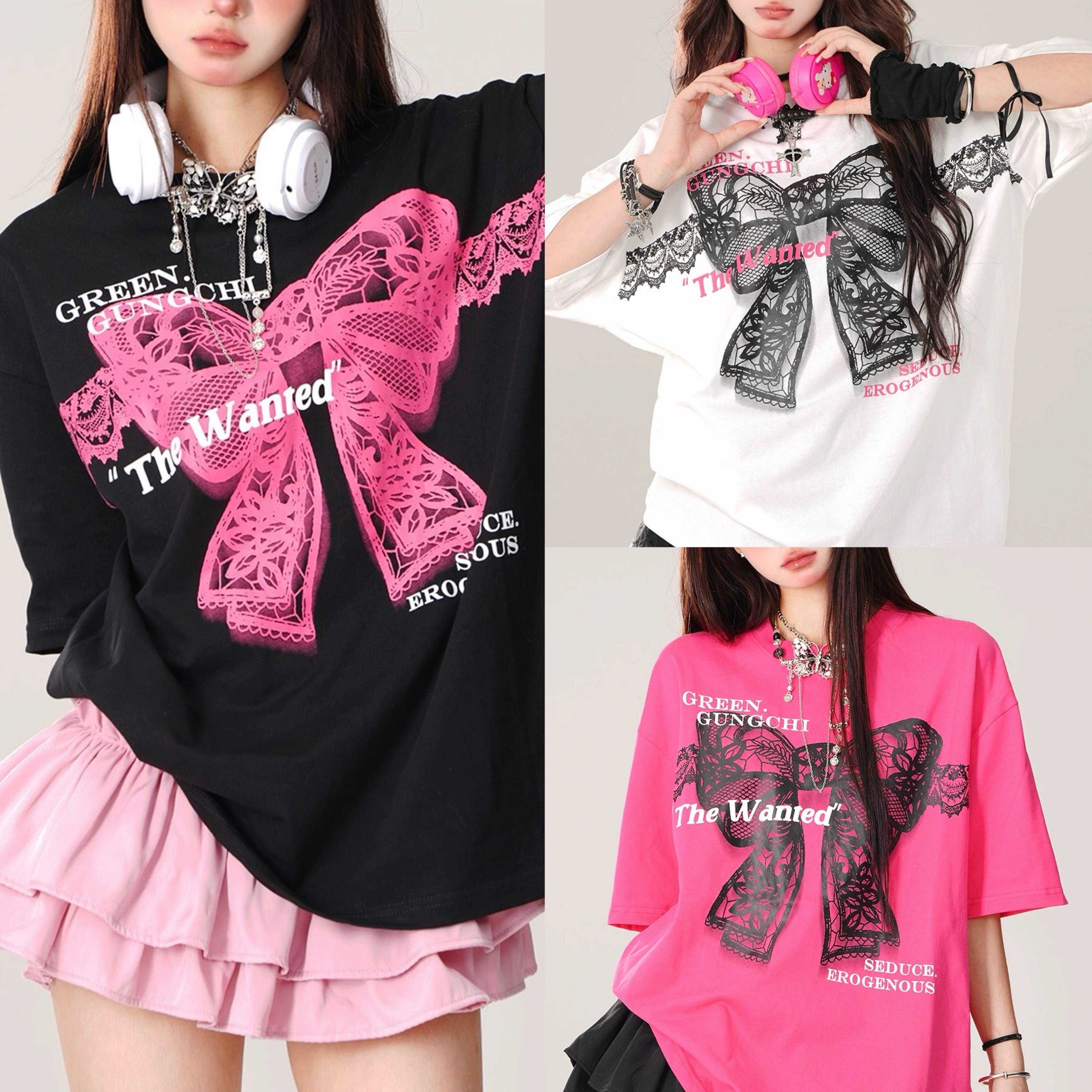 Tシャツ 黒 リボン カジュアル トップス ピンク 白 XL