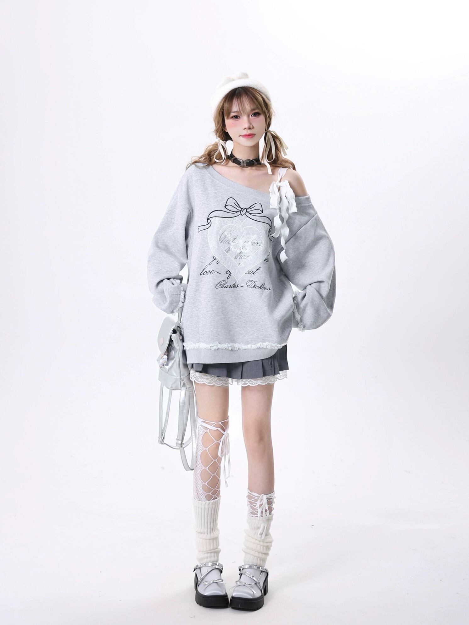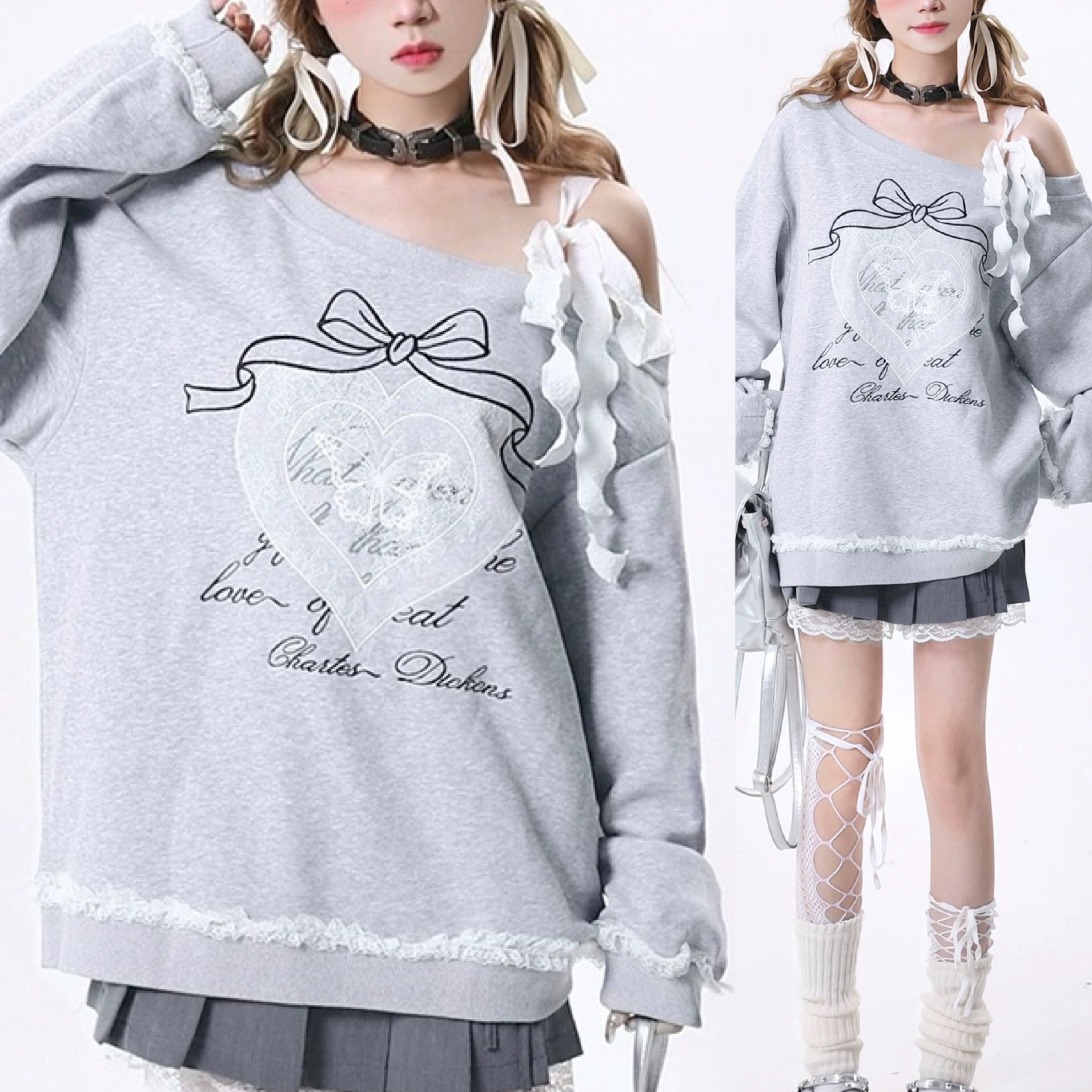 オフショルダー グレー パーカー トップス カジュアル リボン