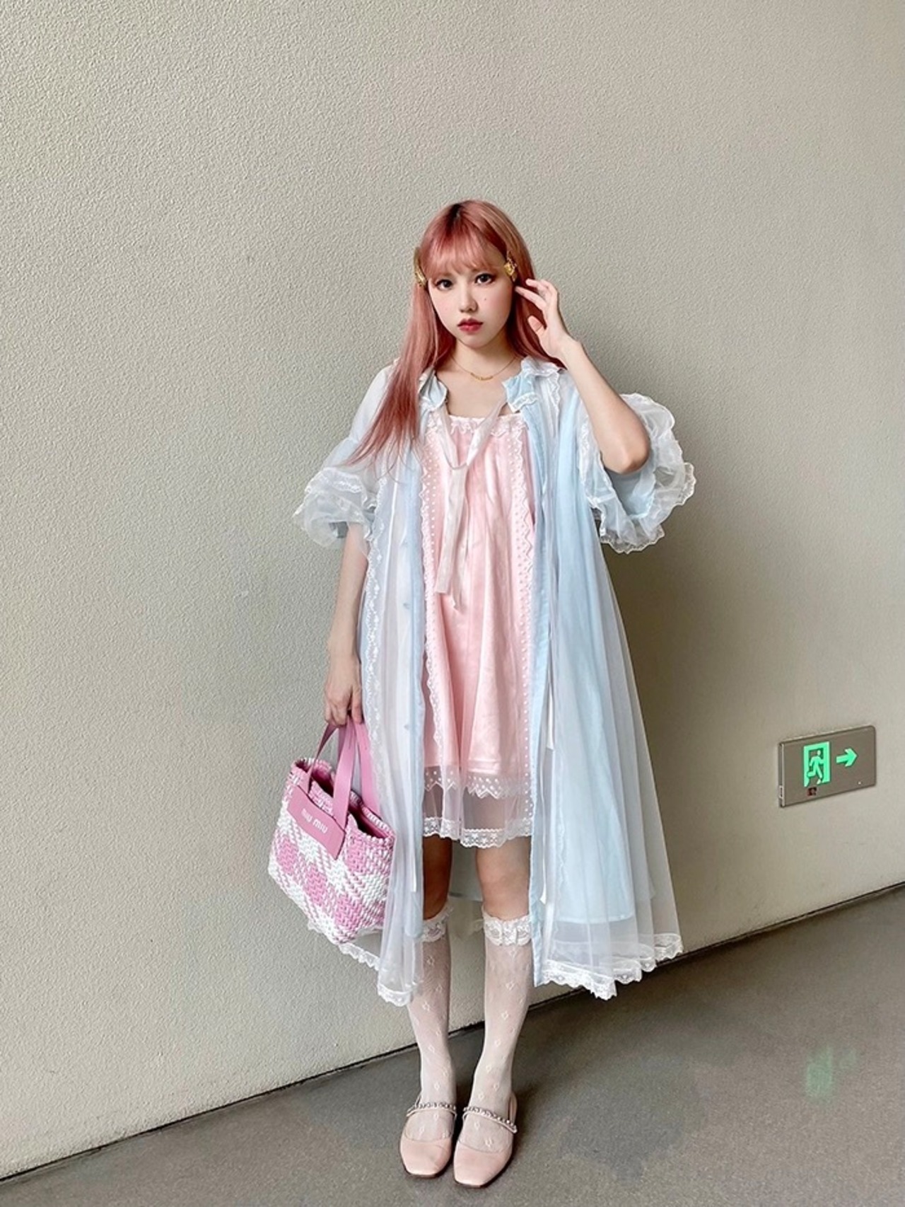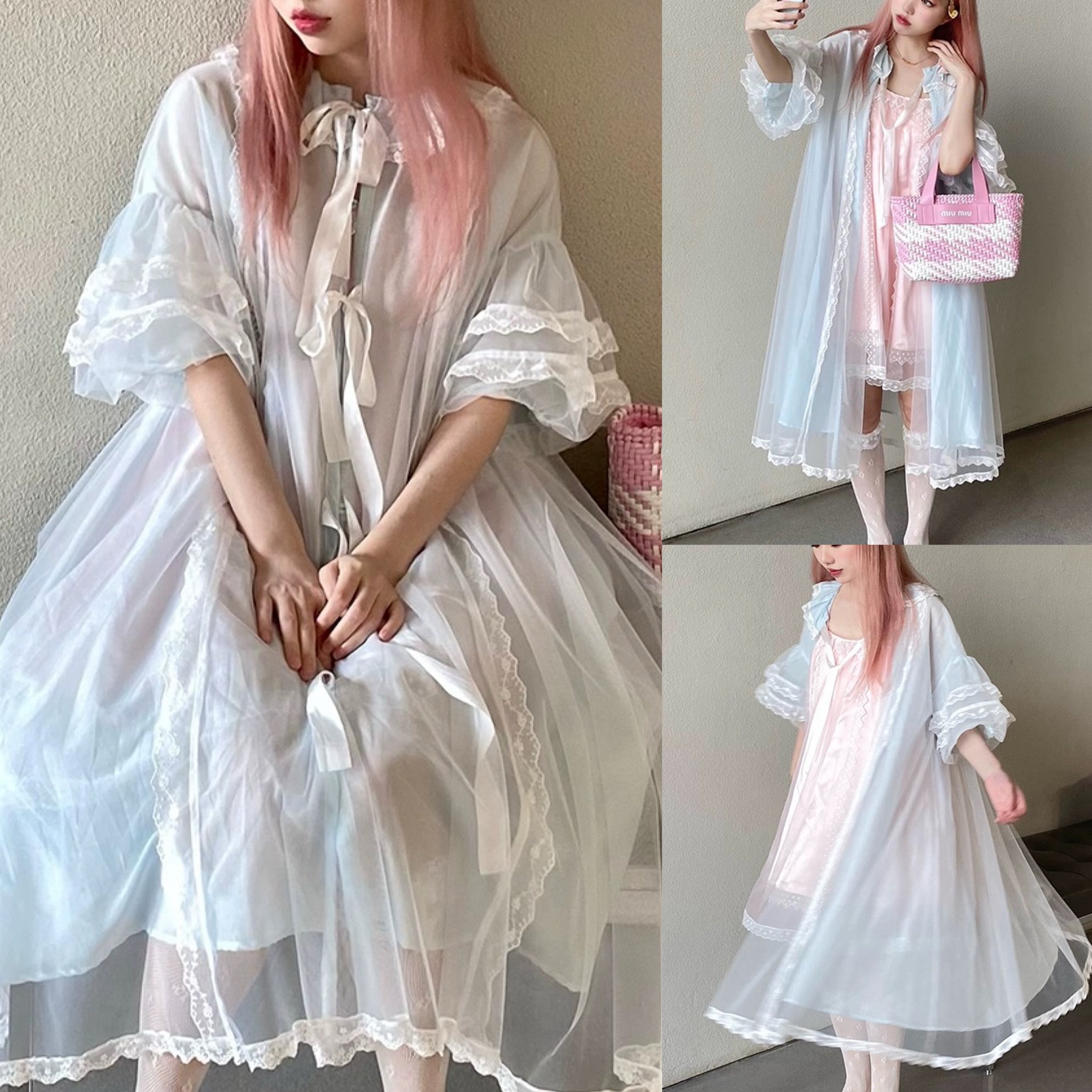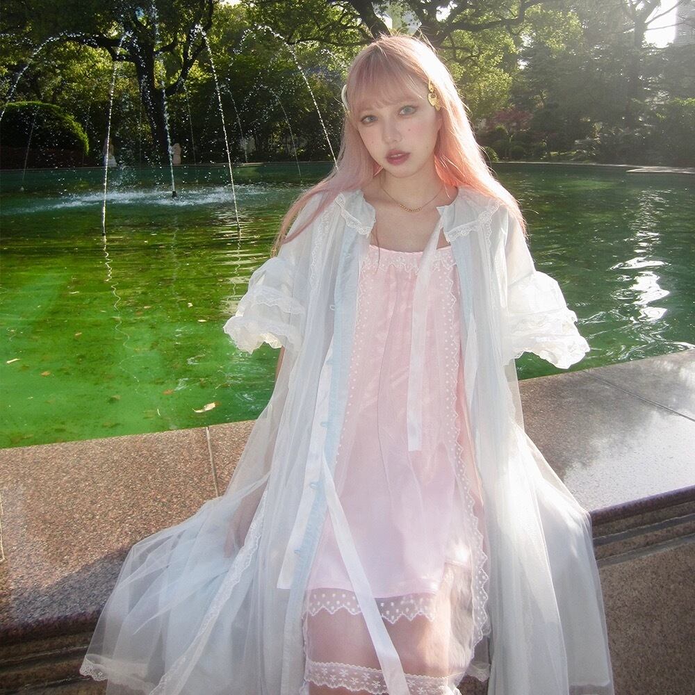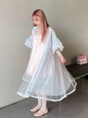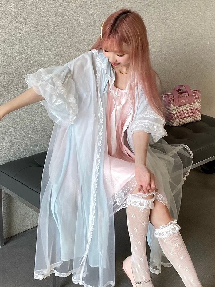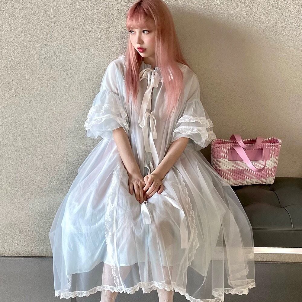 マキシ 水色 リボン ワンピース ガーリー カーディガン ゆったり シースルー