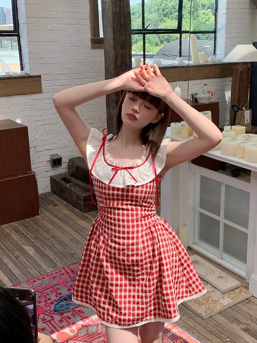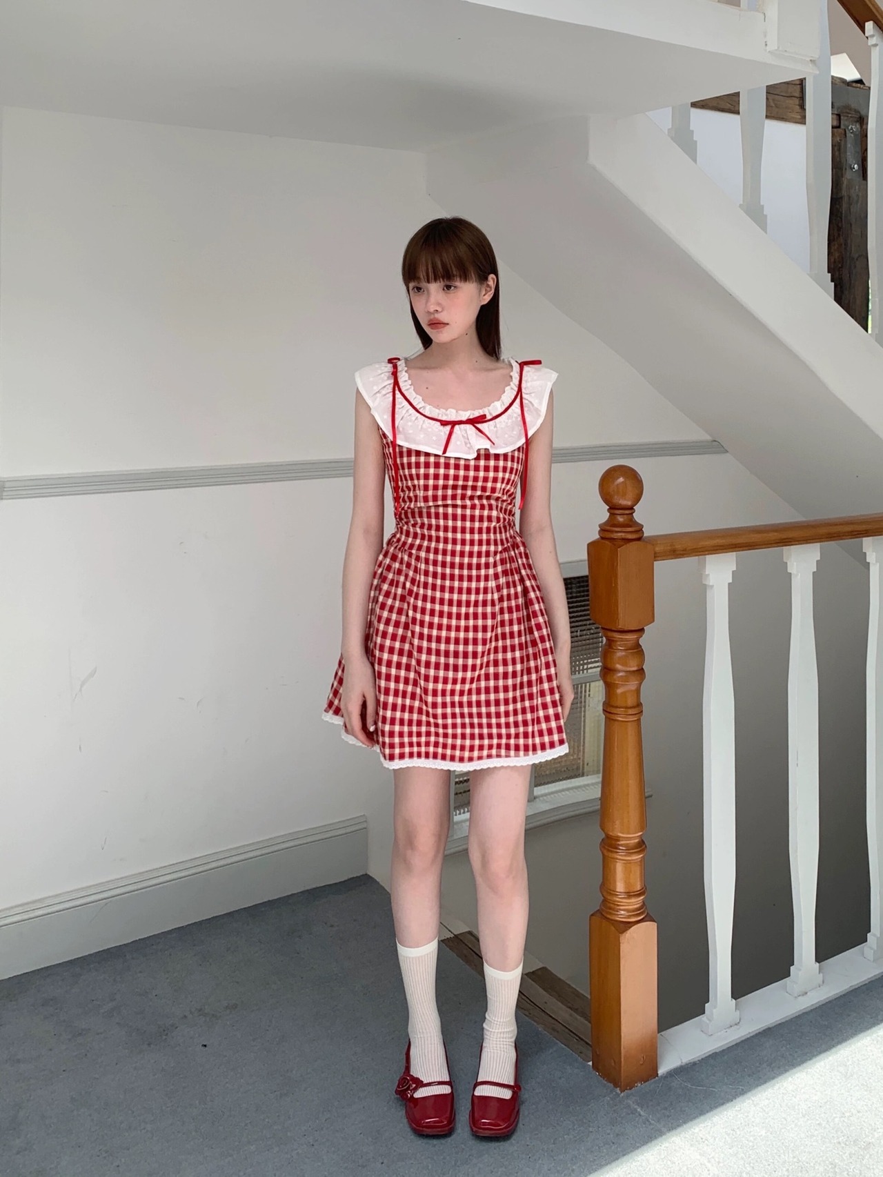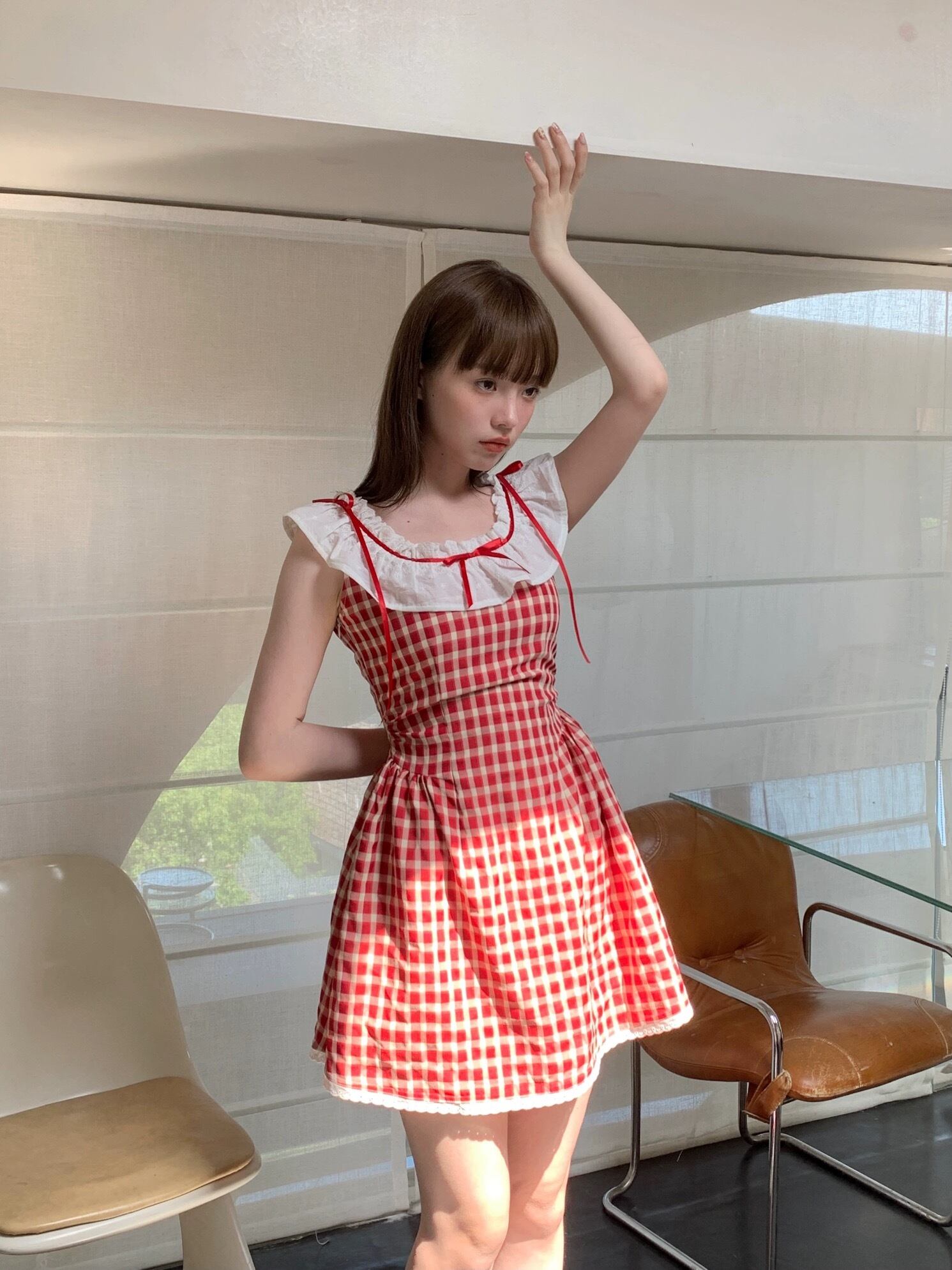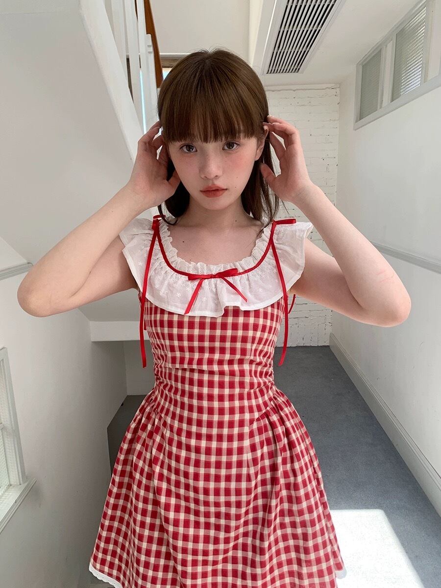白 ガーリー 赤 チェック リボン 丸襟 ガーリー ベージュ ワンピース ブラウス
