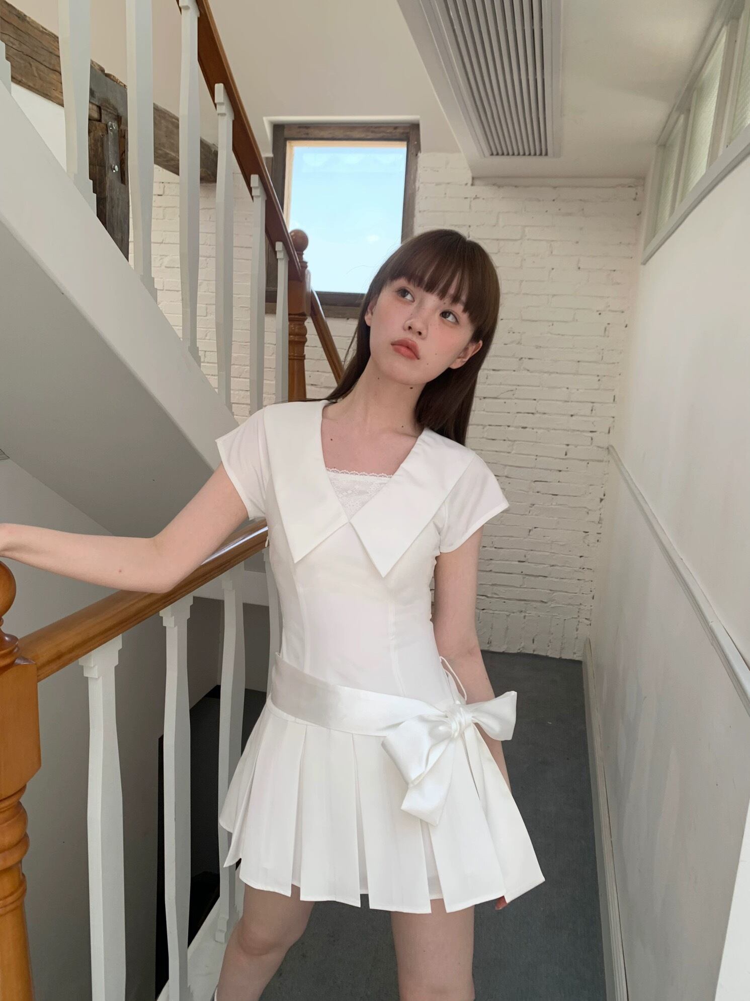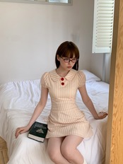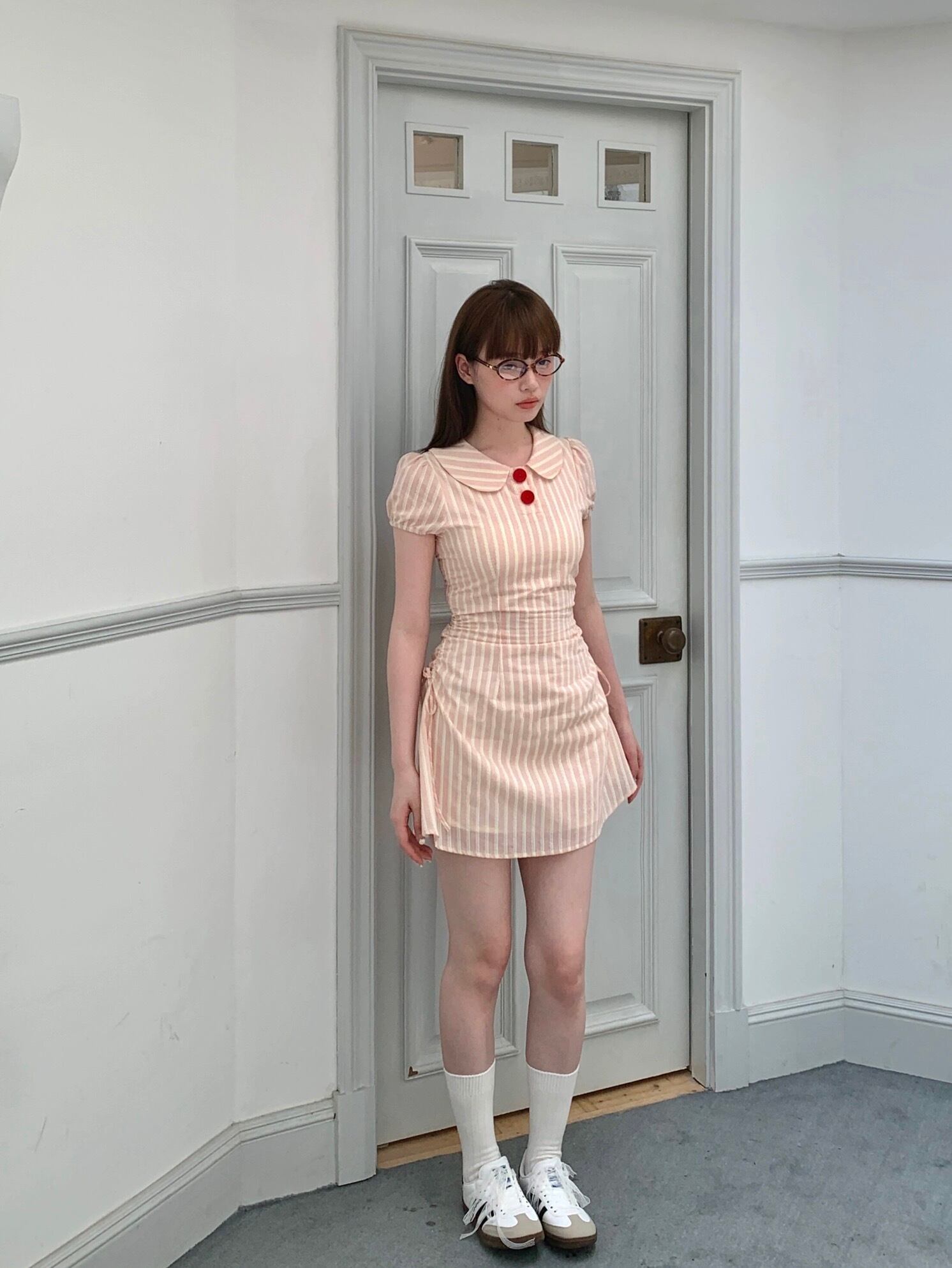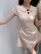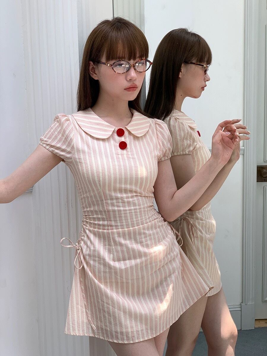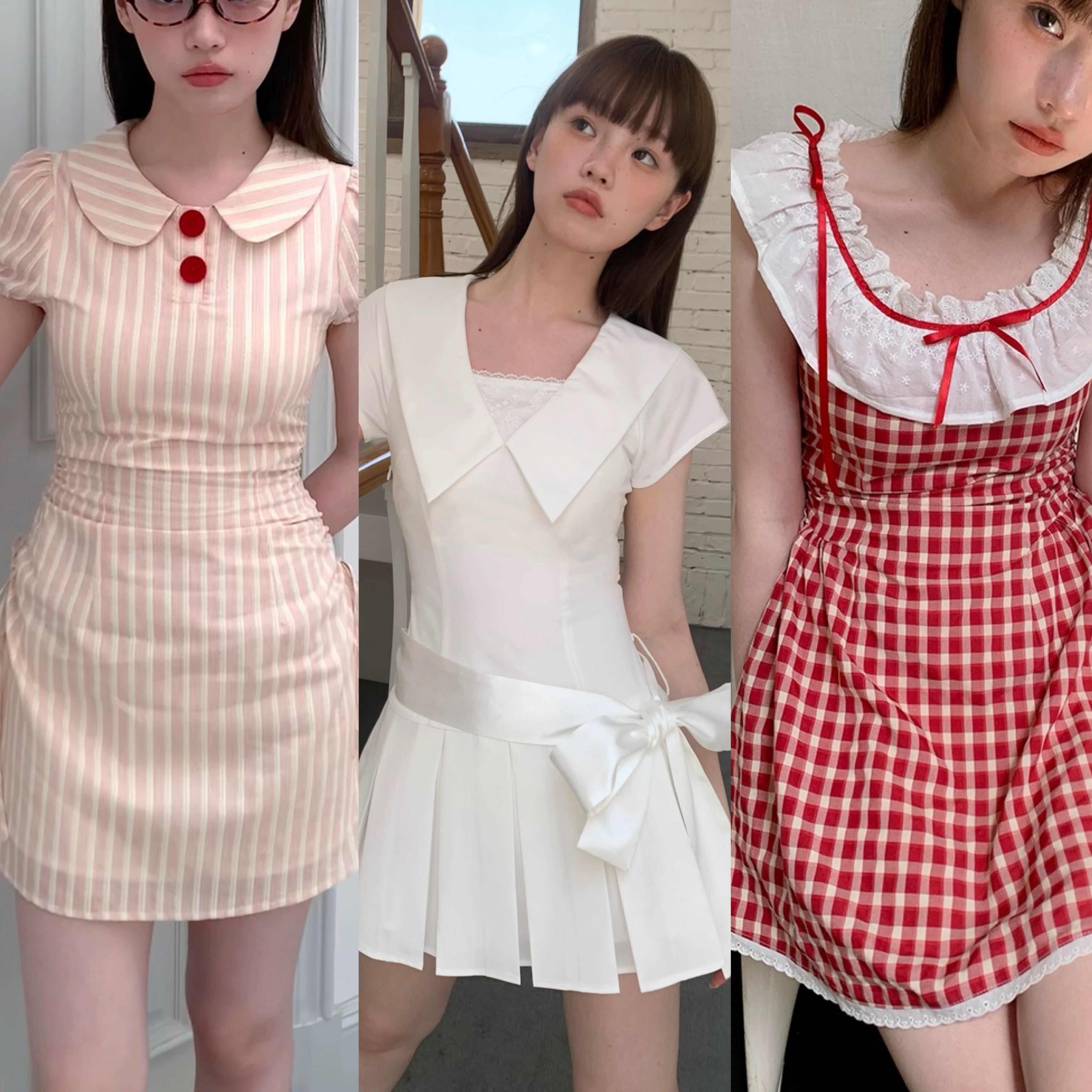 白 ガーリー 赤 チェック リボン 丸襟 ガーリー ベージュ ワンピース ブラウス