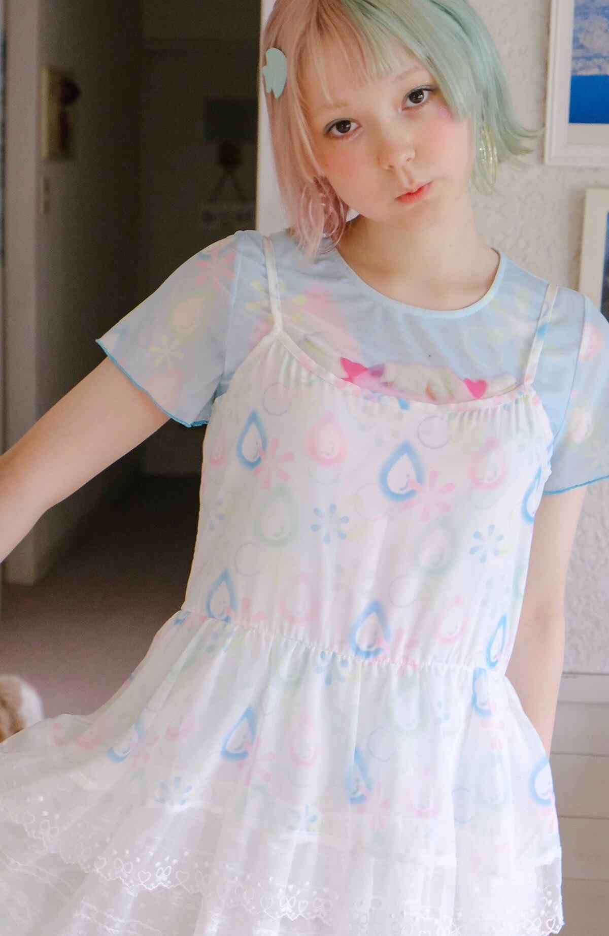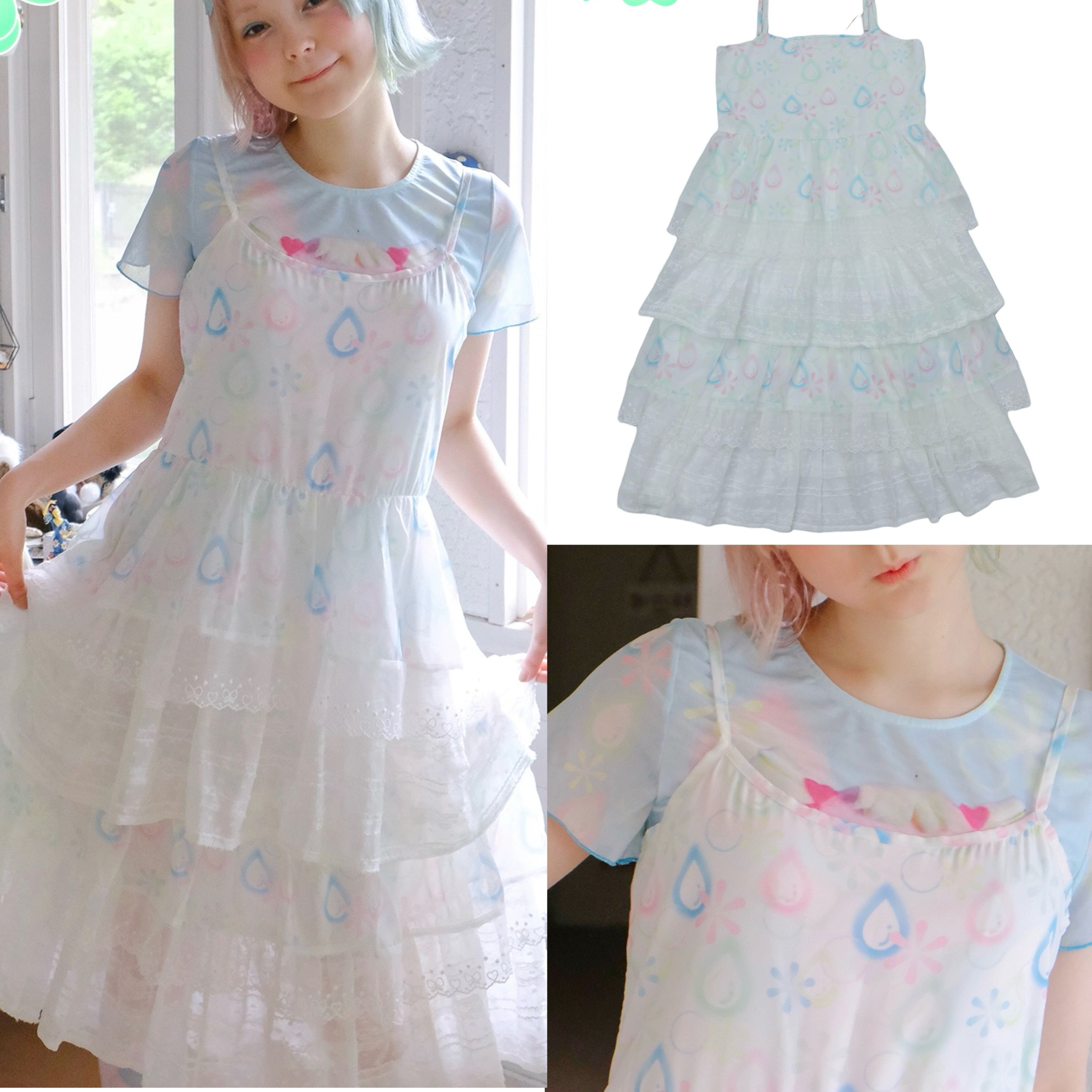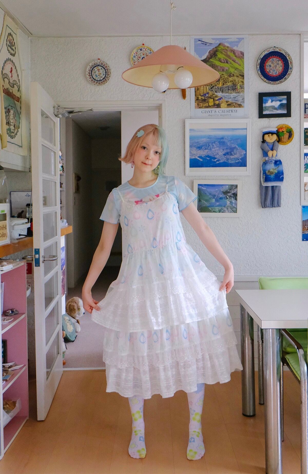 白 爽やか カジュアル ピンク 水色 ガーリー ワンピース