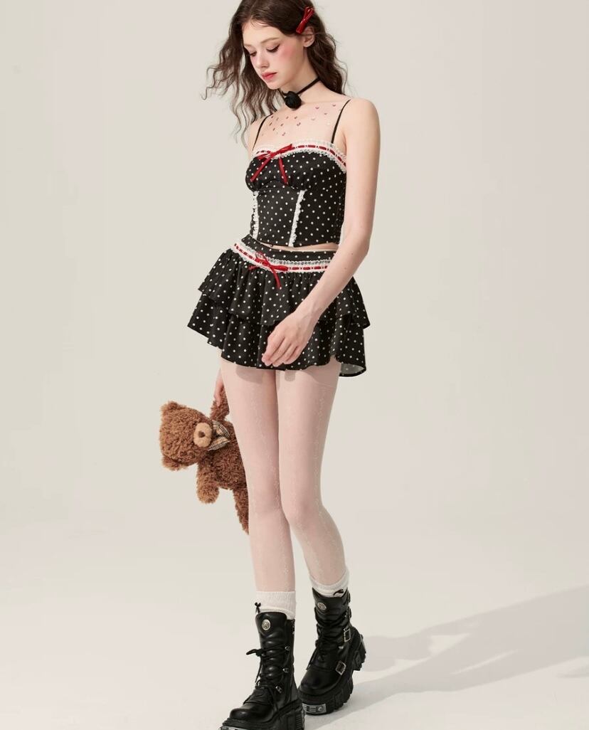 【キャミソール】黒 ピンク ブラウス リボン 水玉 ドット ブラウス 水色