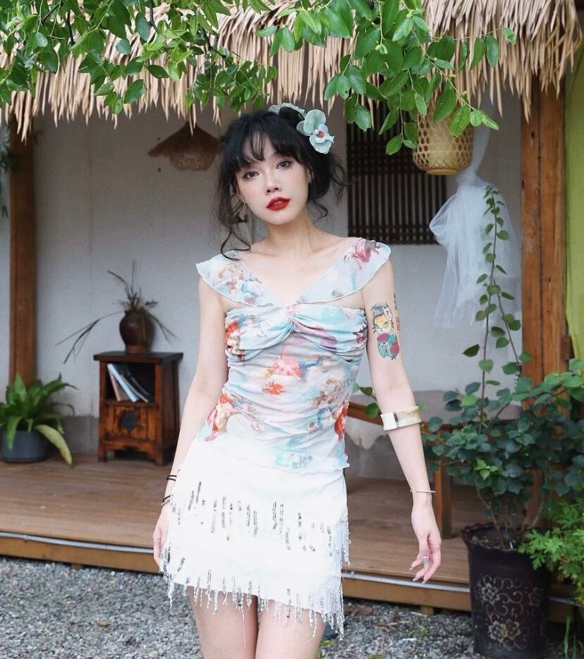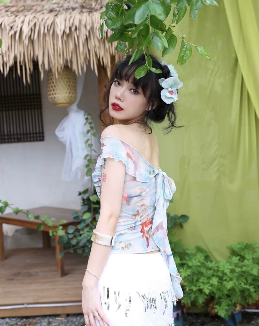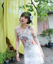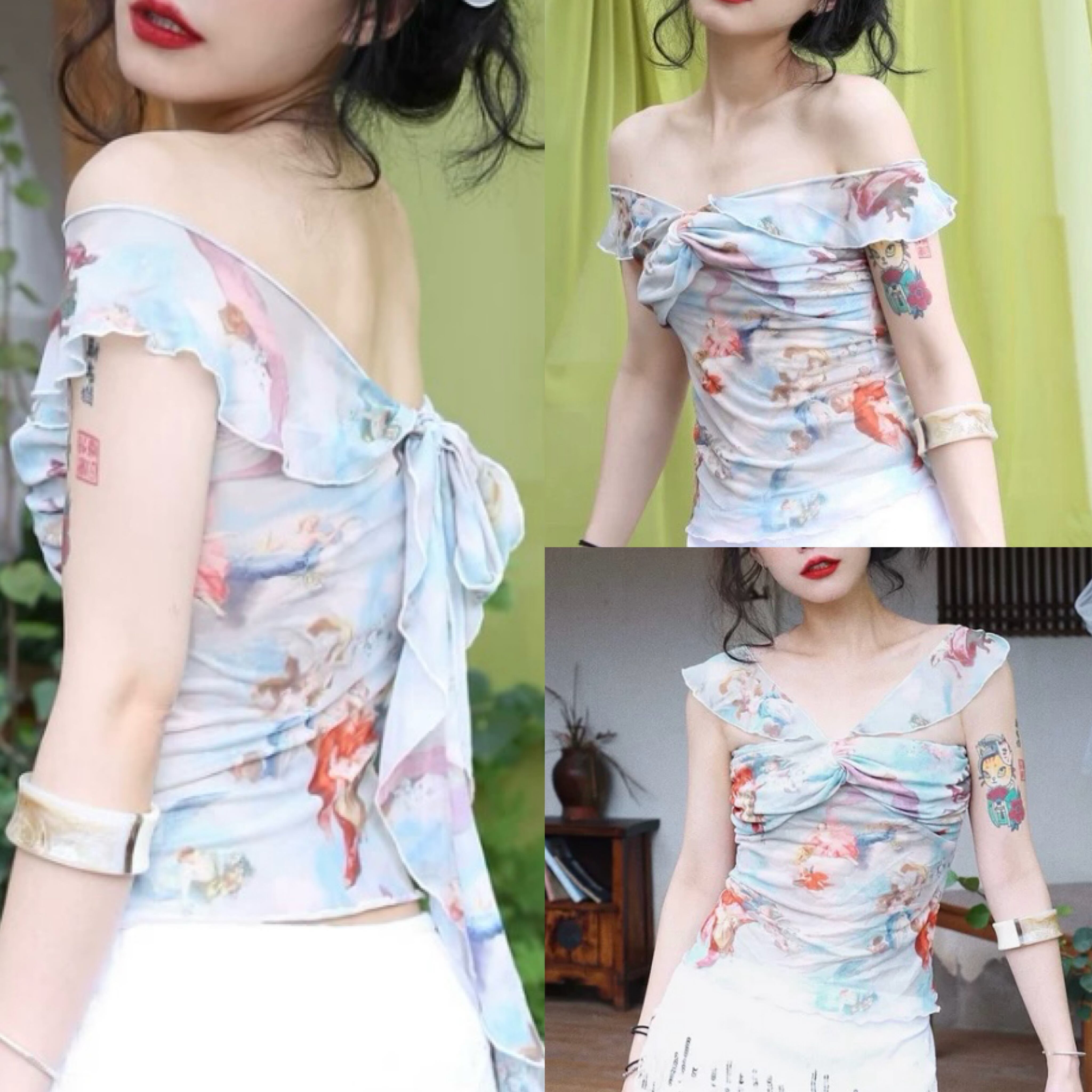 花柄 アジアン キャミソール ブラウス 水色 オフショルダー