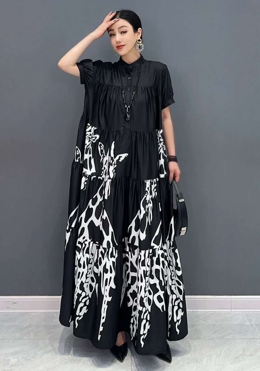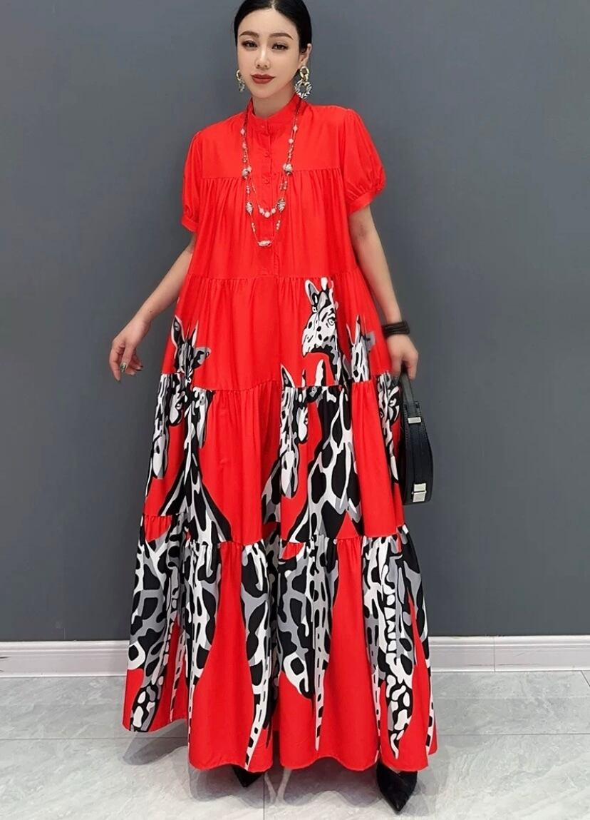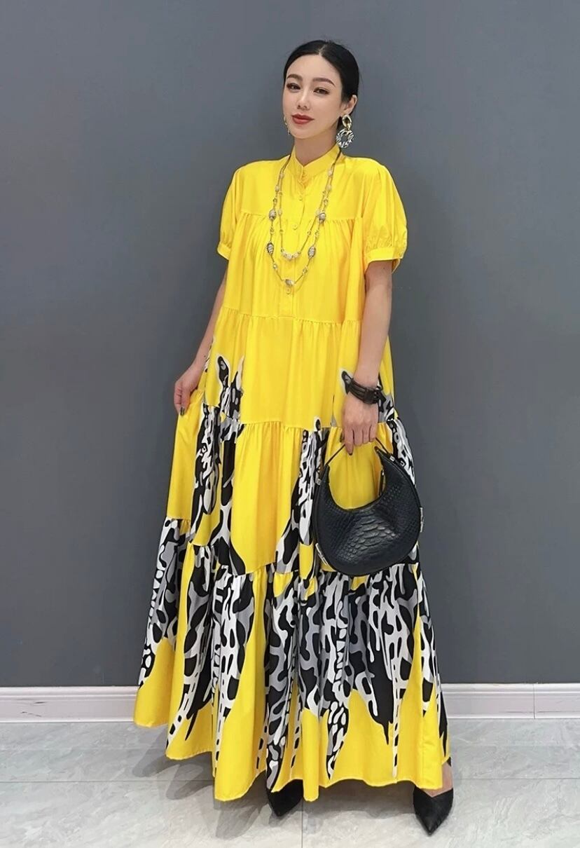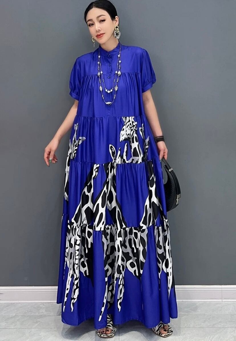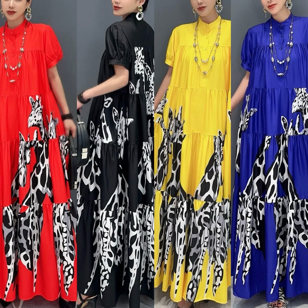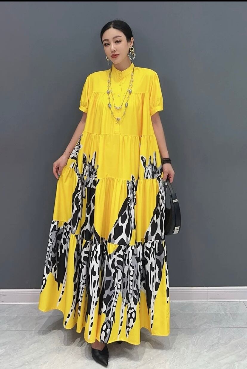 黄色 黒 赤 青 ブラウス マキシ ワンピース キリン アニマル XL