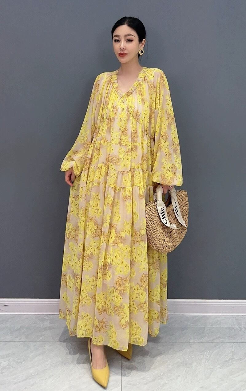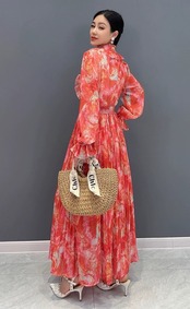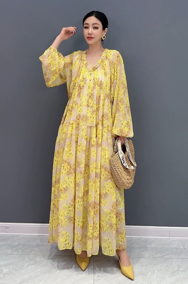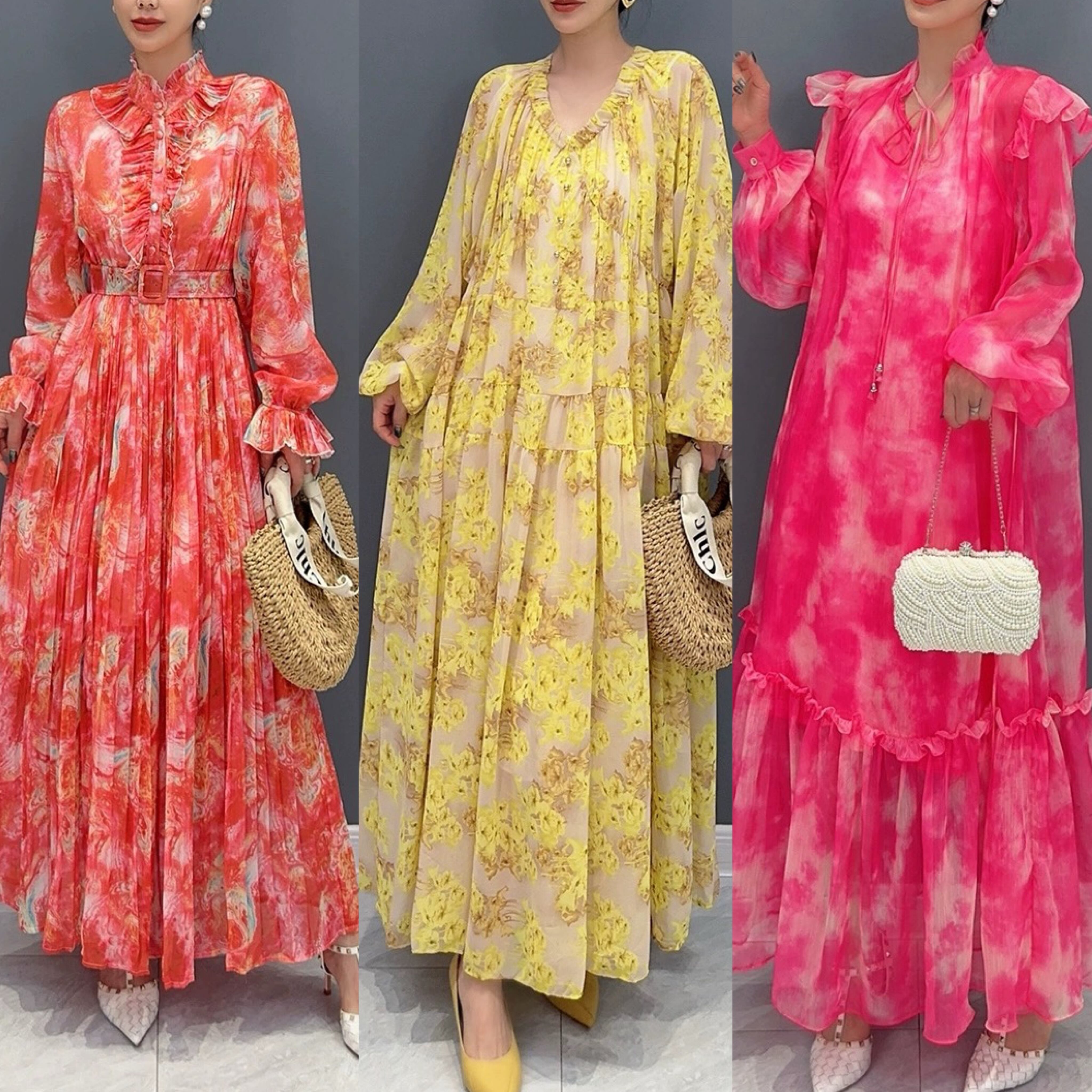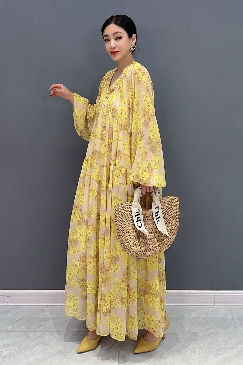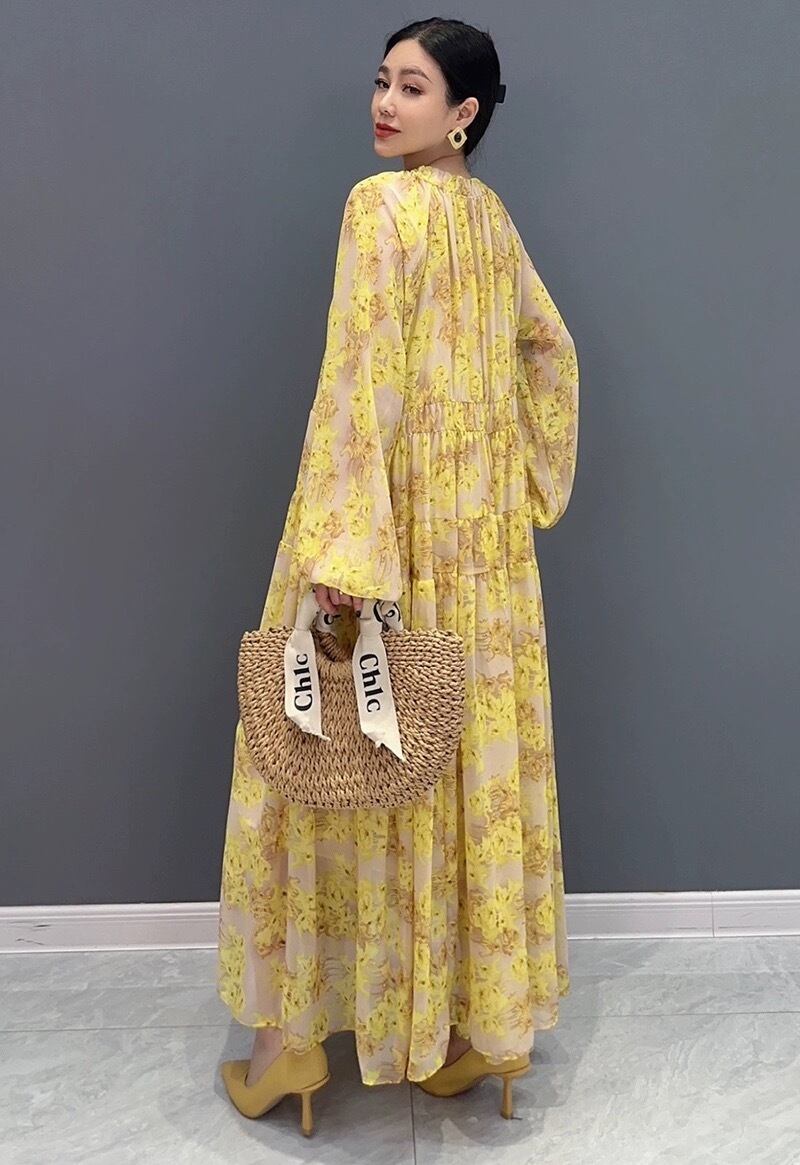 オレンジ 黄色 花柄 フラワー マキシ ゆったり ワンピース 赤