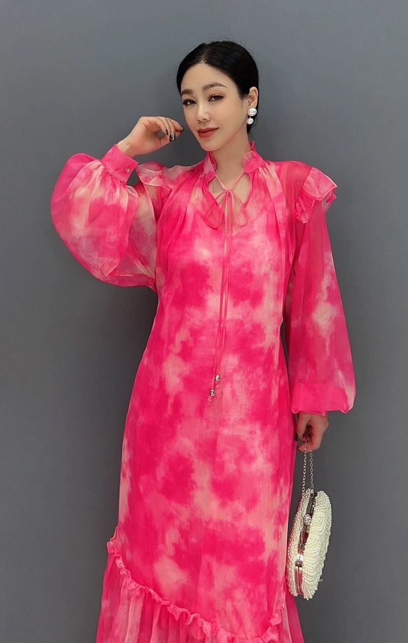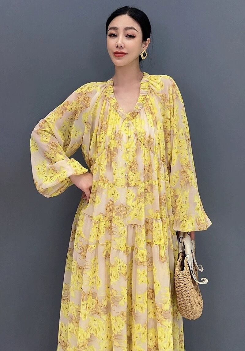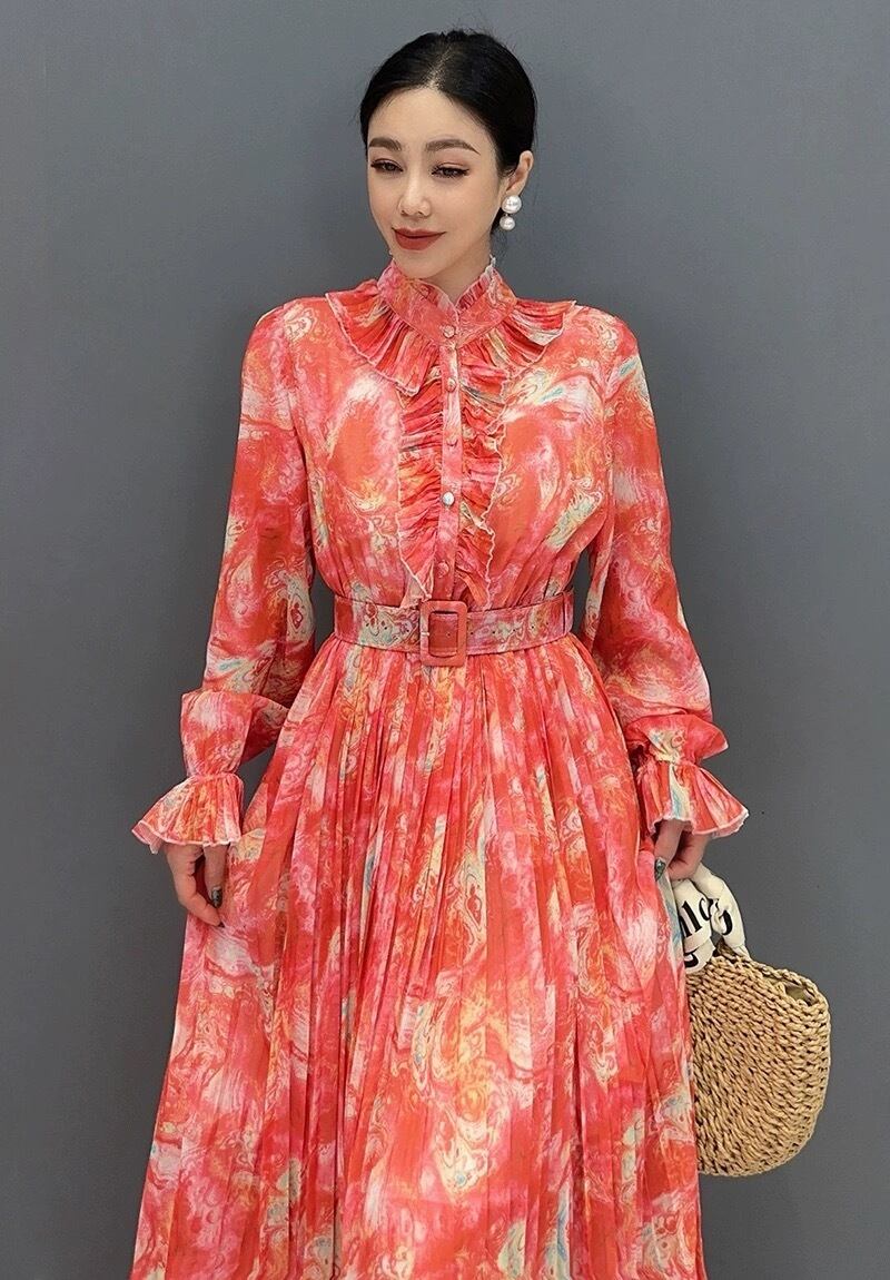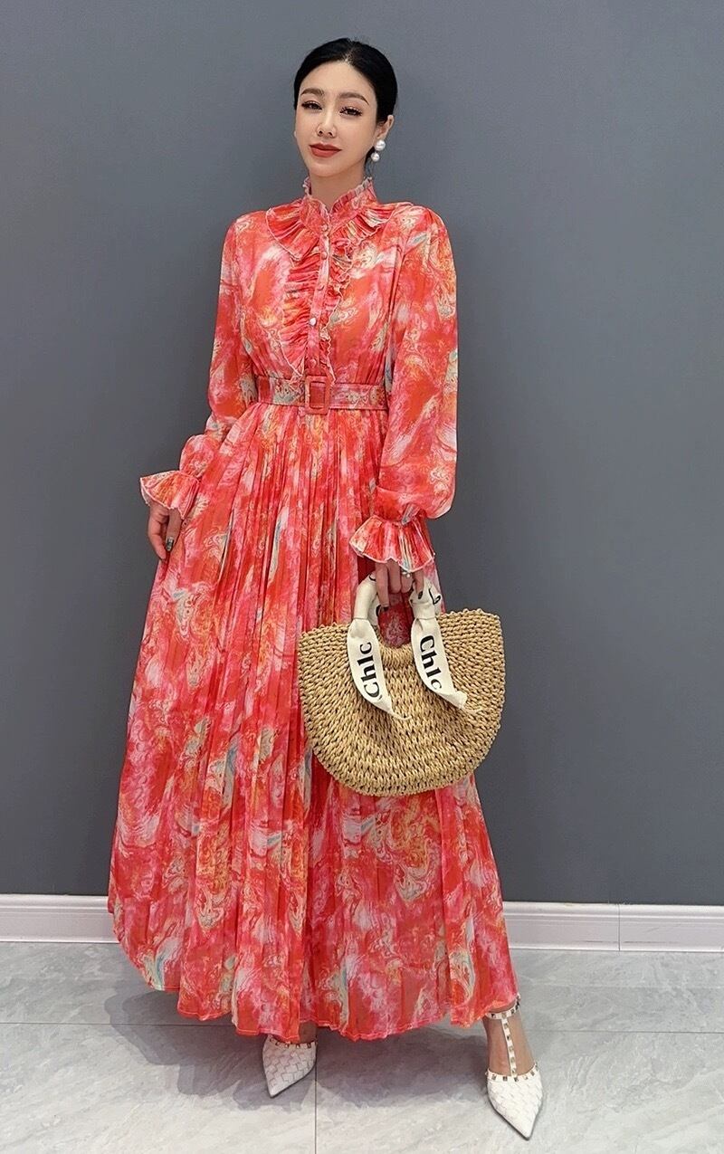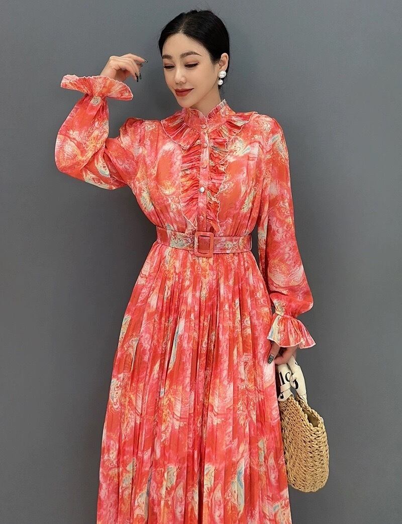 オレンジ 黄色 花柄 フラワー マキシ ゆったり ワンピース 赤