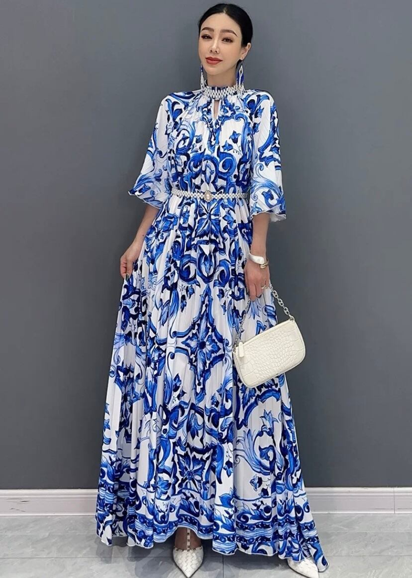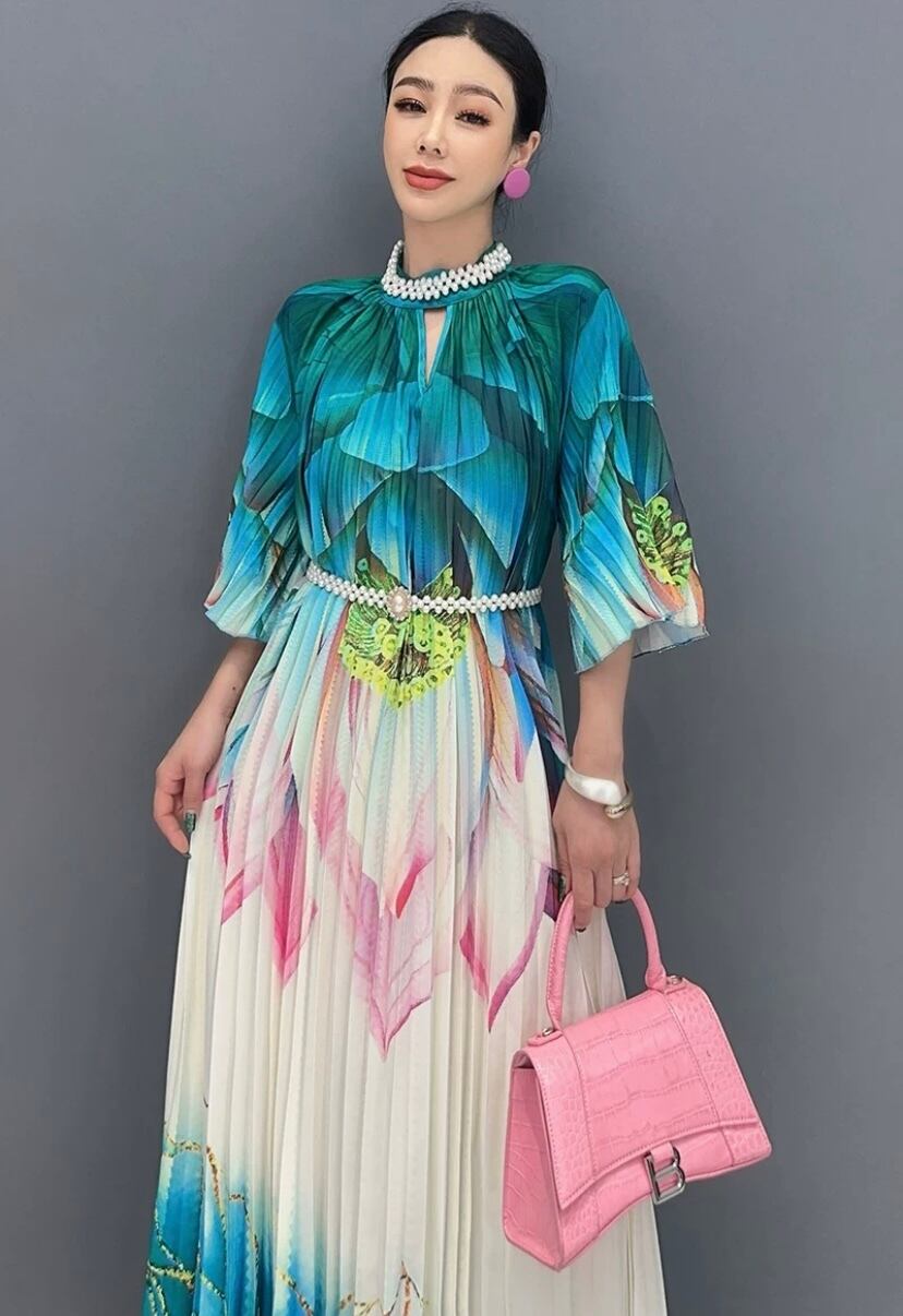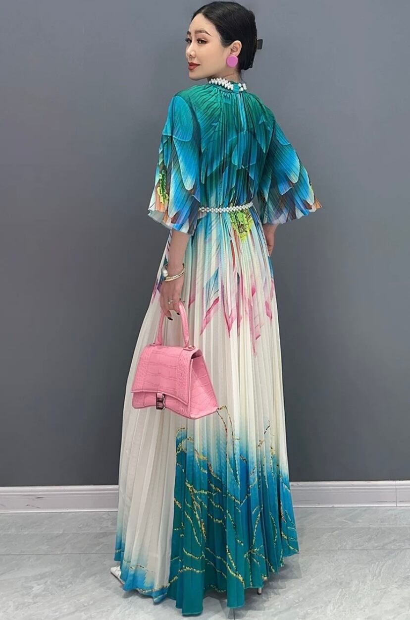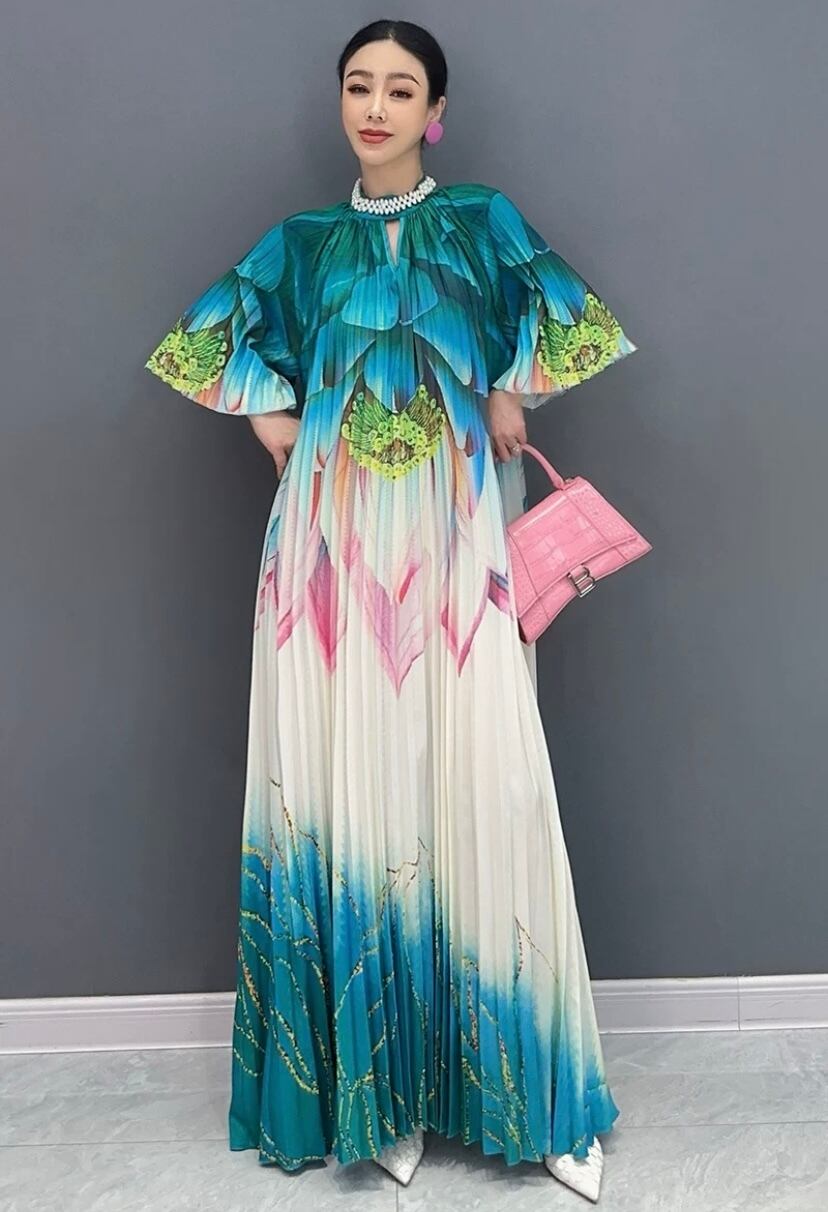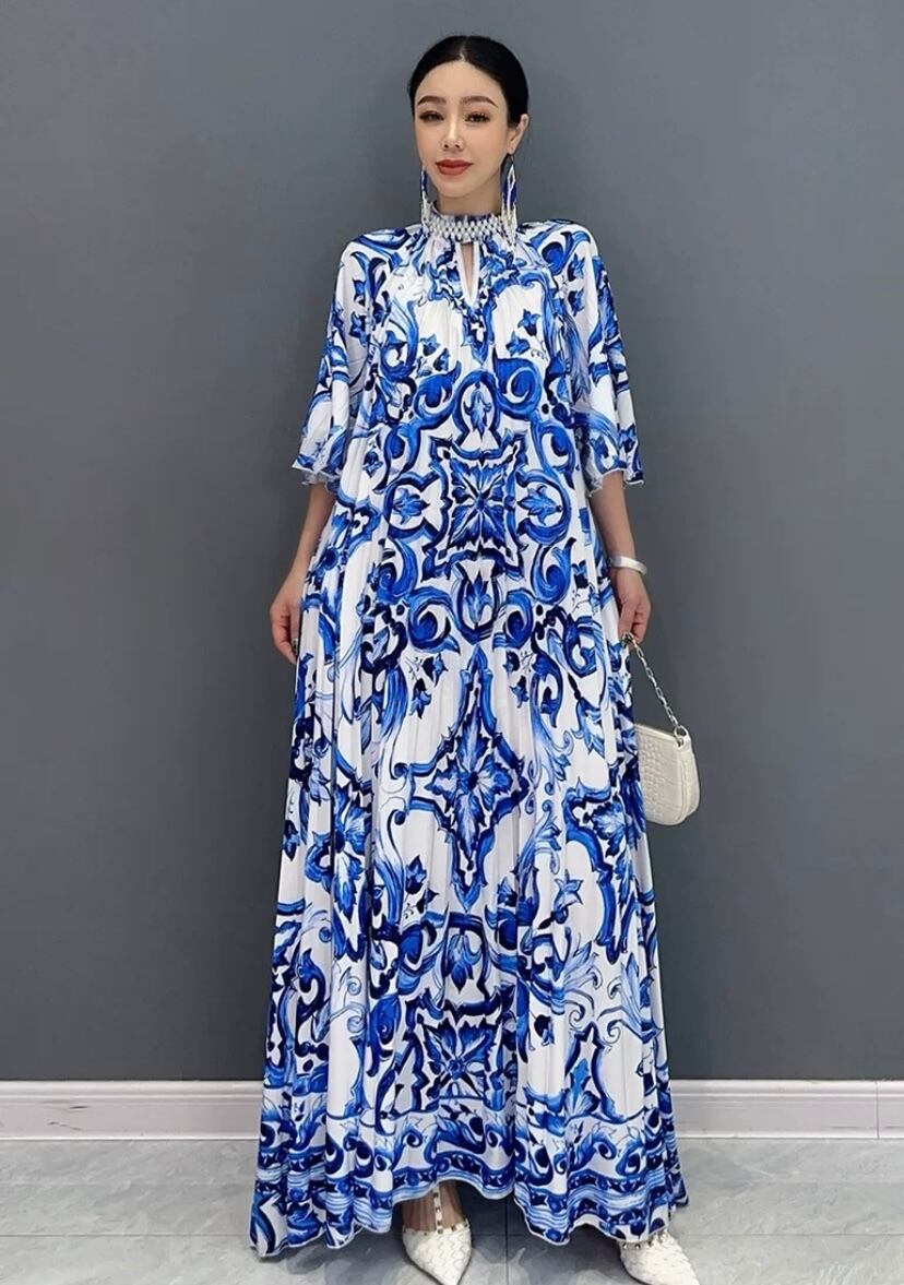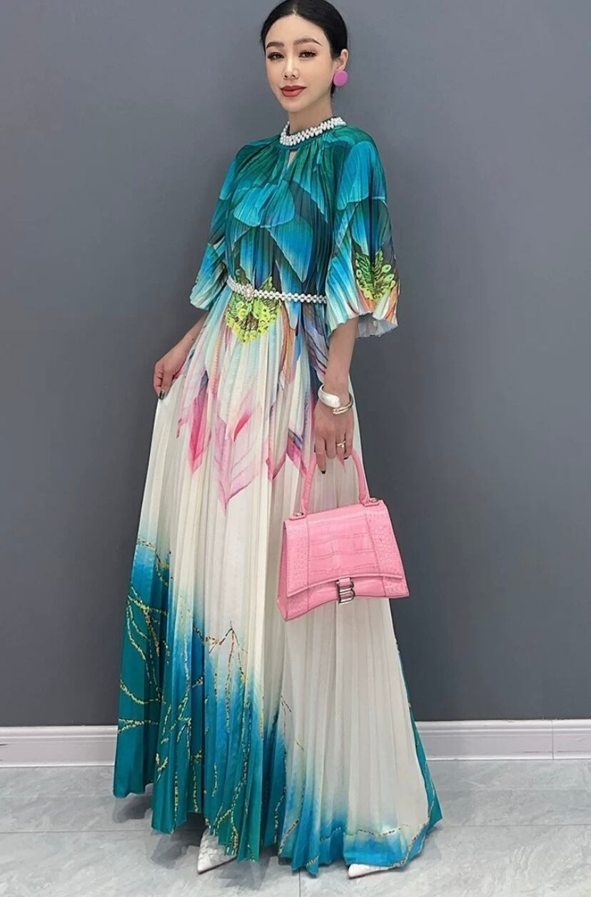 ブルー マーブル グラデーション 緑 マキシ ワンピース