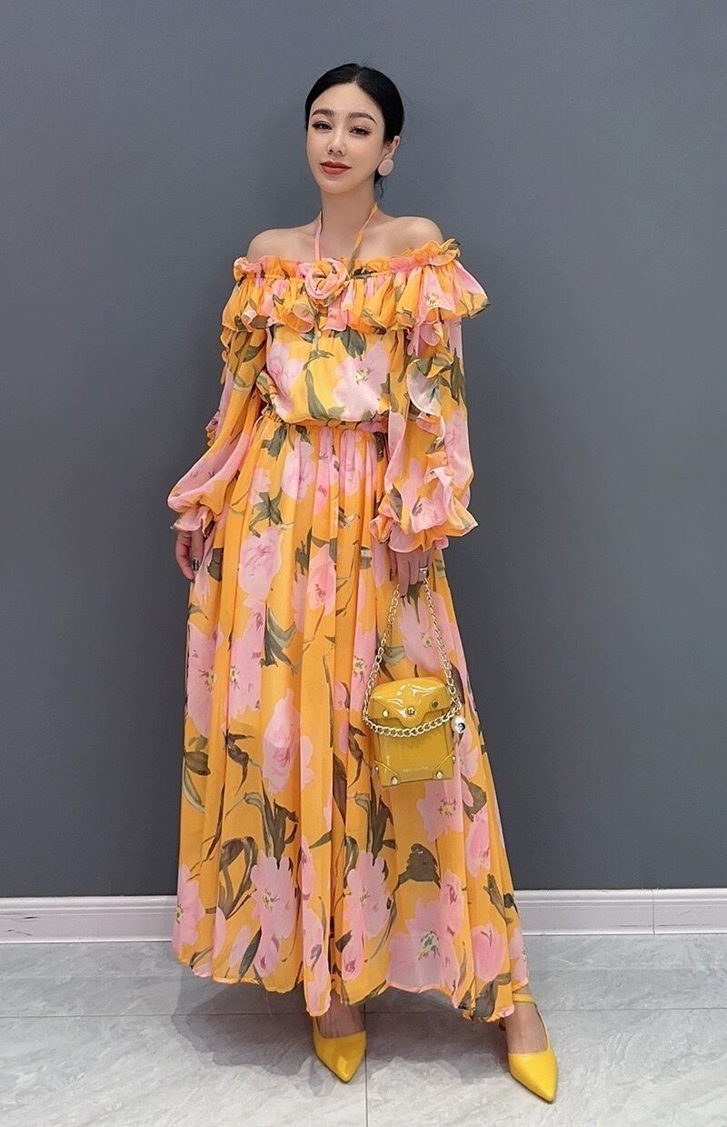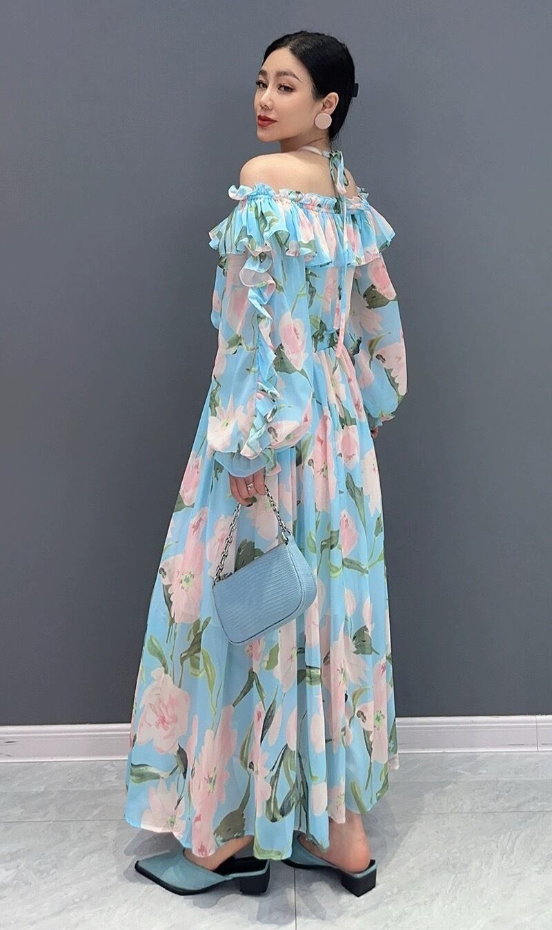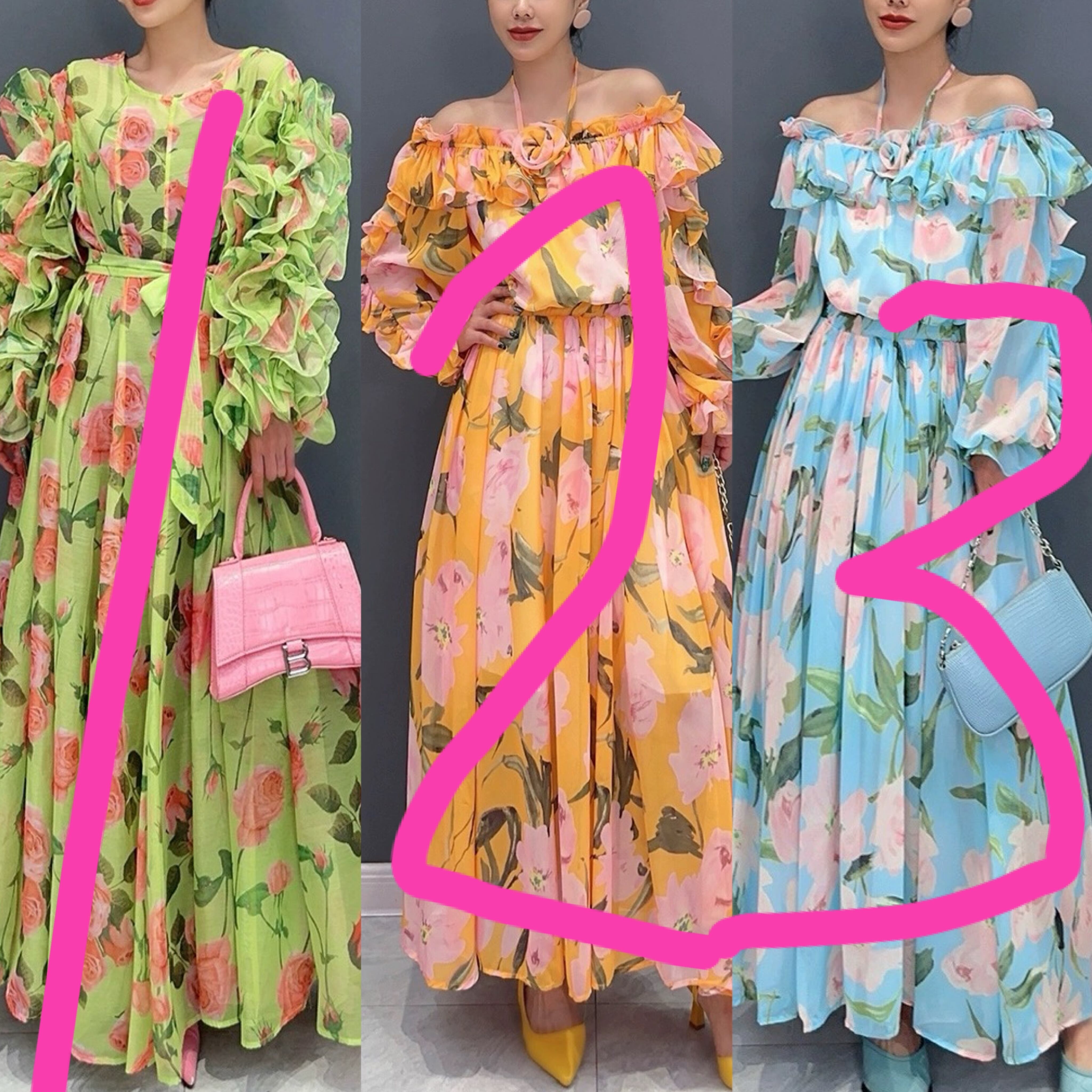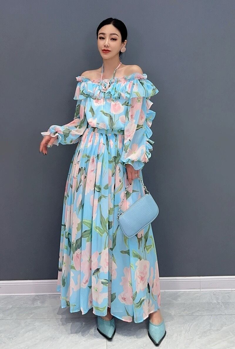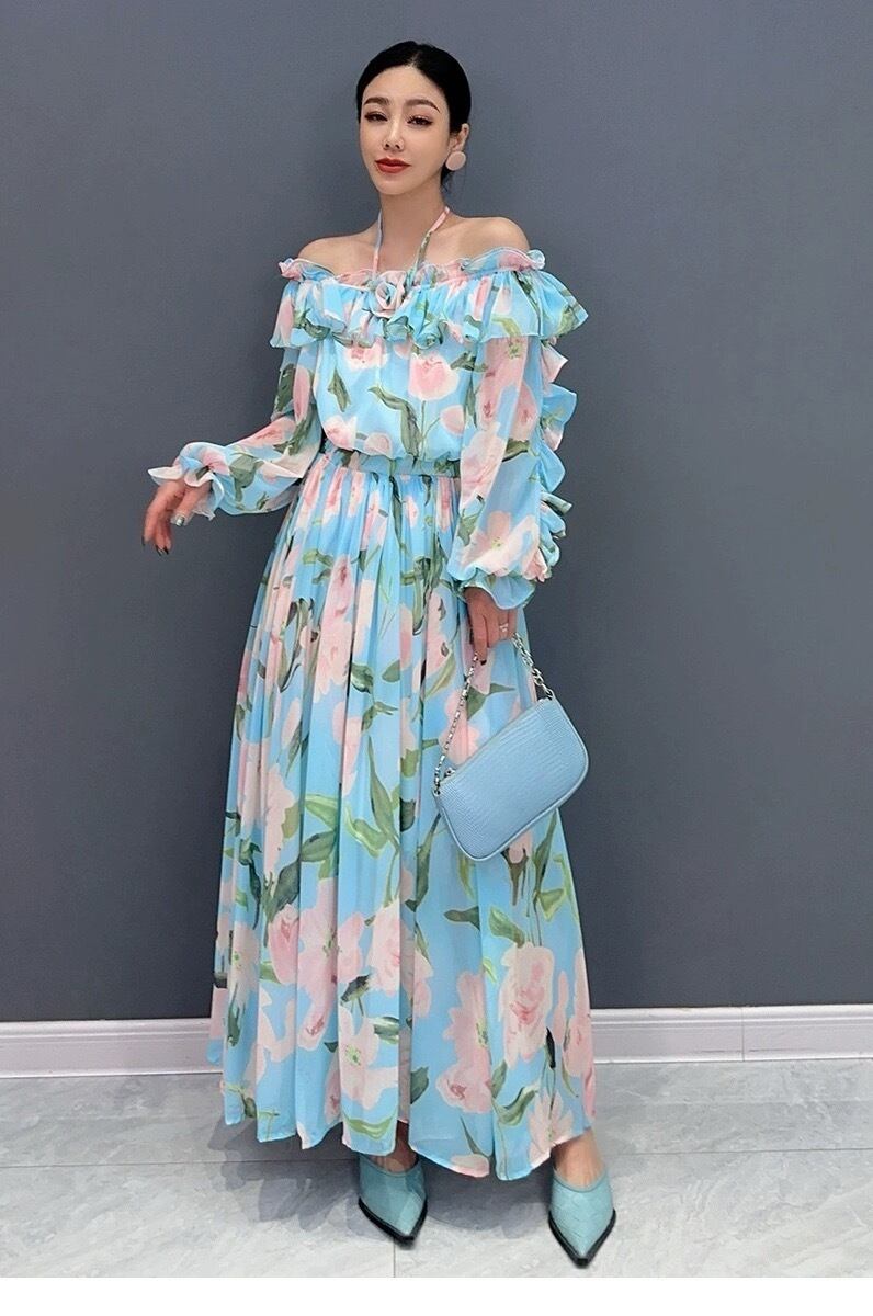オレンジ 水色 花柄 オフショルダー マキシ ワンピース XL