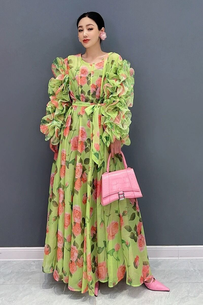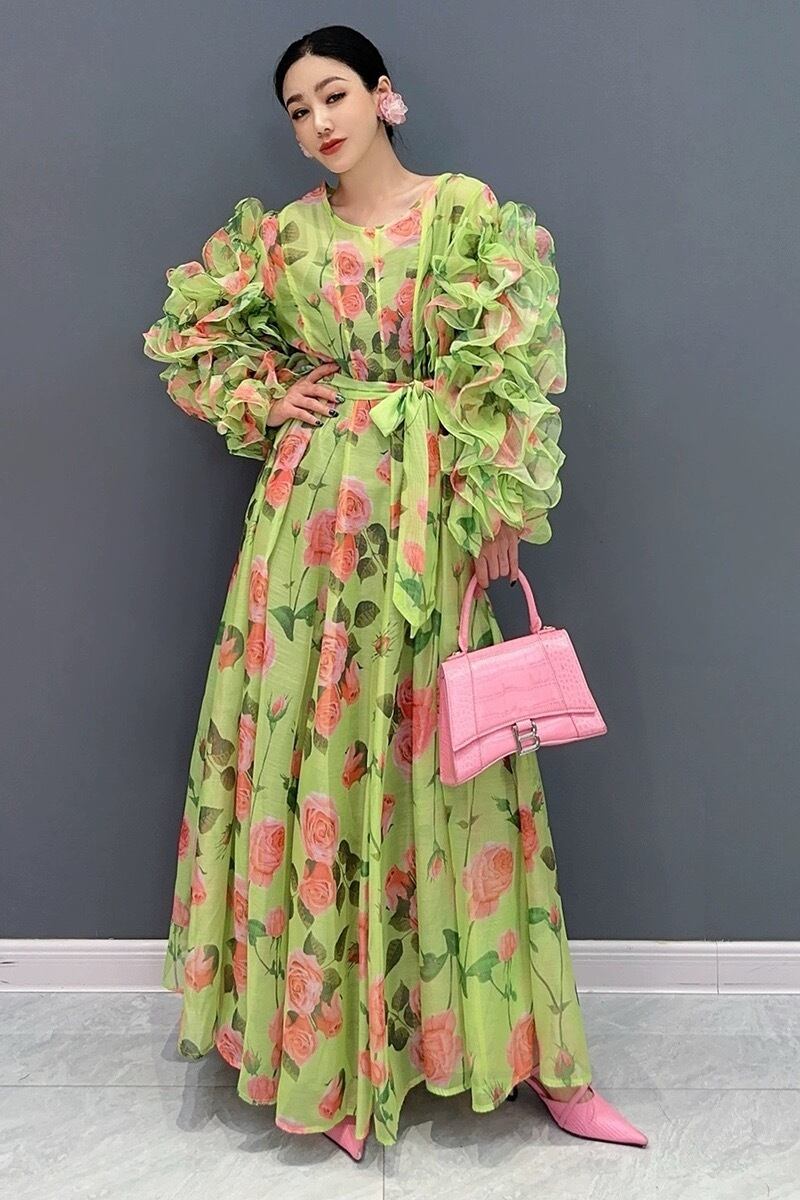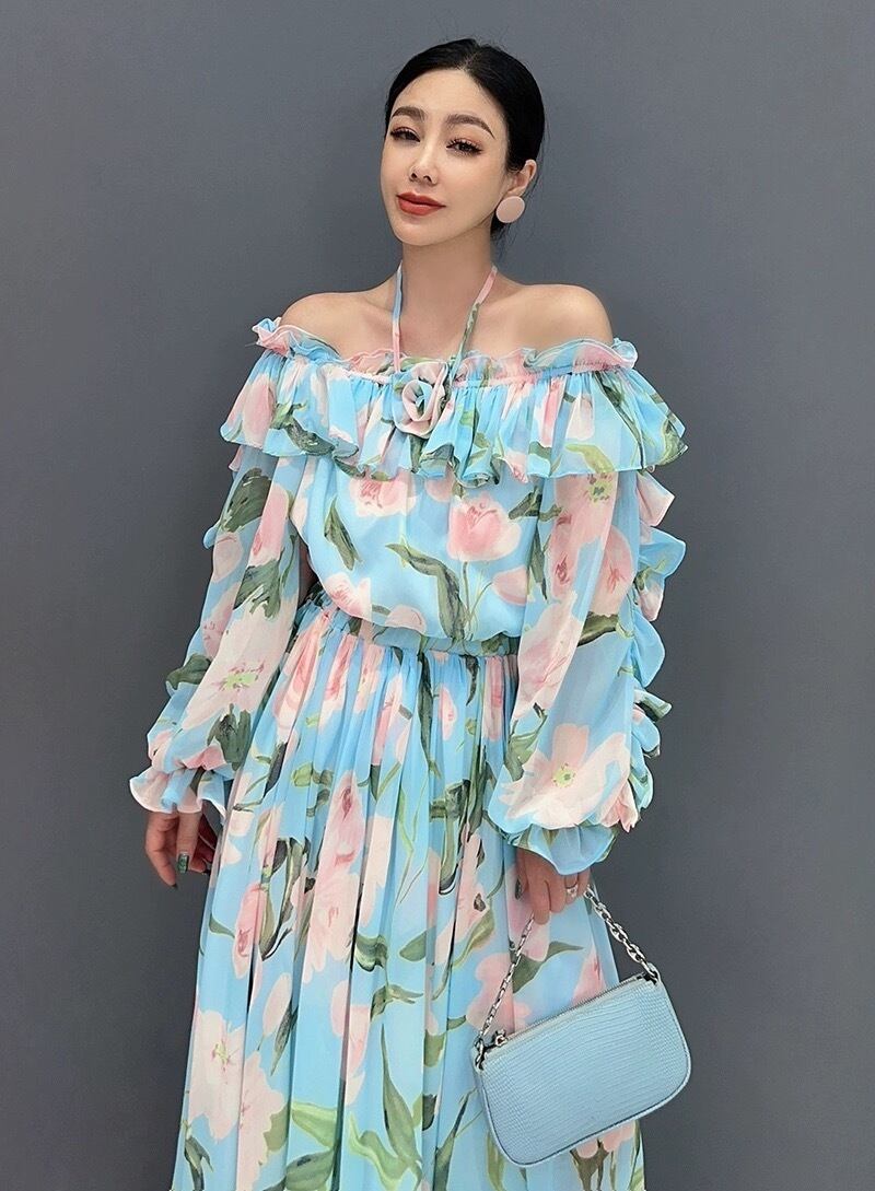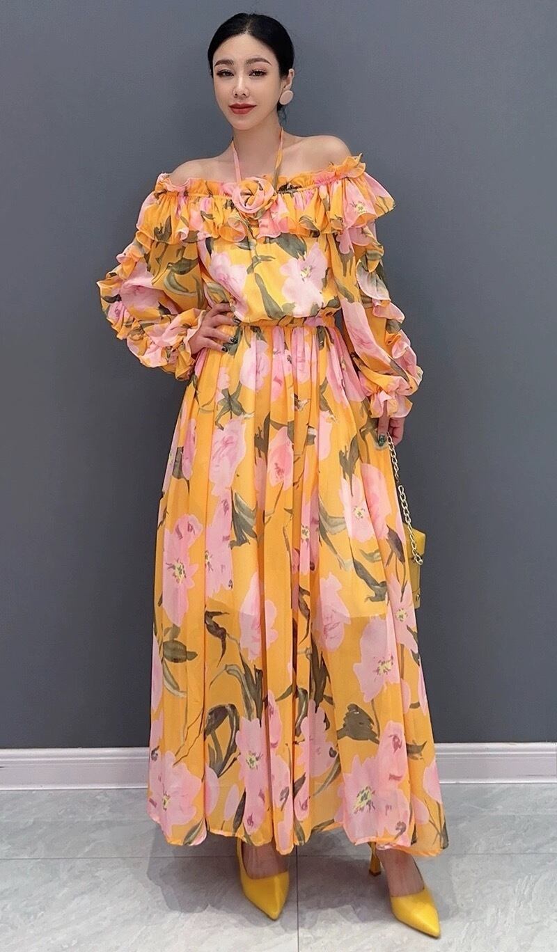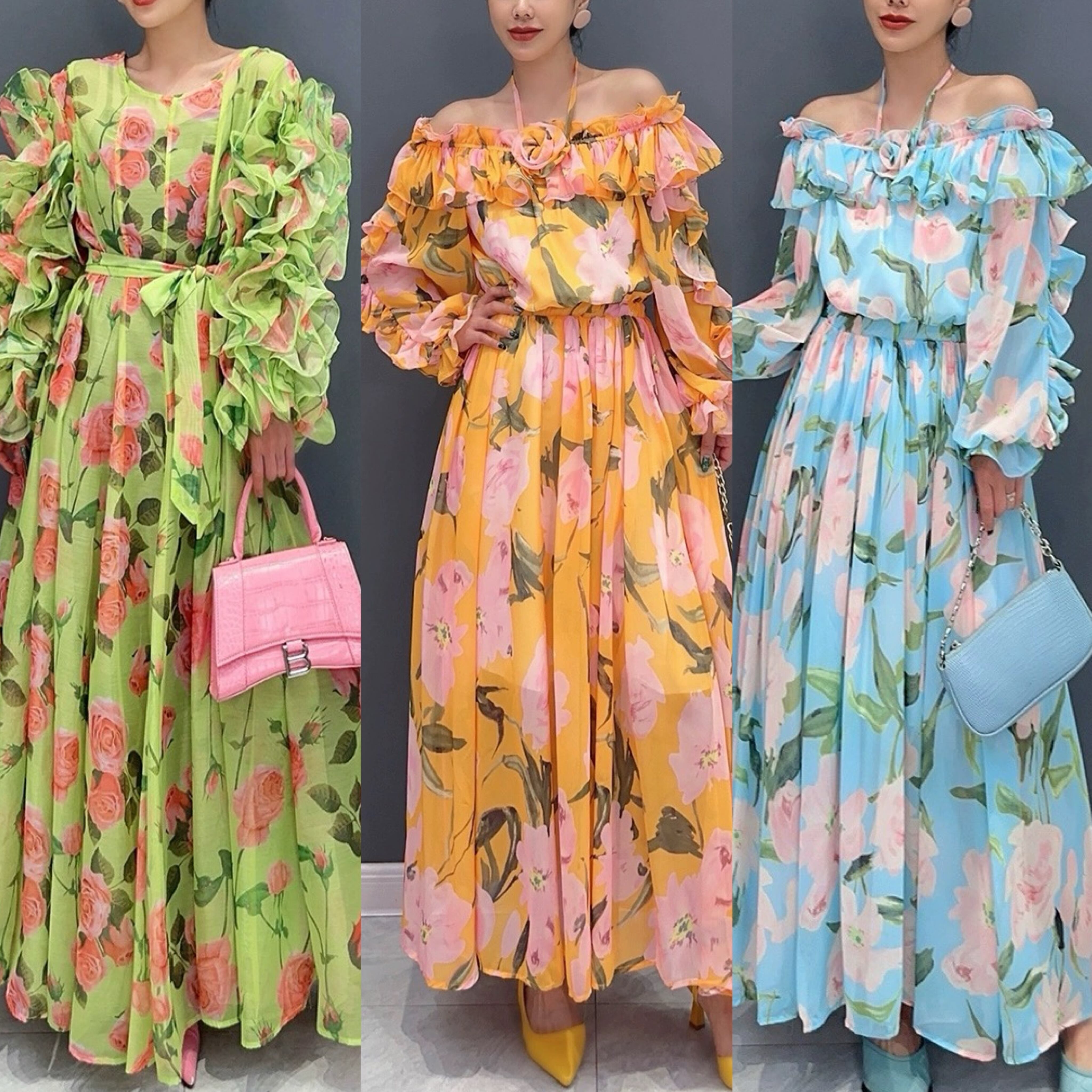 オレンジ 水色 花柄 オフショルダー マキシ ワンピース XL