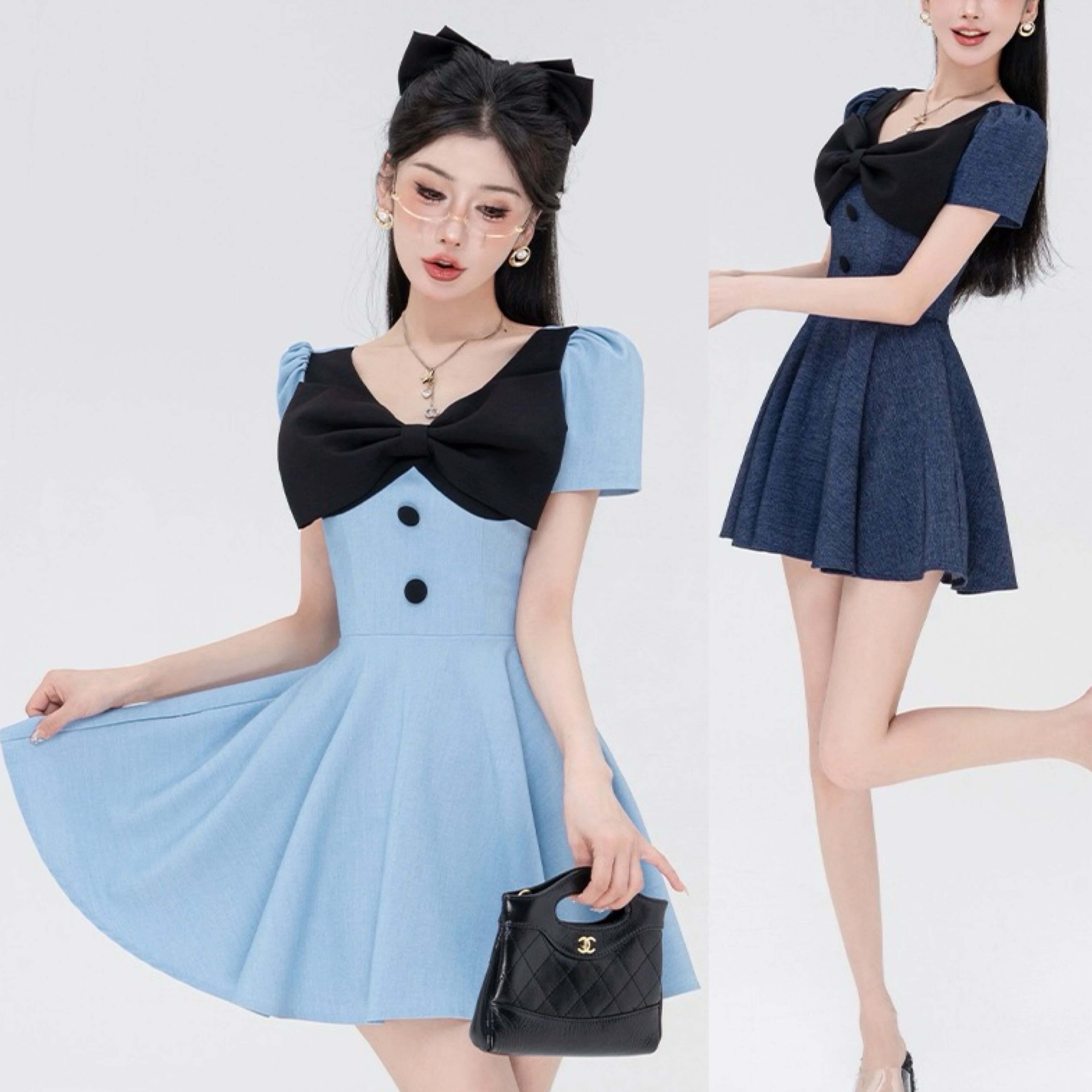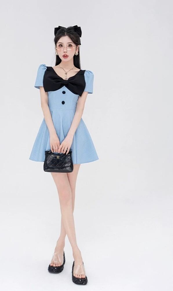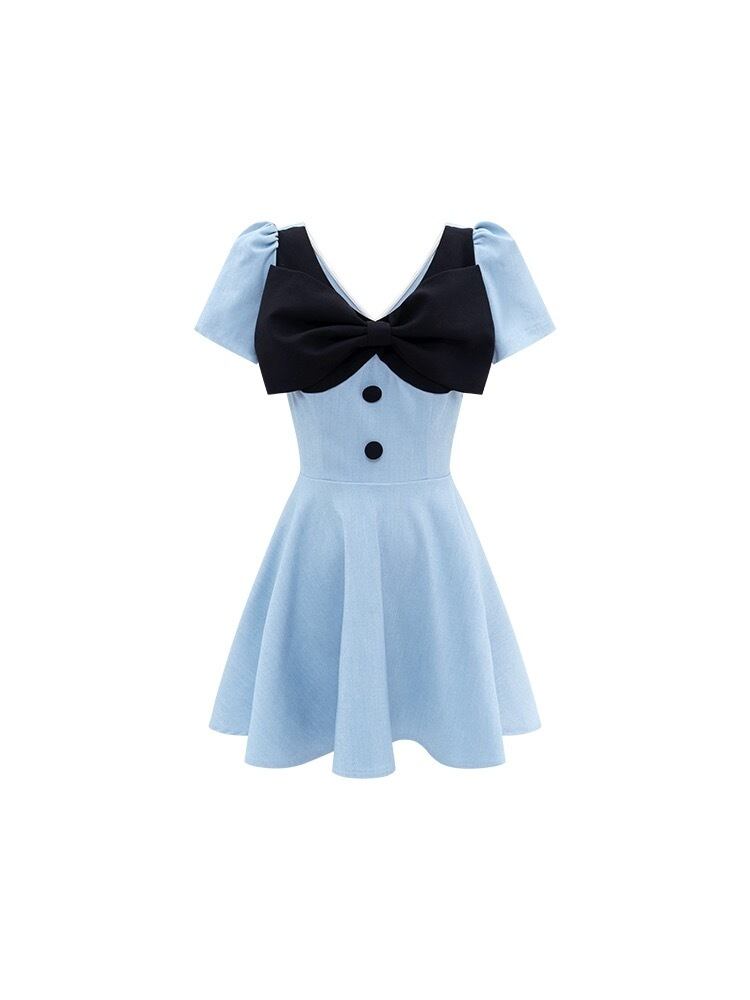 水色 黒 リボン ガーリー ワンピース お嬢様 XL