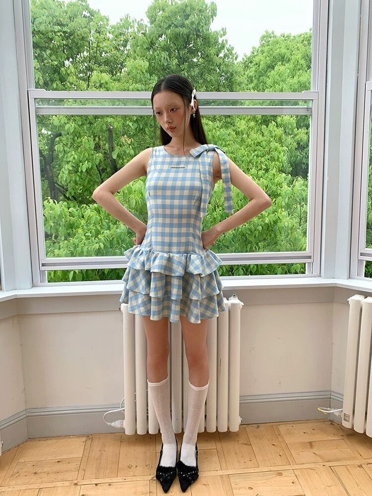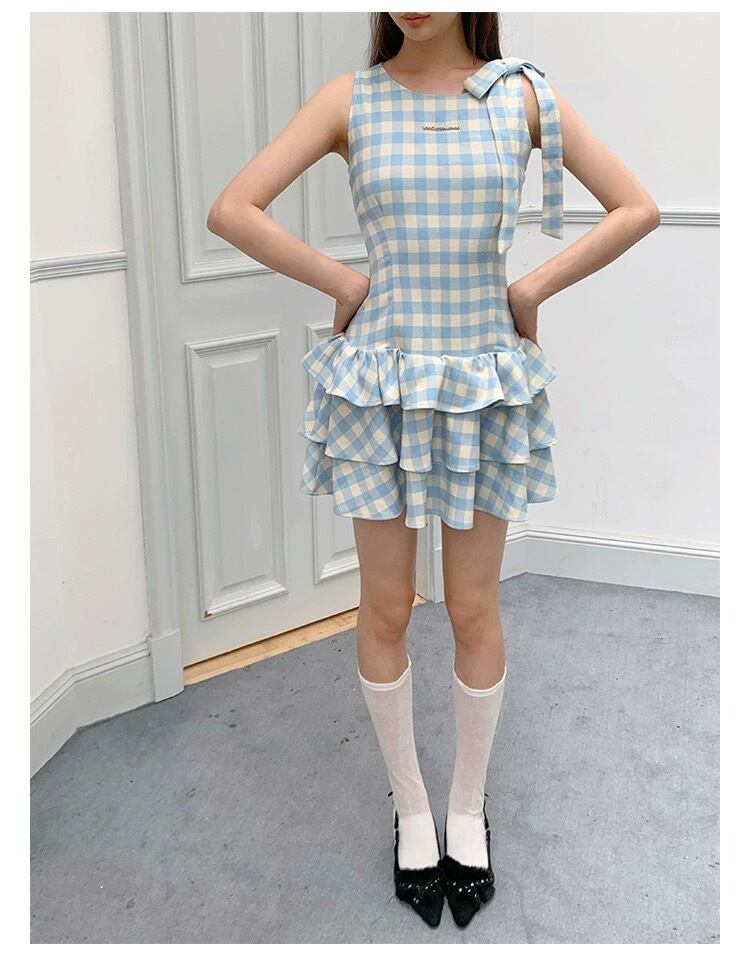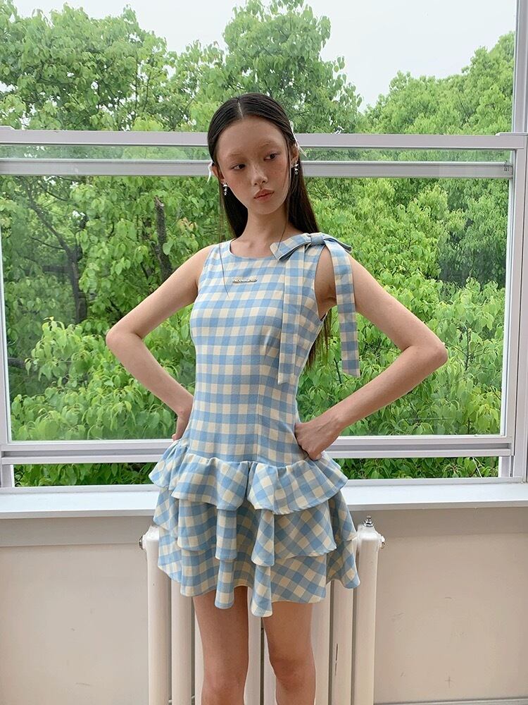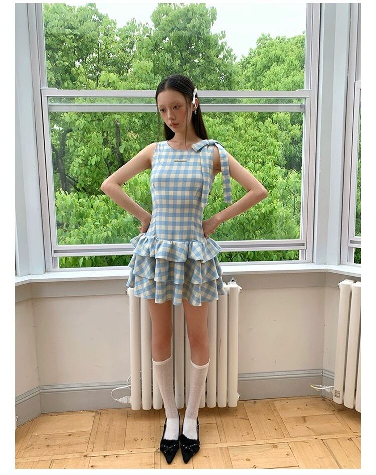 水色 リボン ガーリー ワンピース 可愛い チェック 原宿