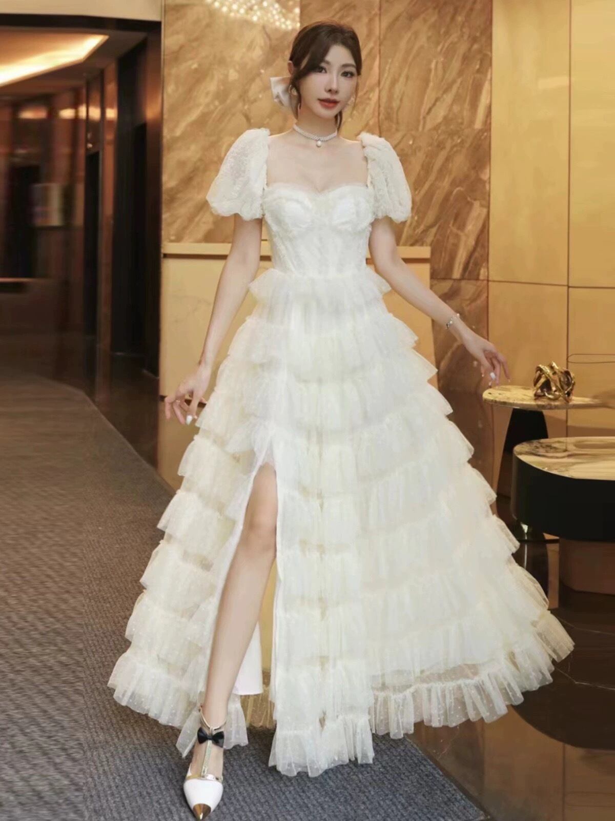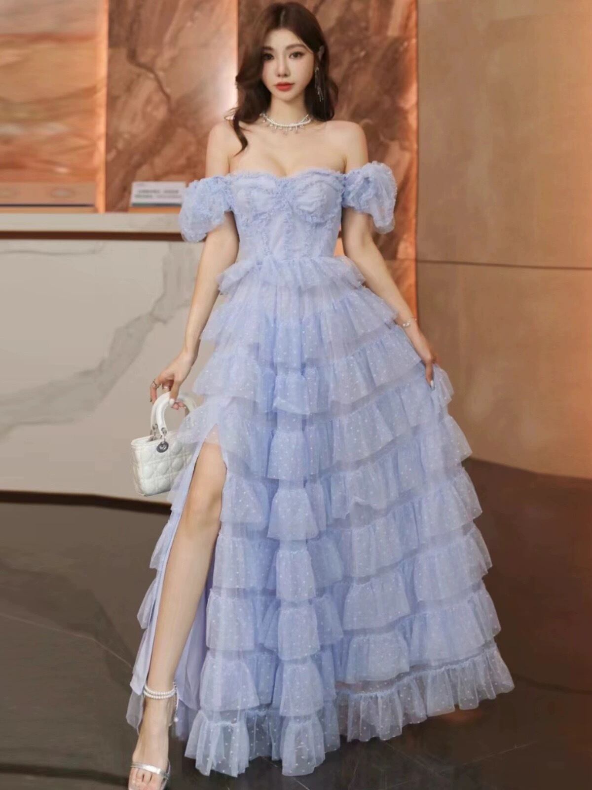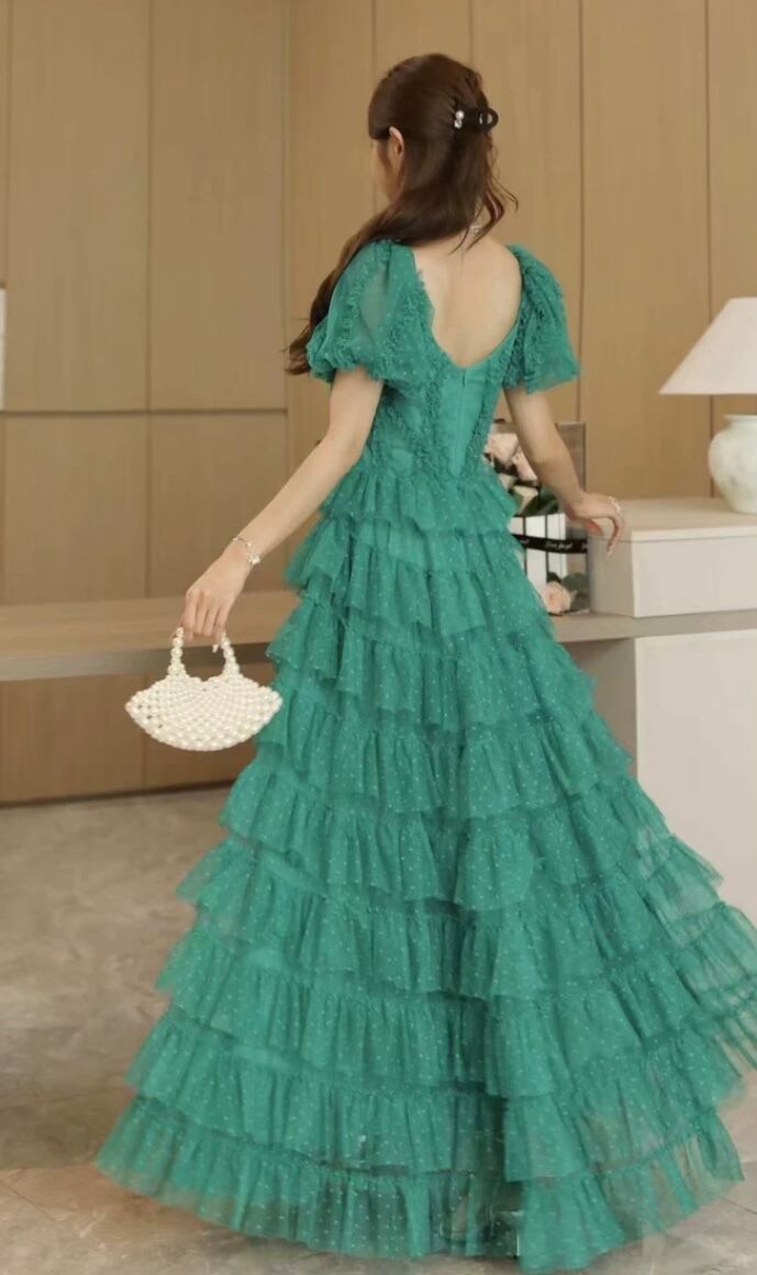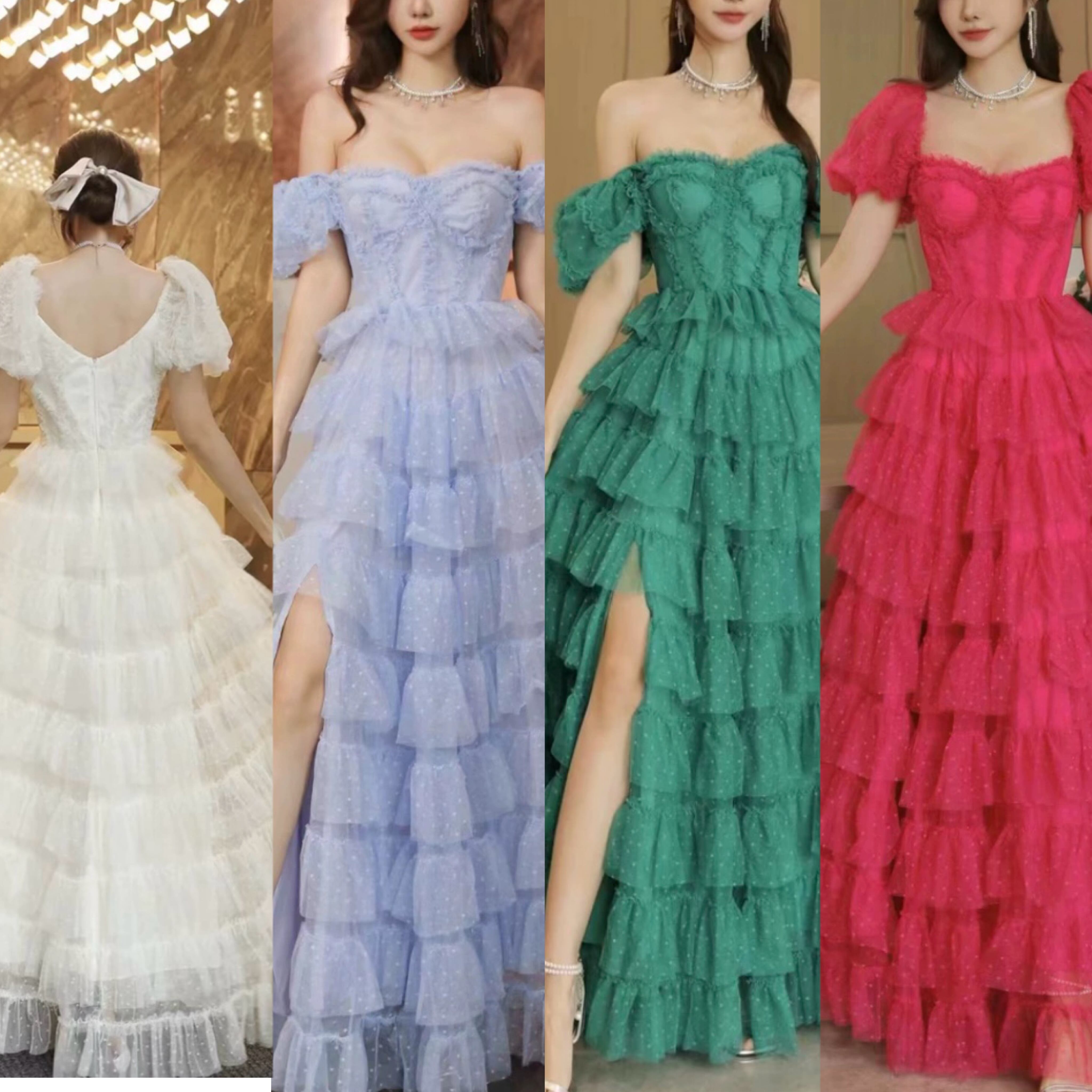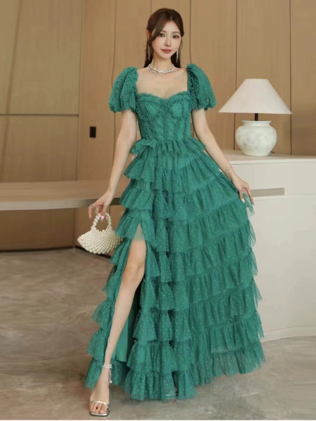 カラフル 緑 白 オフショルダー スリット フリル ワンピース ドレス