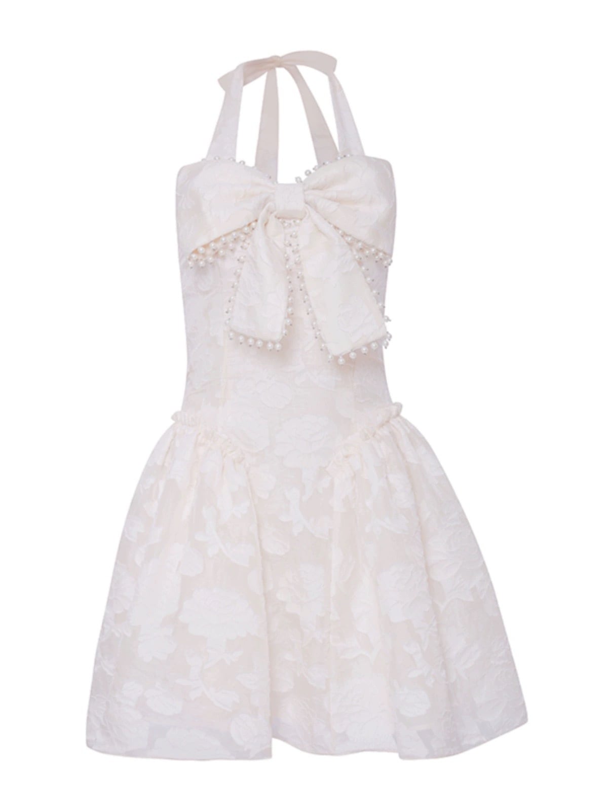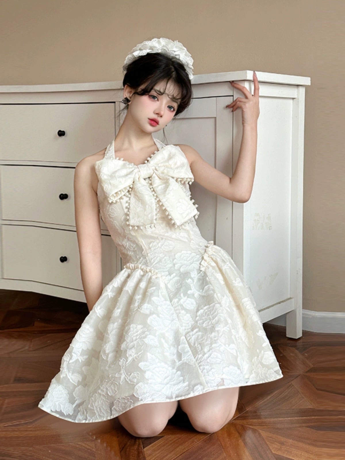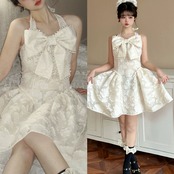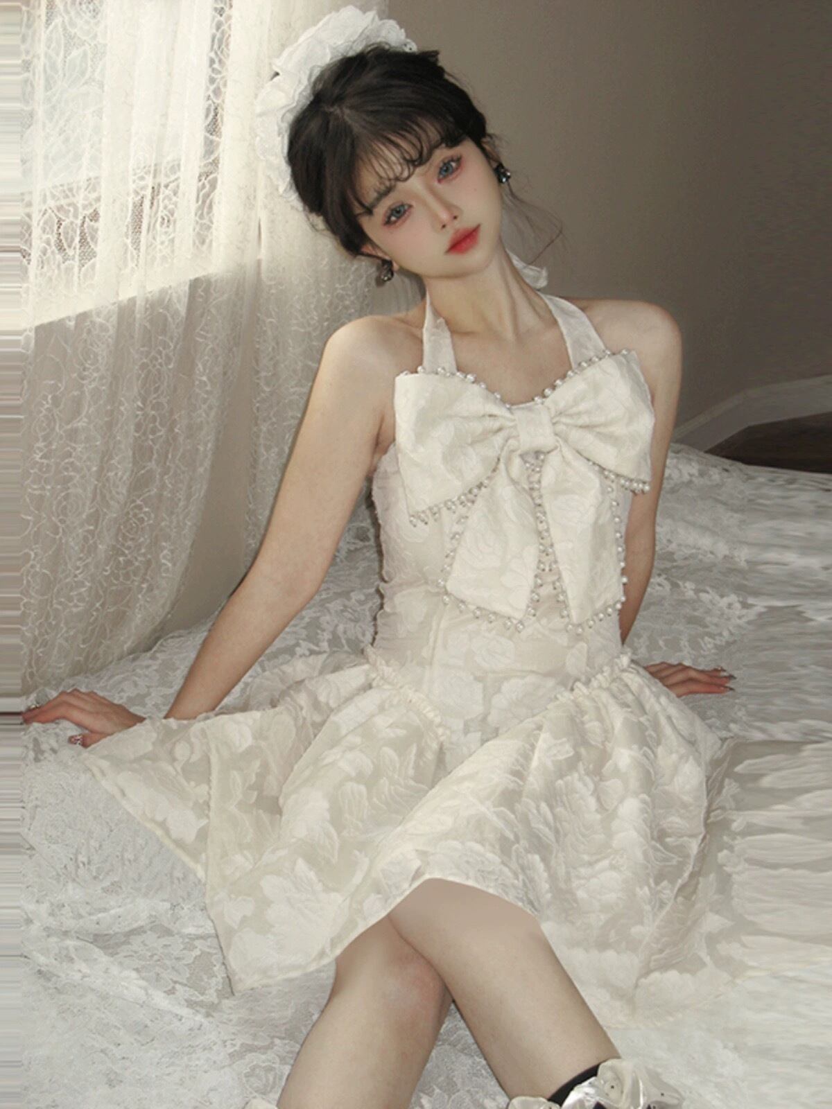 白 リボン ガーリー ワンピース 可愛い ホルダーネック リボン チュニック 原宿 ドレス ホワイト