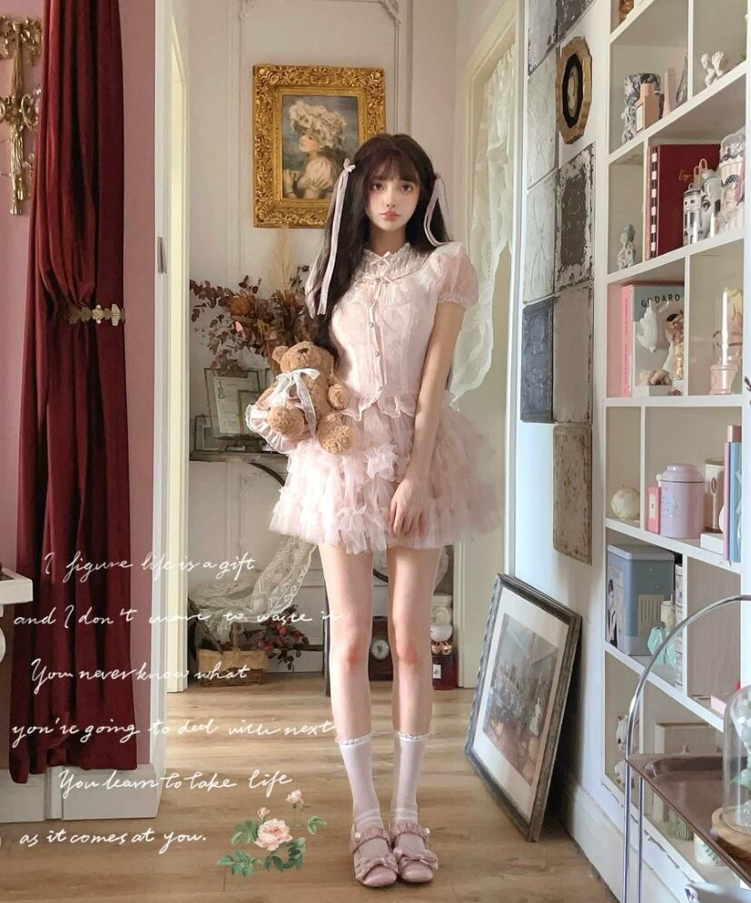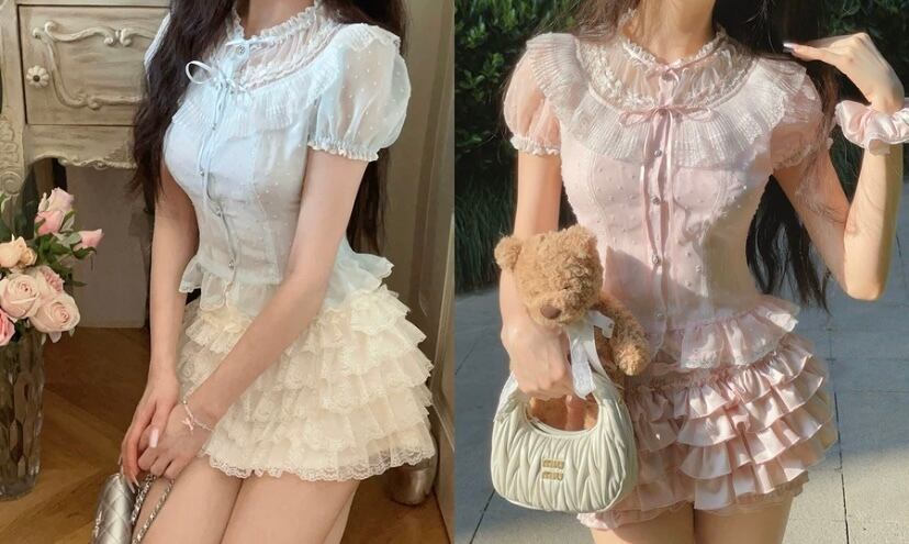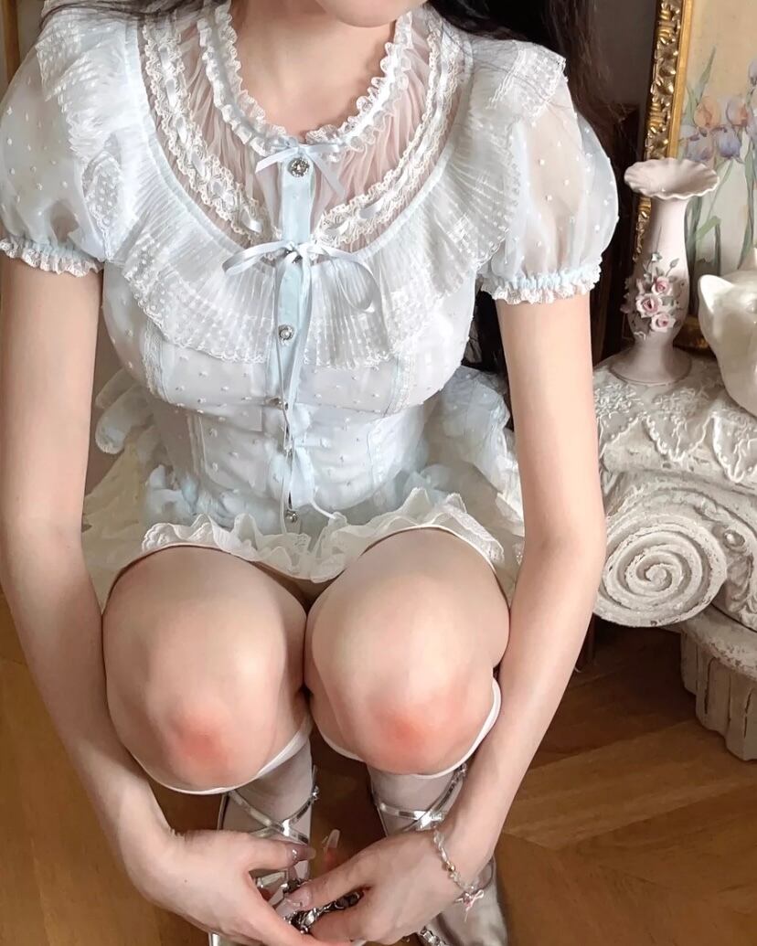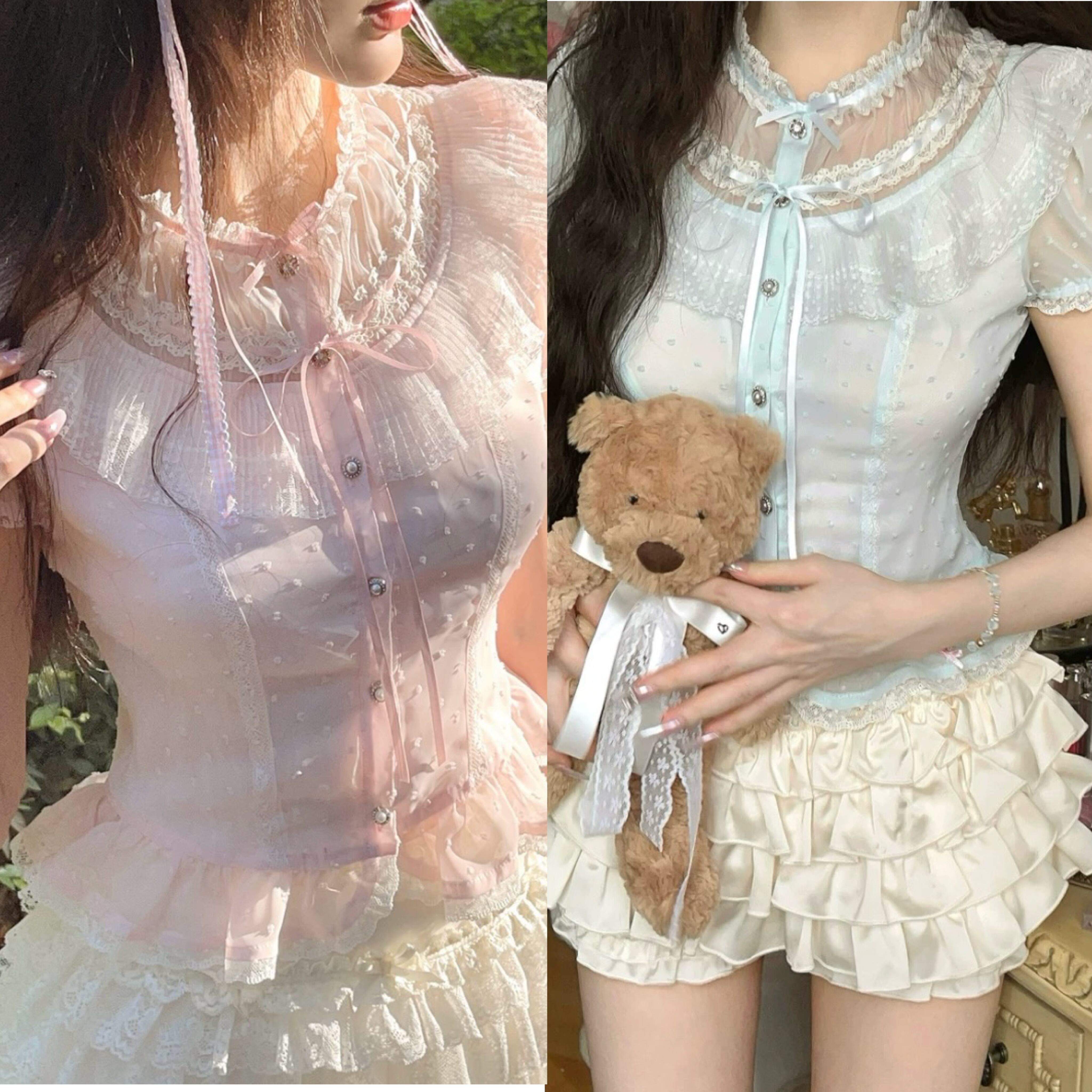 ブラウス ガーリー ピンク リボン 水色 シースルー トップス