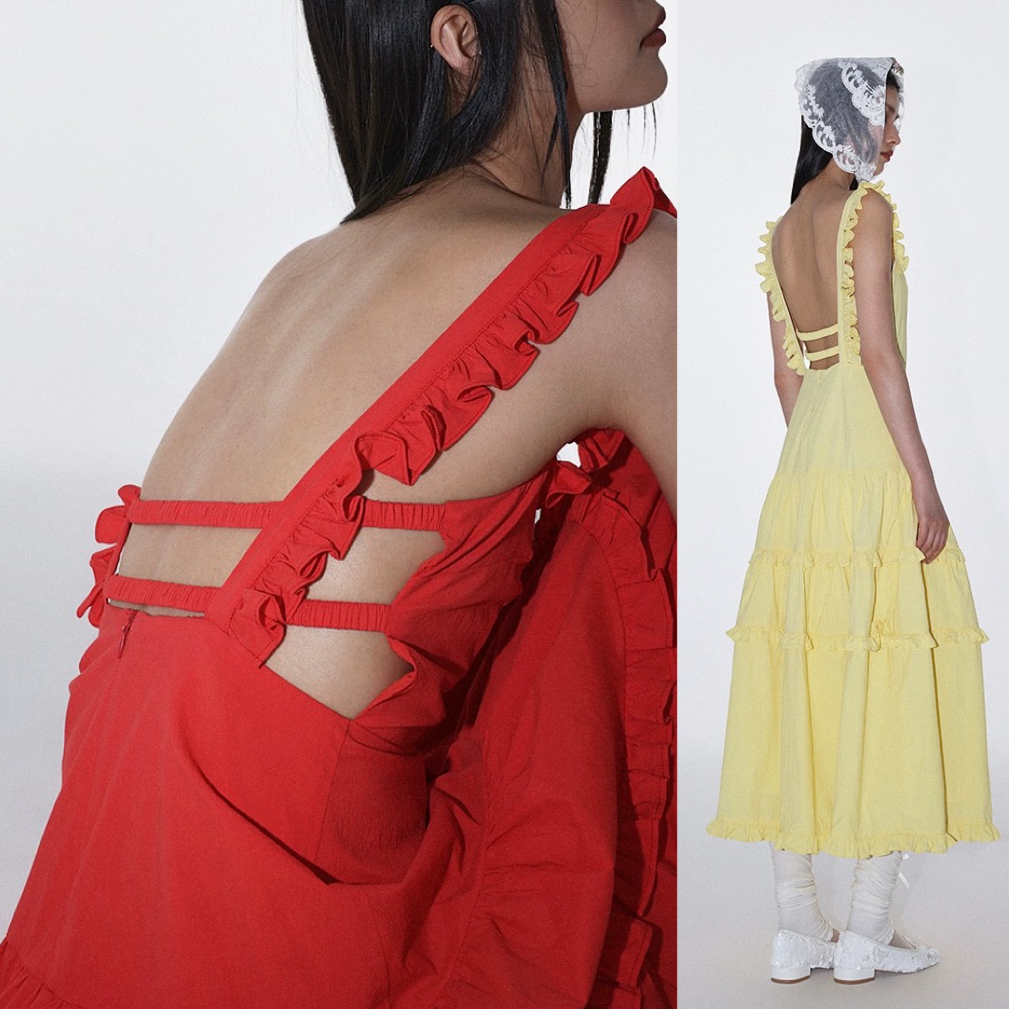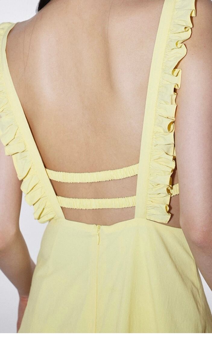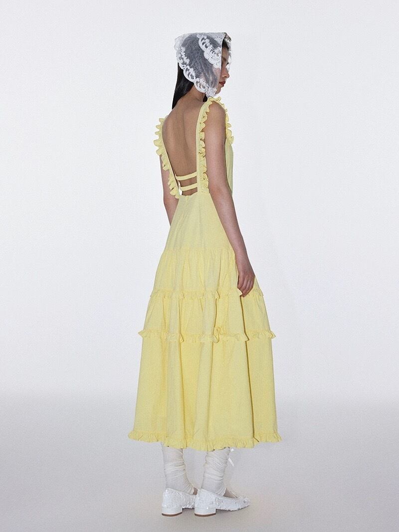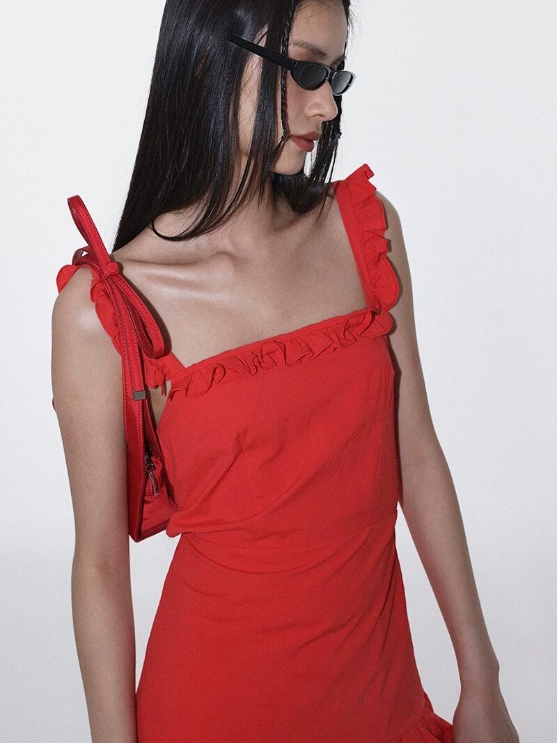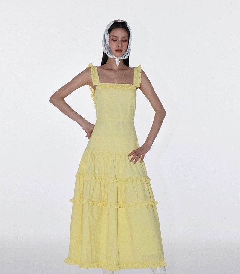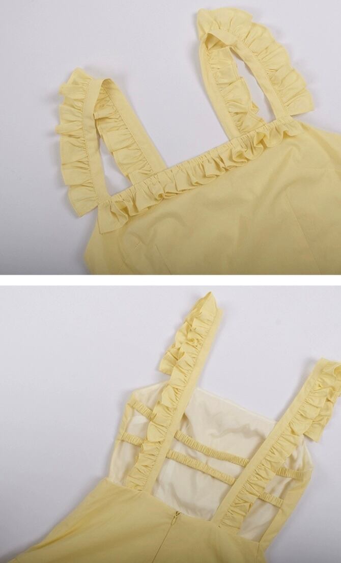 黄色 赤 ワンピース ガーリー マキシ シンプル キャミソール リボン