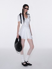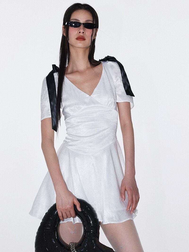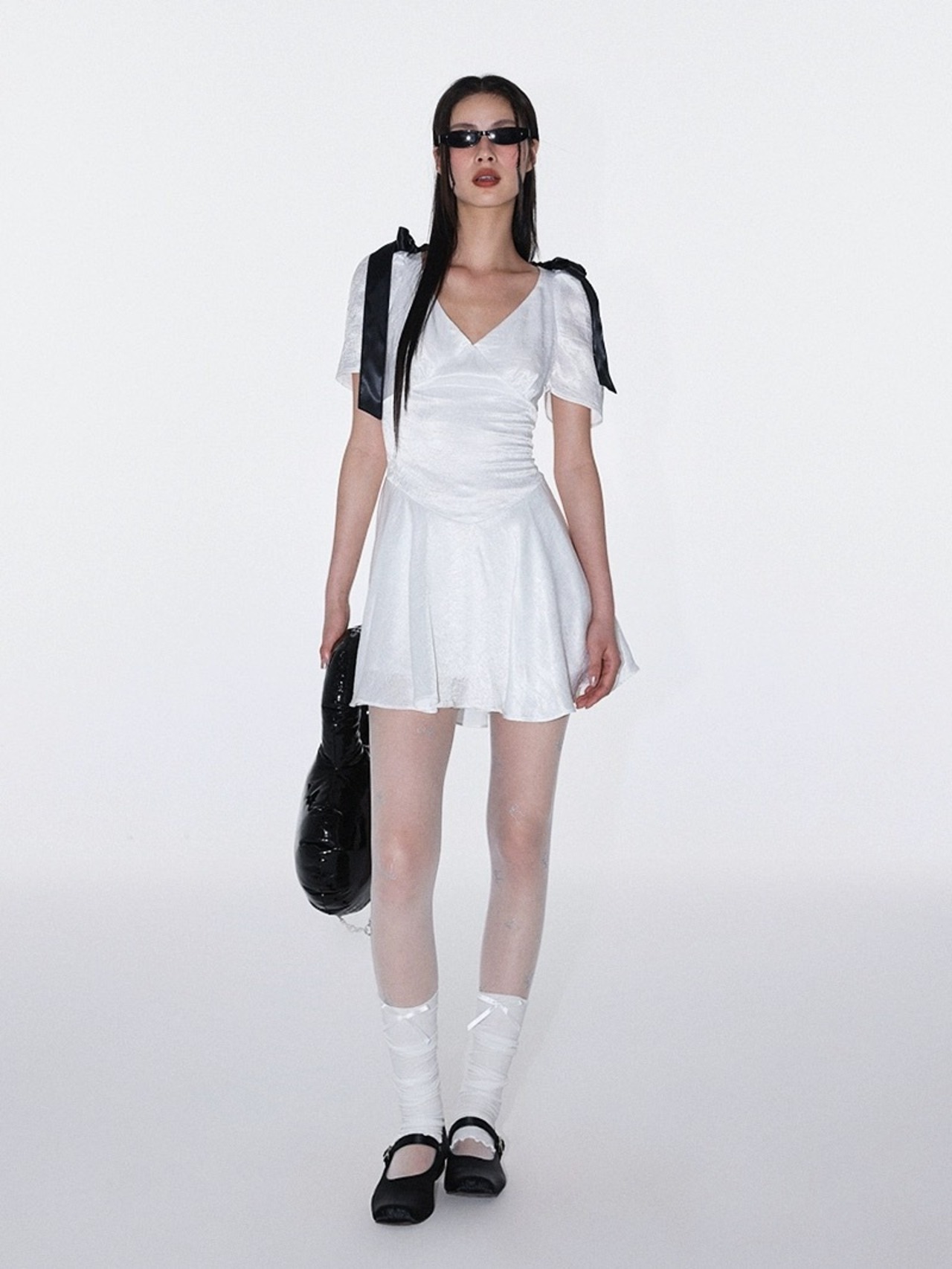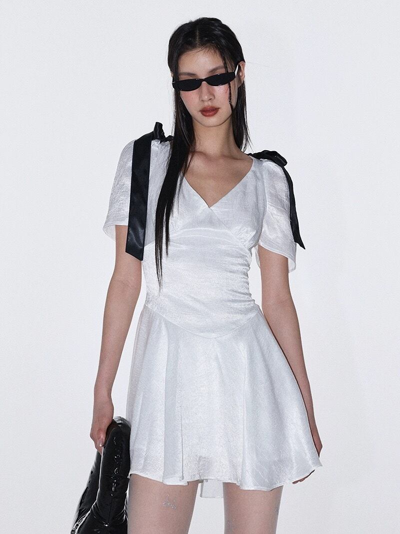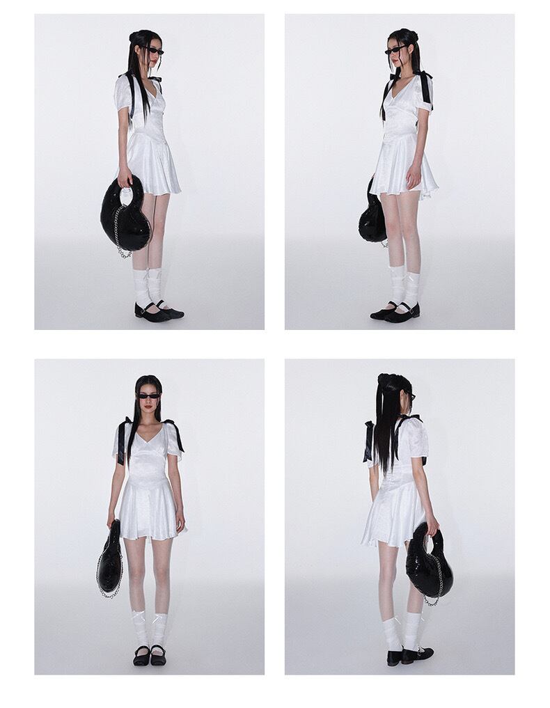 肩りぼん 黒 白 ホワイト ガーリー シンプル 可愛い ワンピース