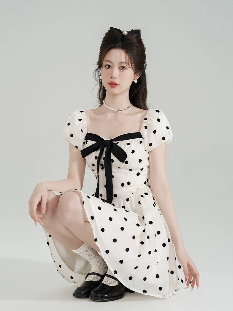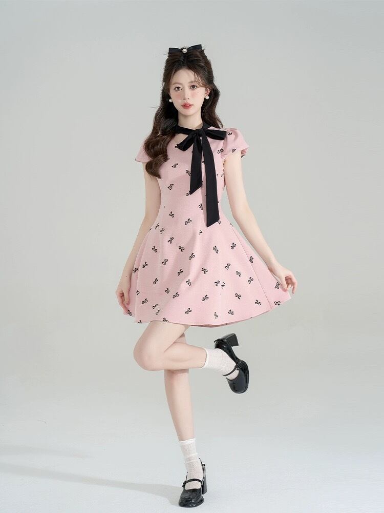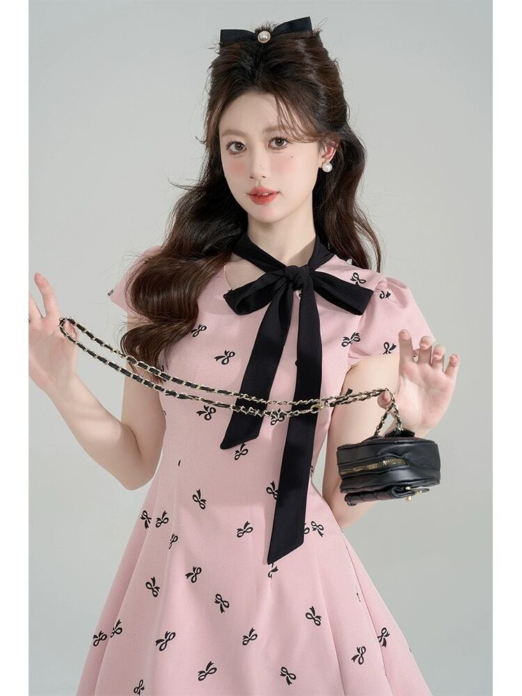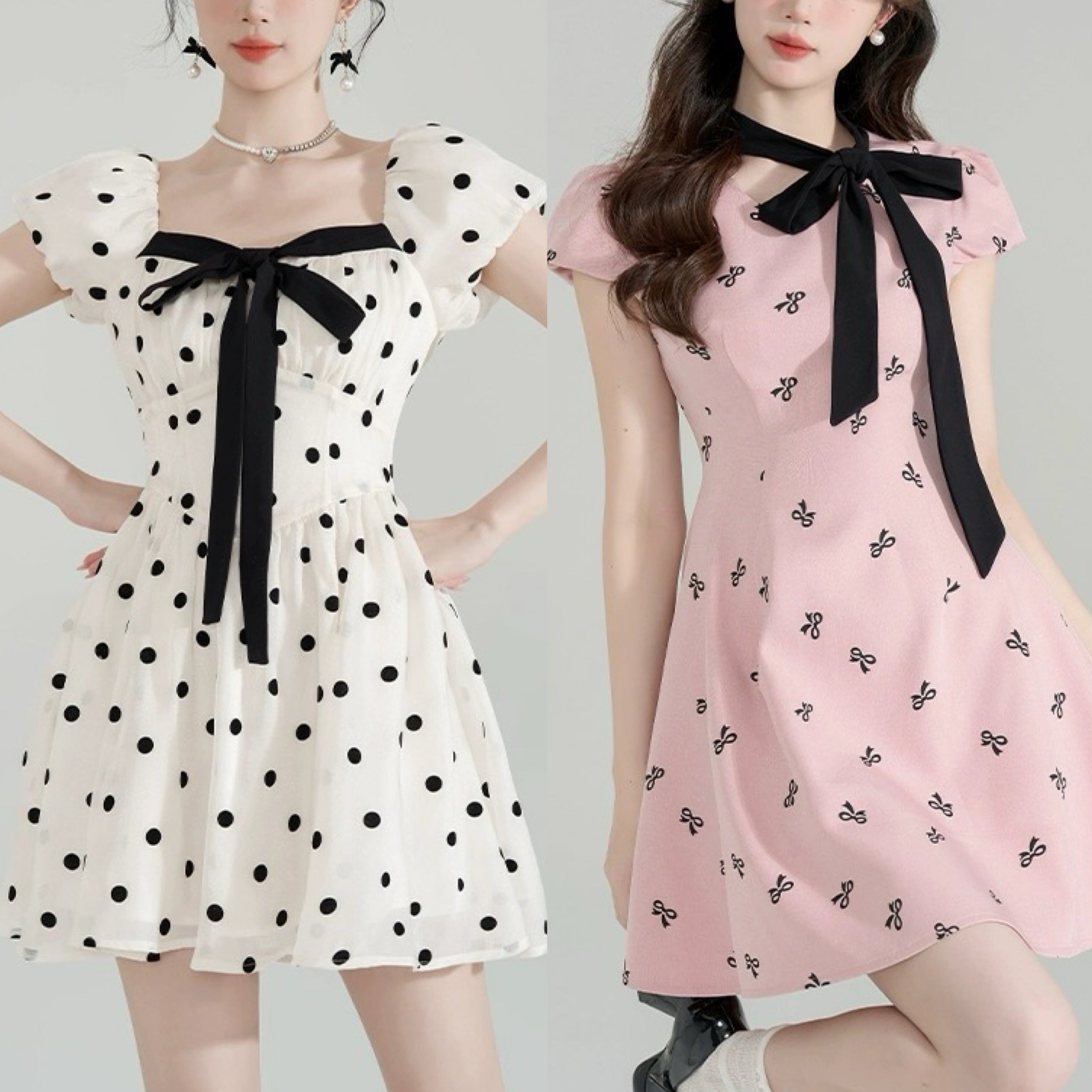 お嬢様 ピンク リボン 白 ワンピース 花柄 水玉 ドット