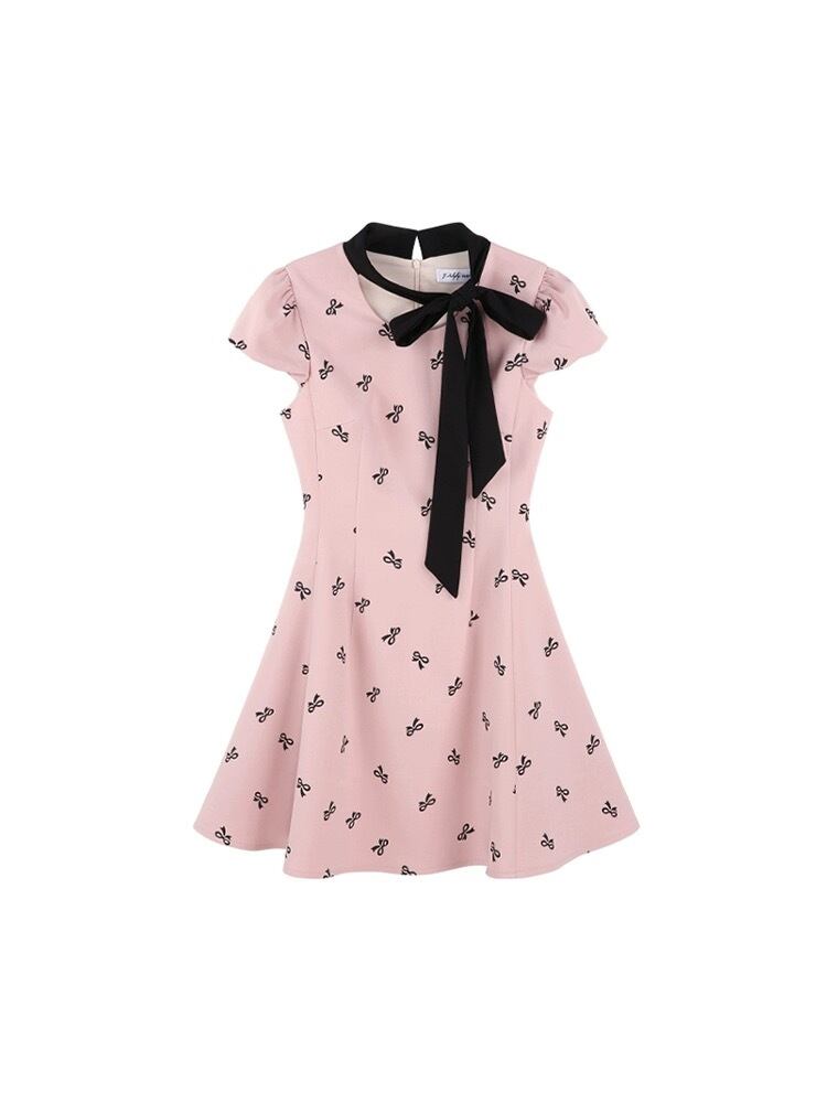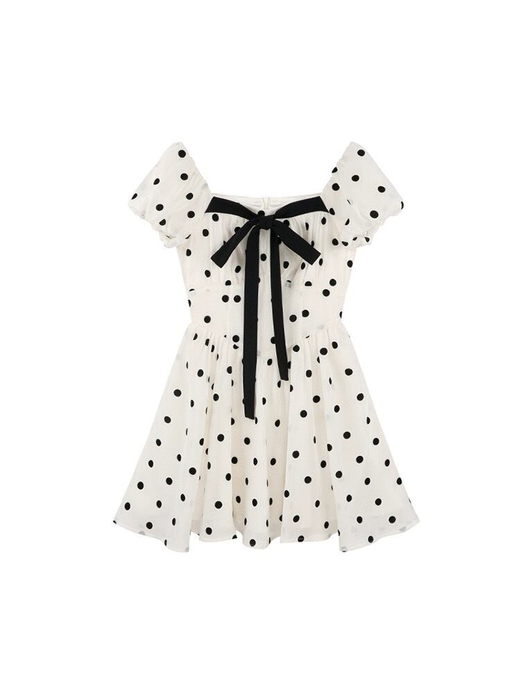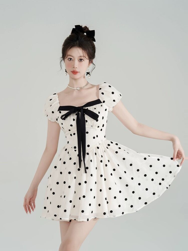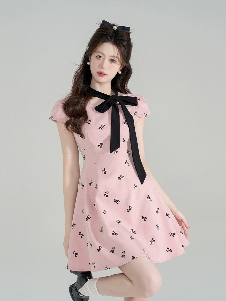 お嬢様 ピンク リボン 白 ワンピース 花柄 水玉 ドット