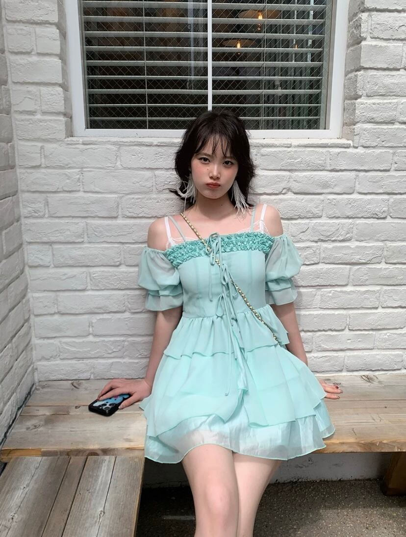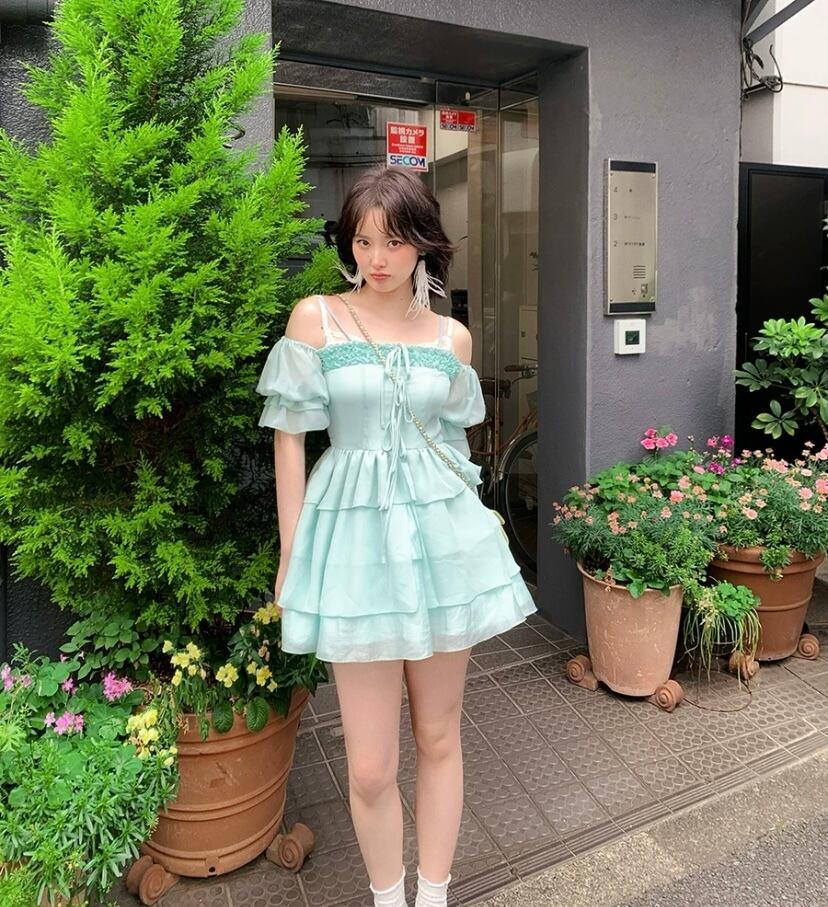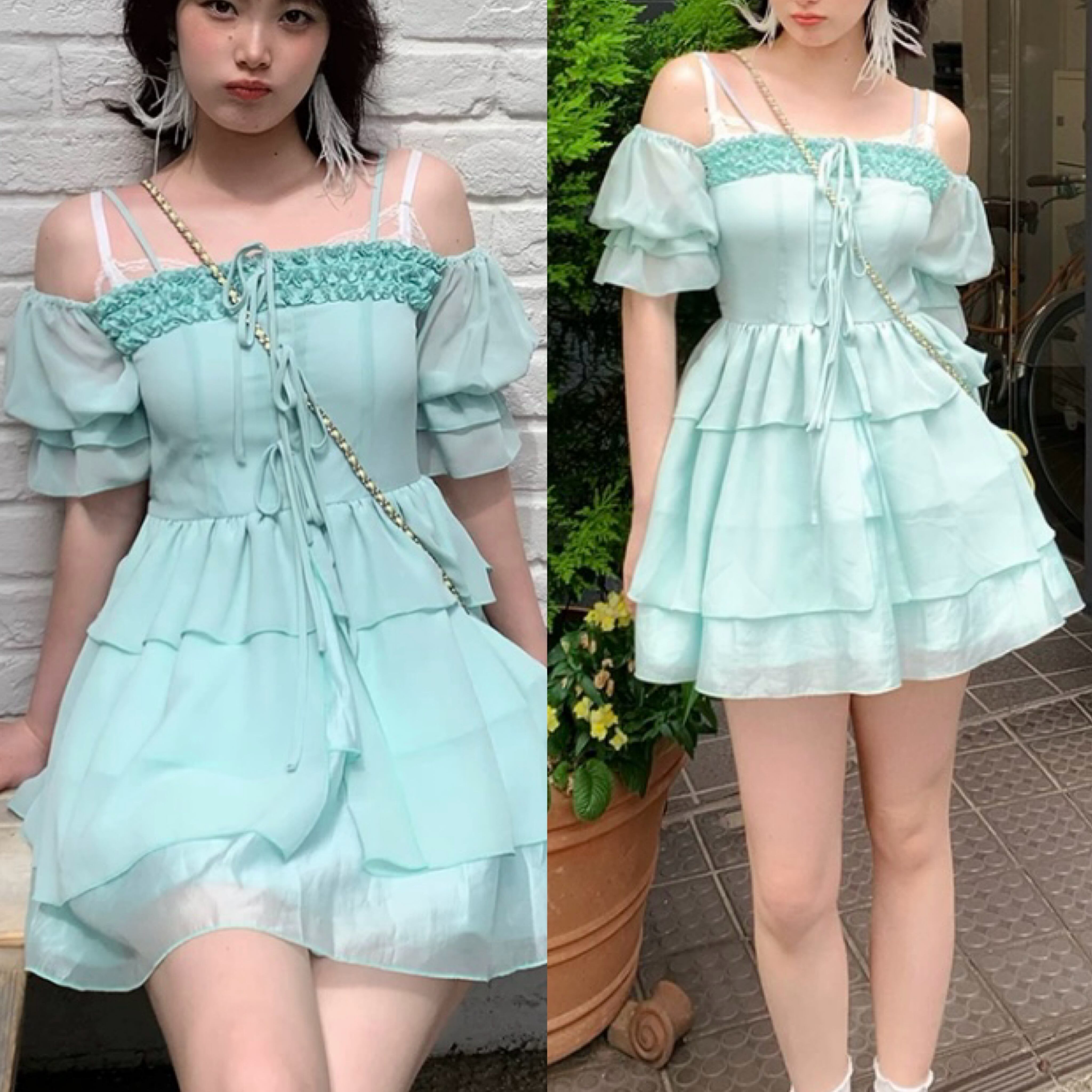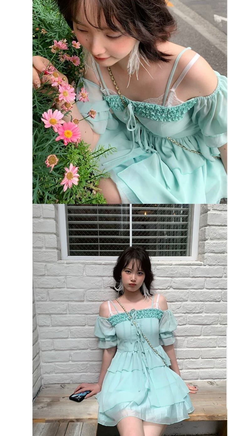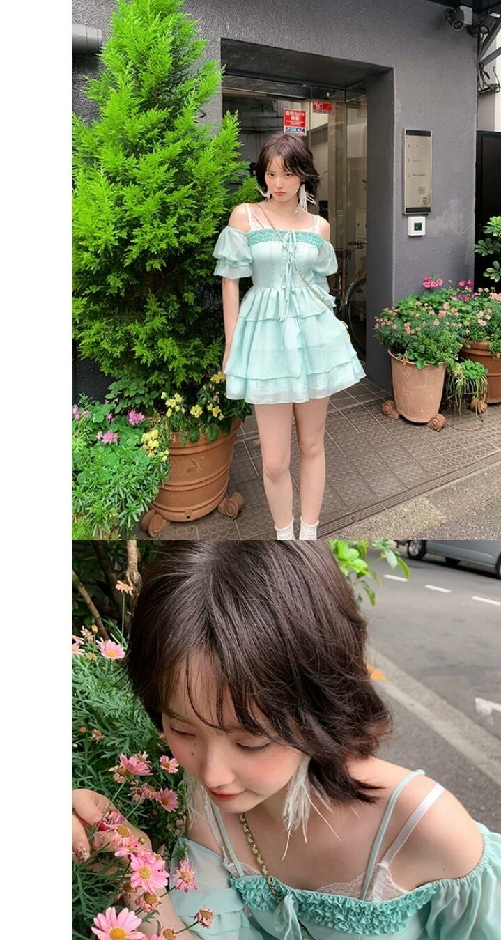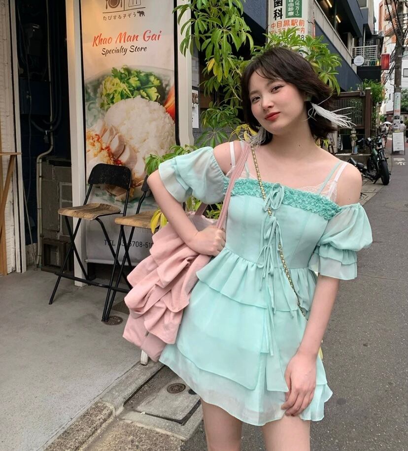 ガーリー 可愛い 緑 ワンピース フリル 原宿 ブラウス オフショルダー