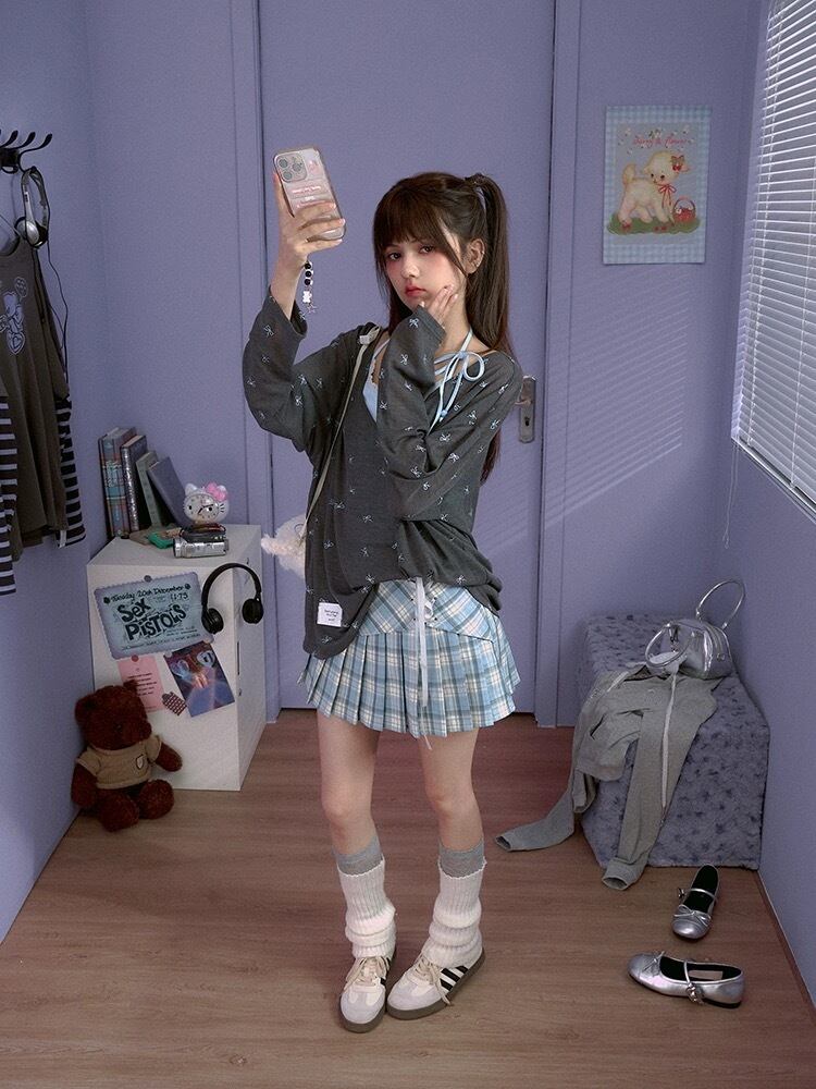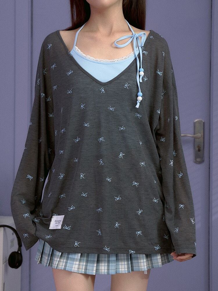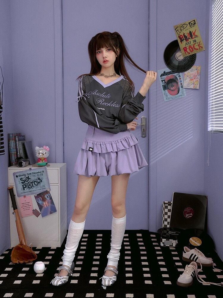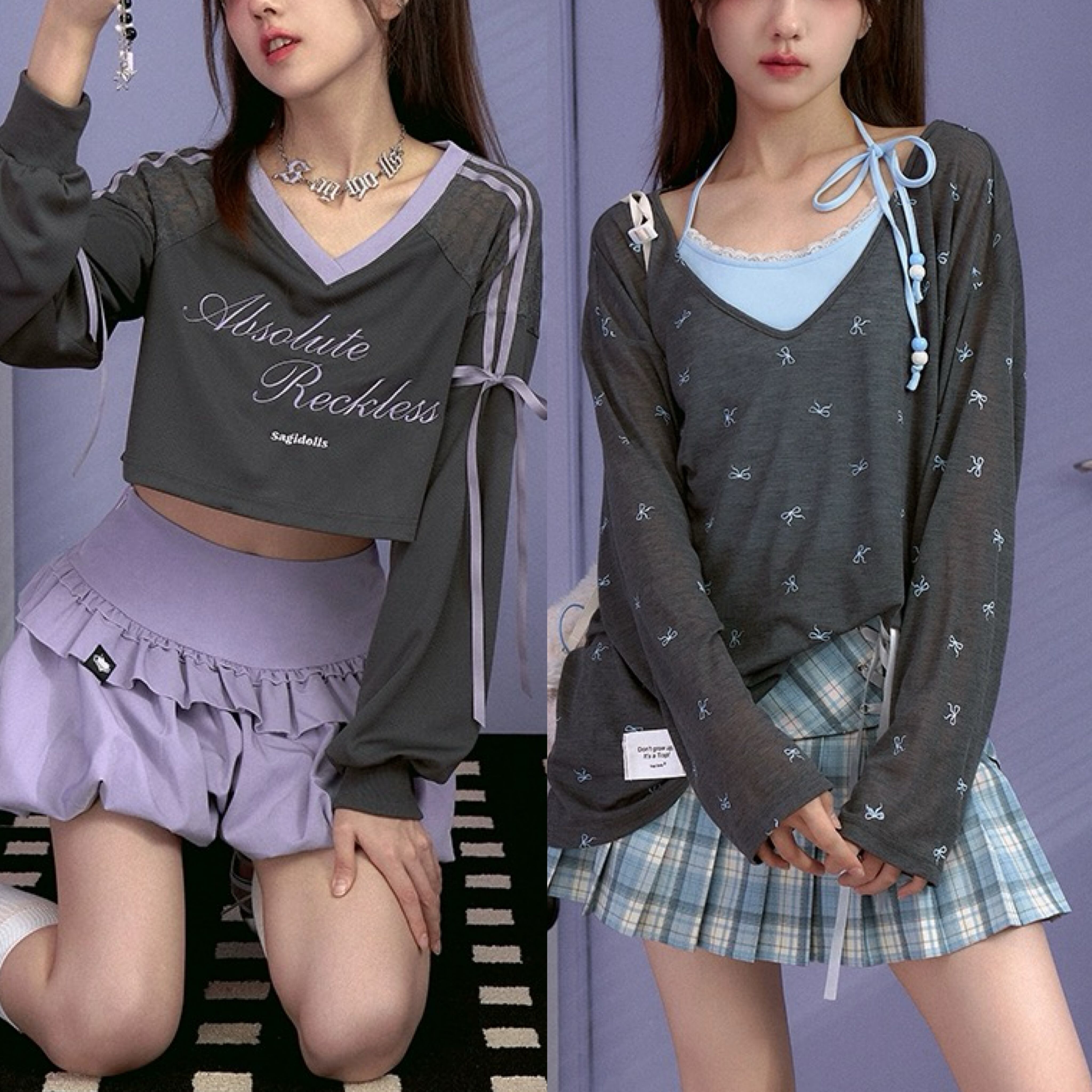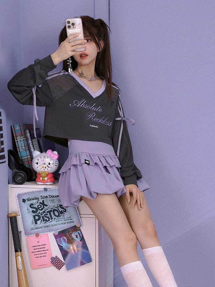 紫 リボン カジュアル グレー トップス ガーリー ブラウス 原宿 紫