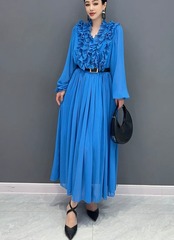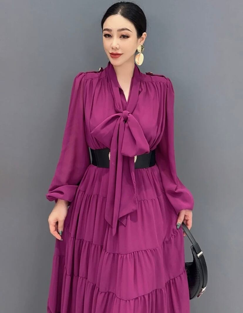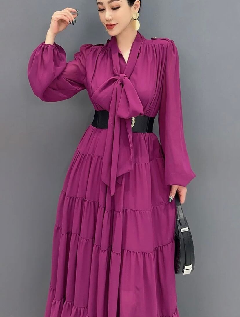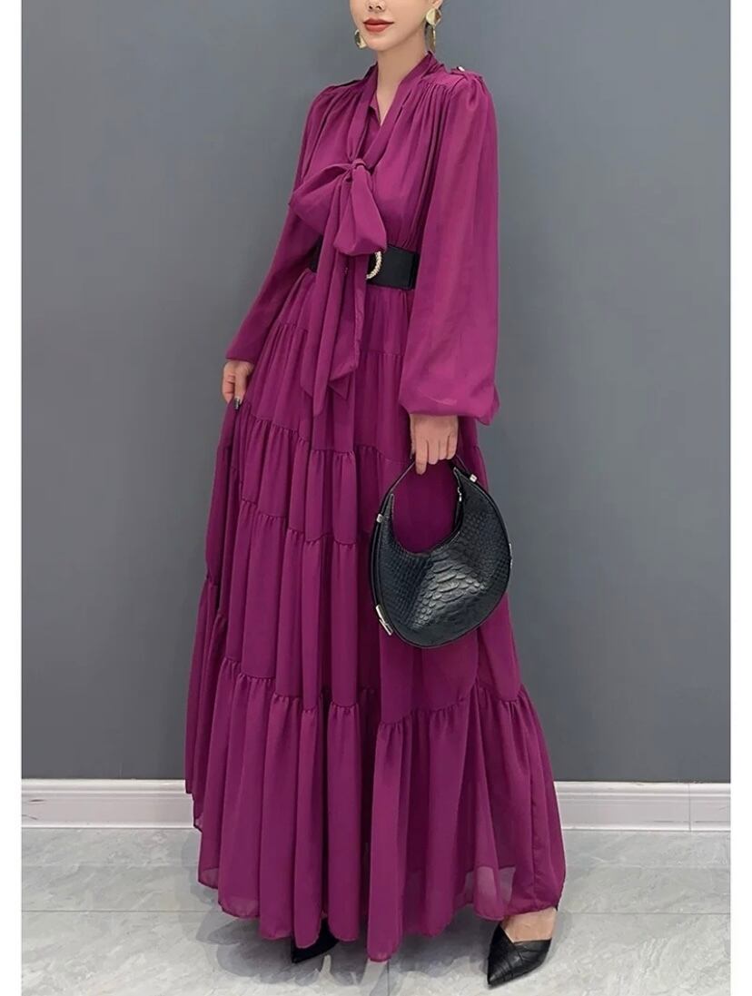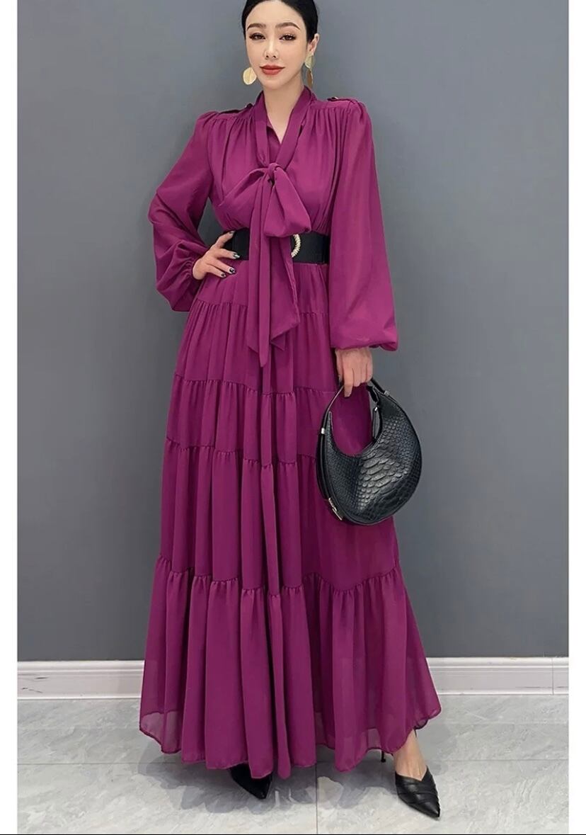 黄色 水色 ブラウス 紫 リボン マキシ ワンピース エレガント XL