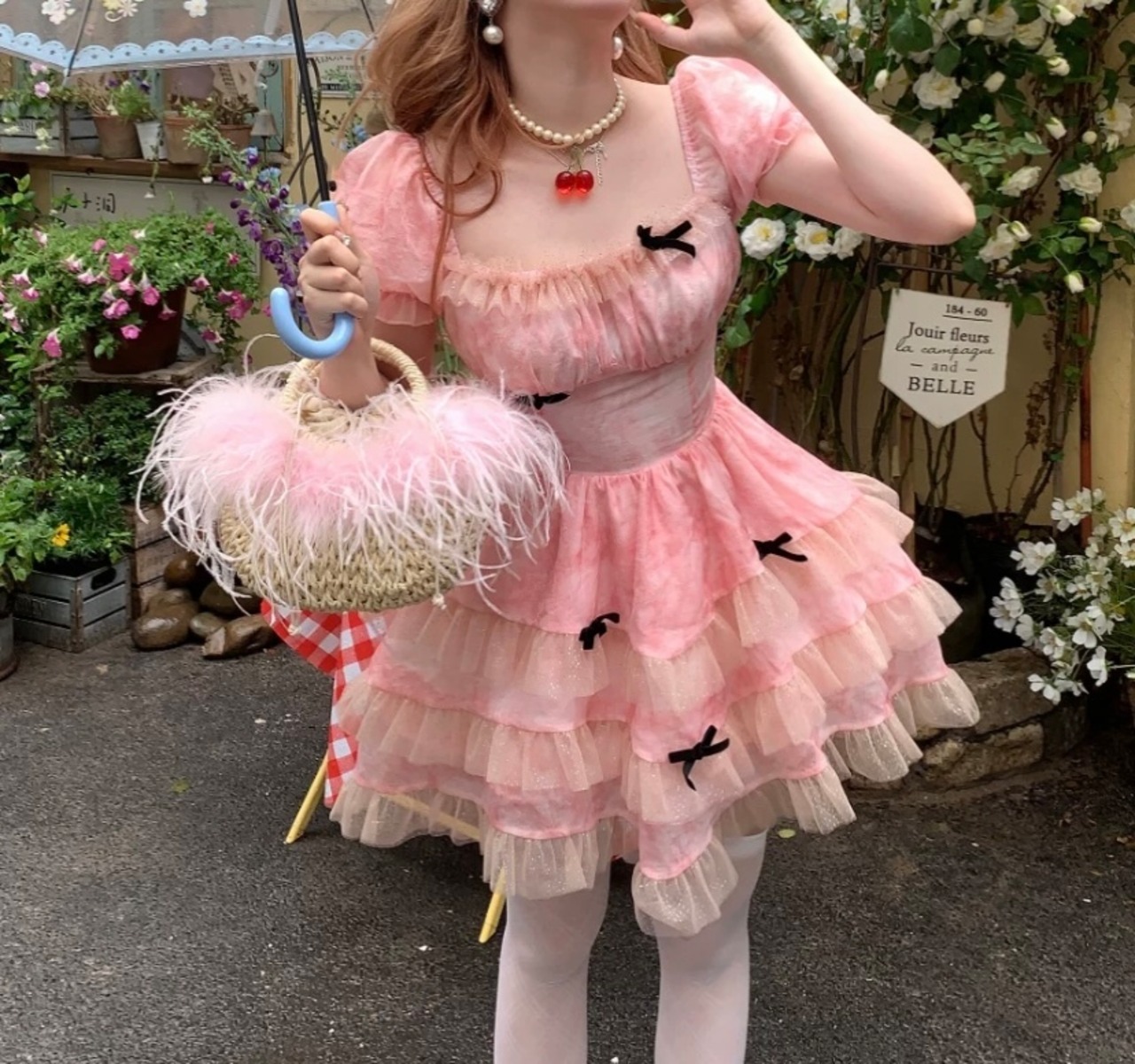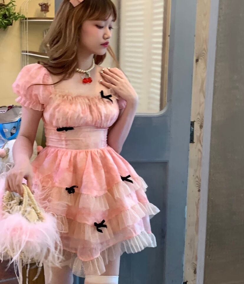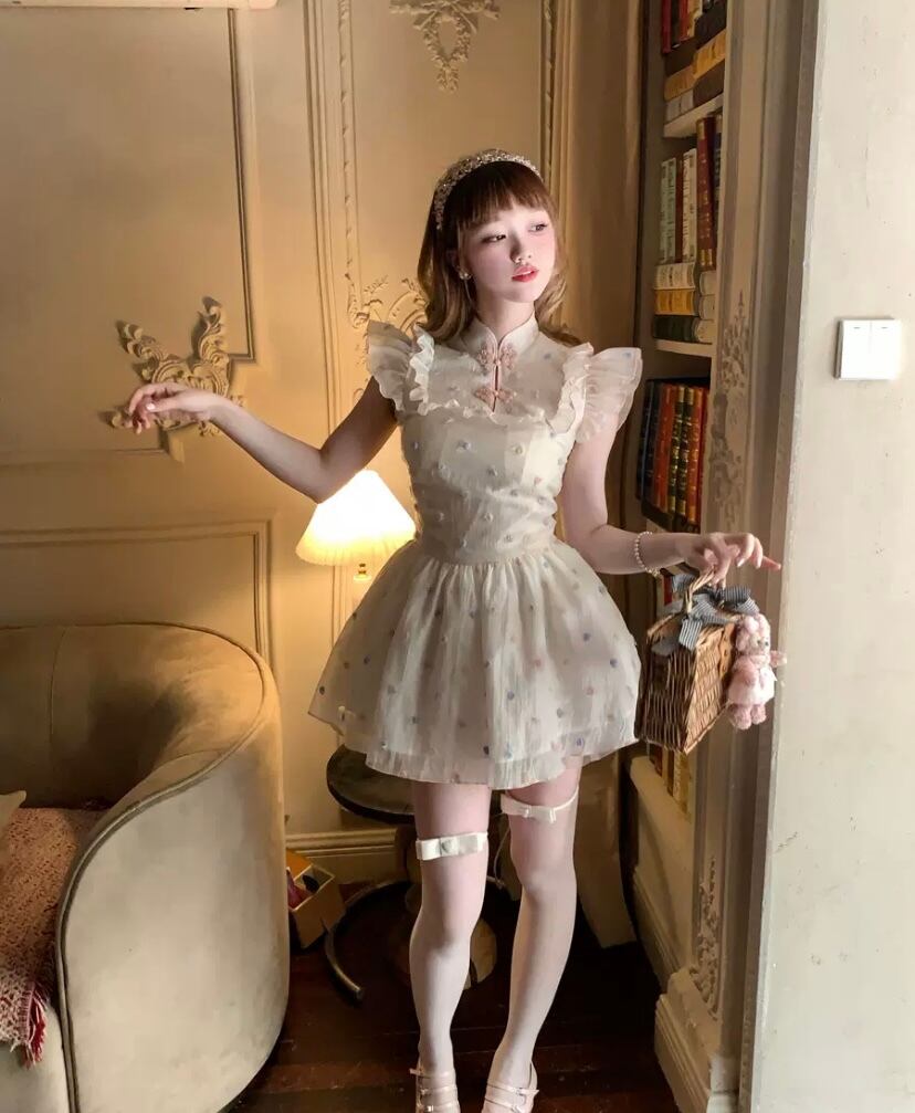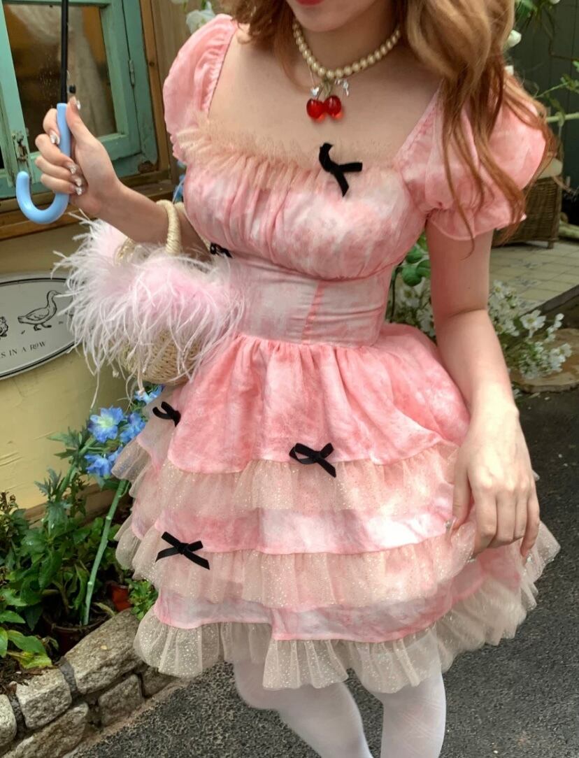 ベージュ チャイナ リボン ワンピース ガーリー ピンク ドレス 姫 可愛い ブラウス