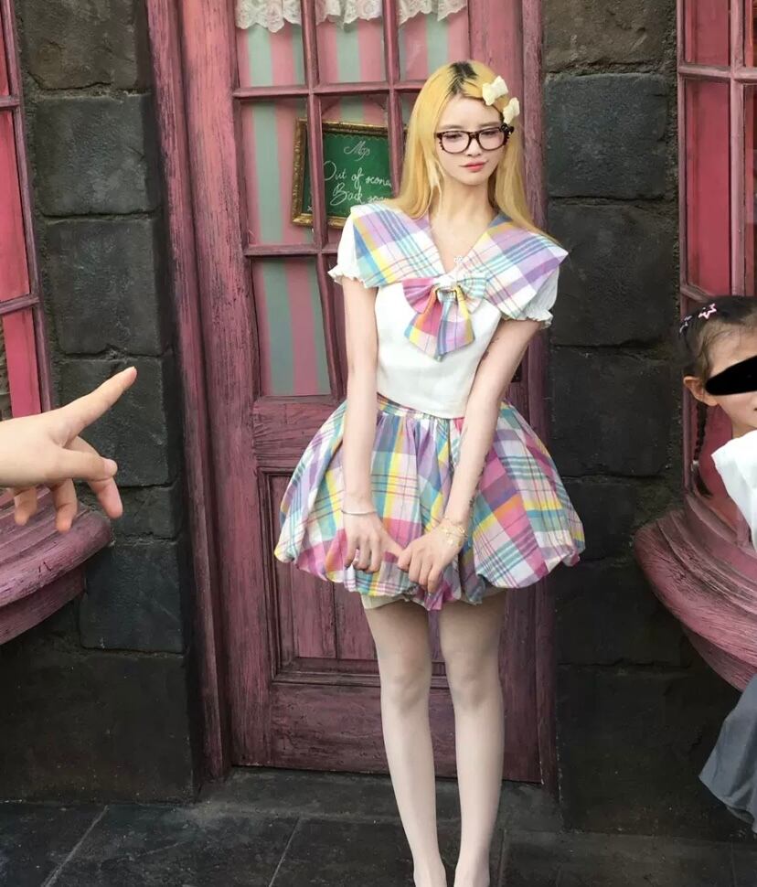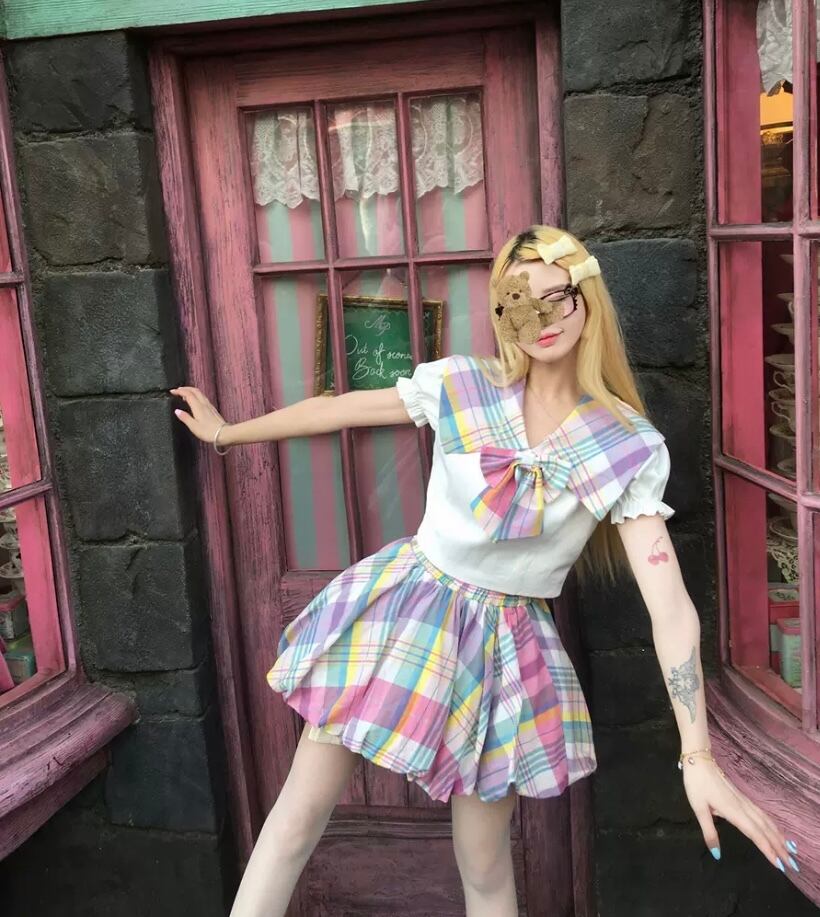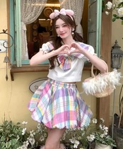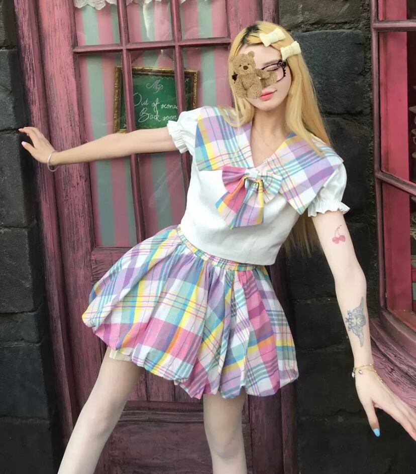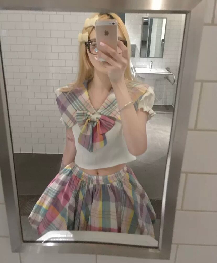 【セットアップ】セーラー ブラウス カラフル リボン チェック スカート スクール レインボー 原宿 コスプレ 制服