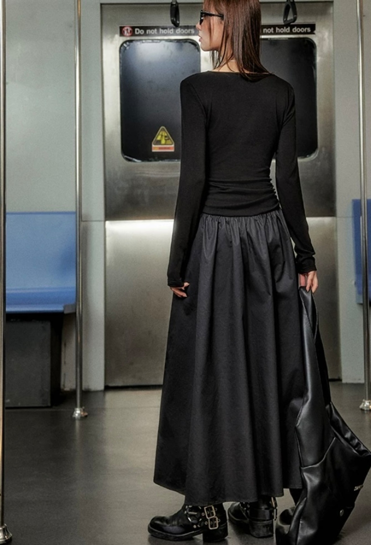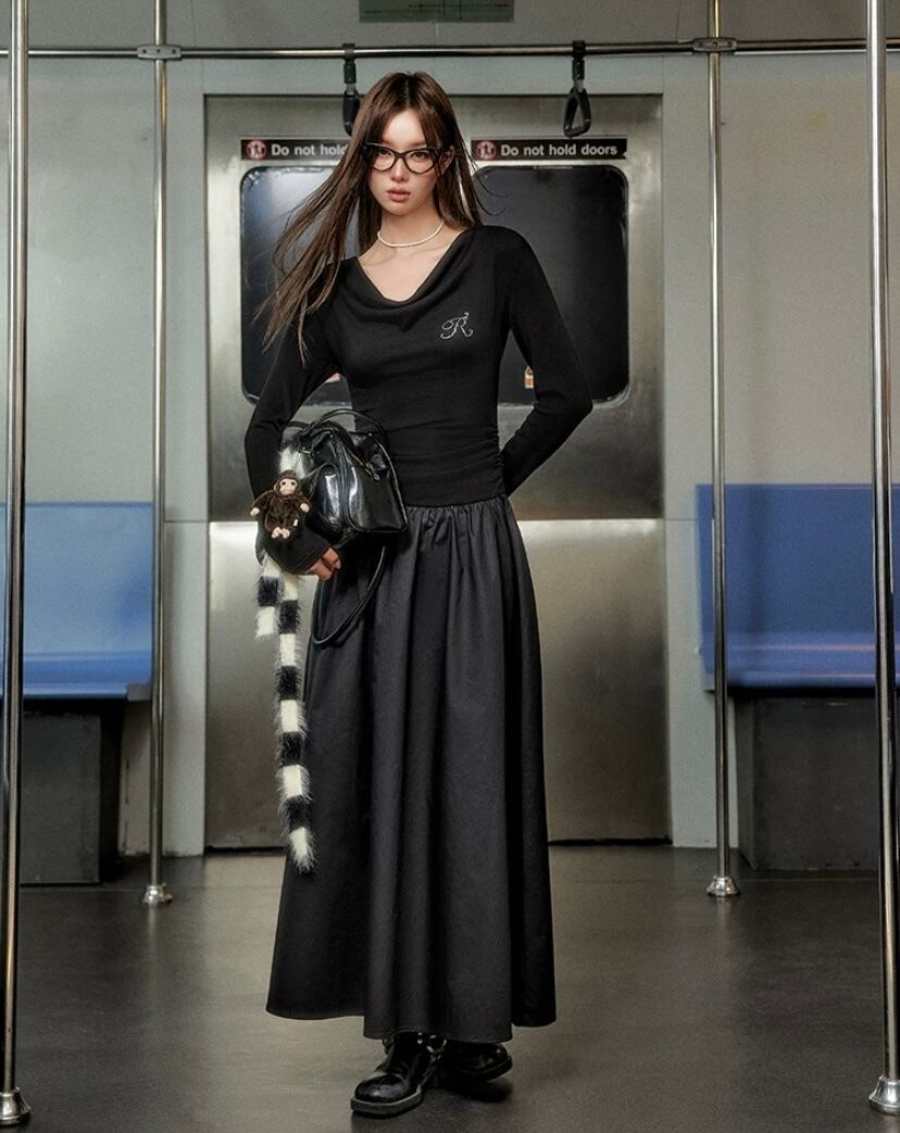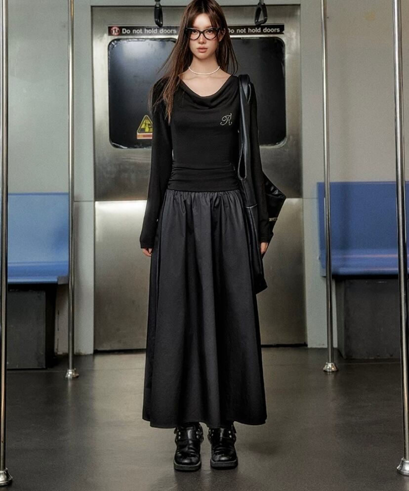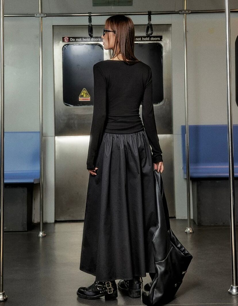 黒 マキシ ロング カジュアル ワンピース 可愛い ブラック スカート