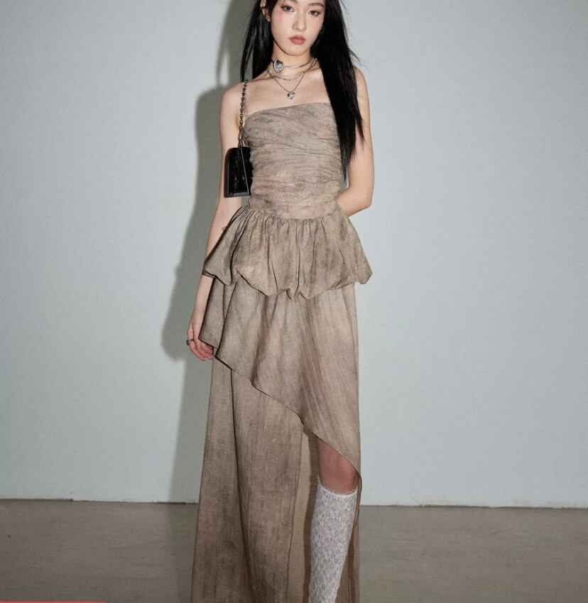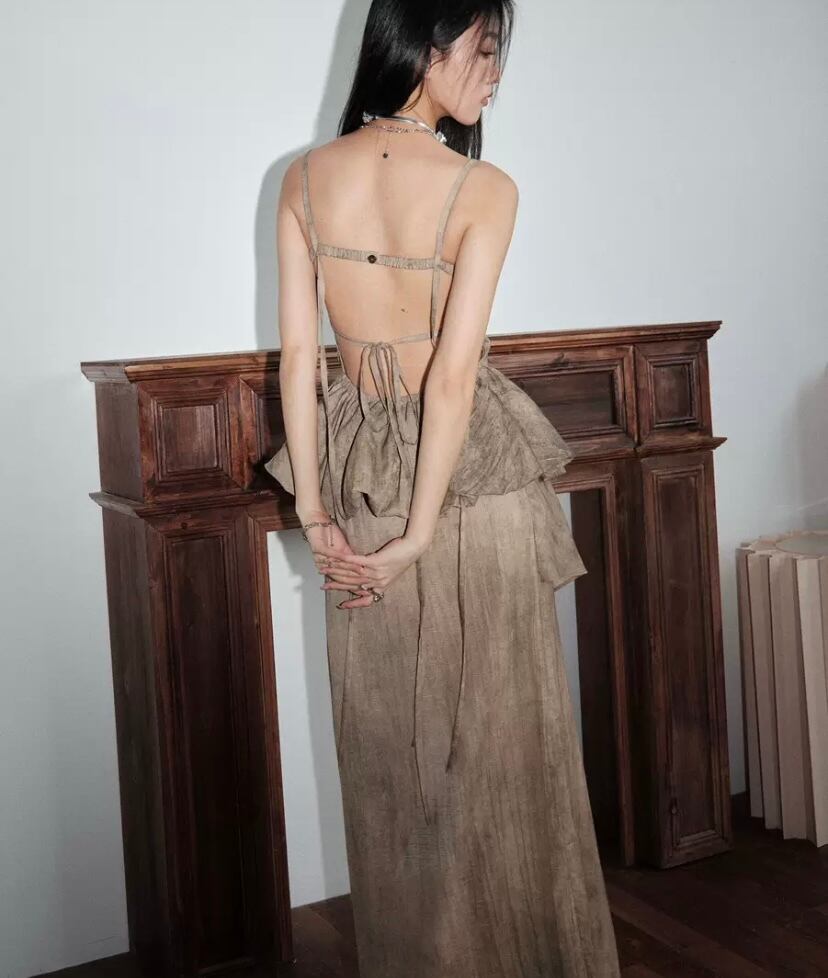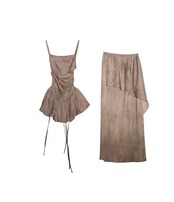 【セットアップ】ベージュ キャミソール スカート スリット リボン コルセット ワンピース