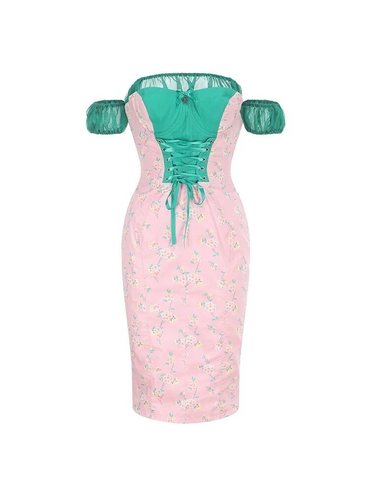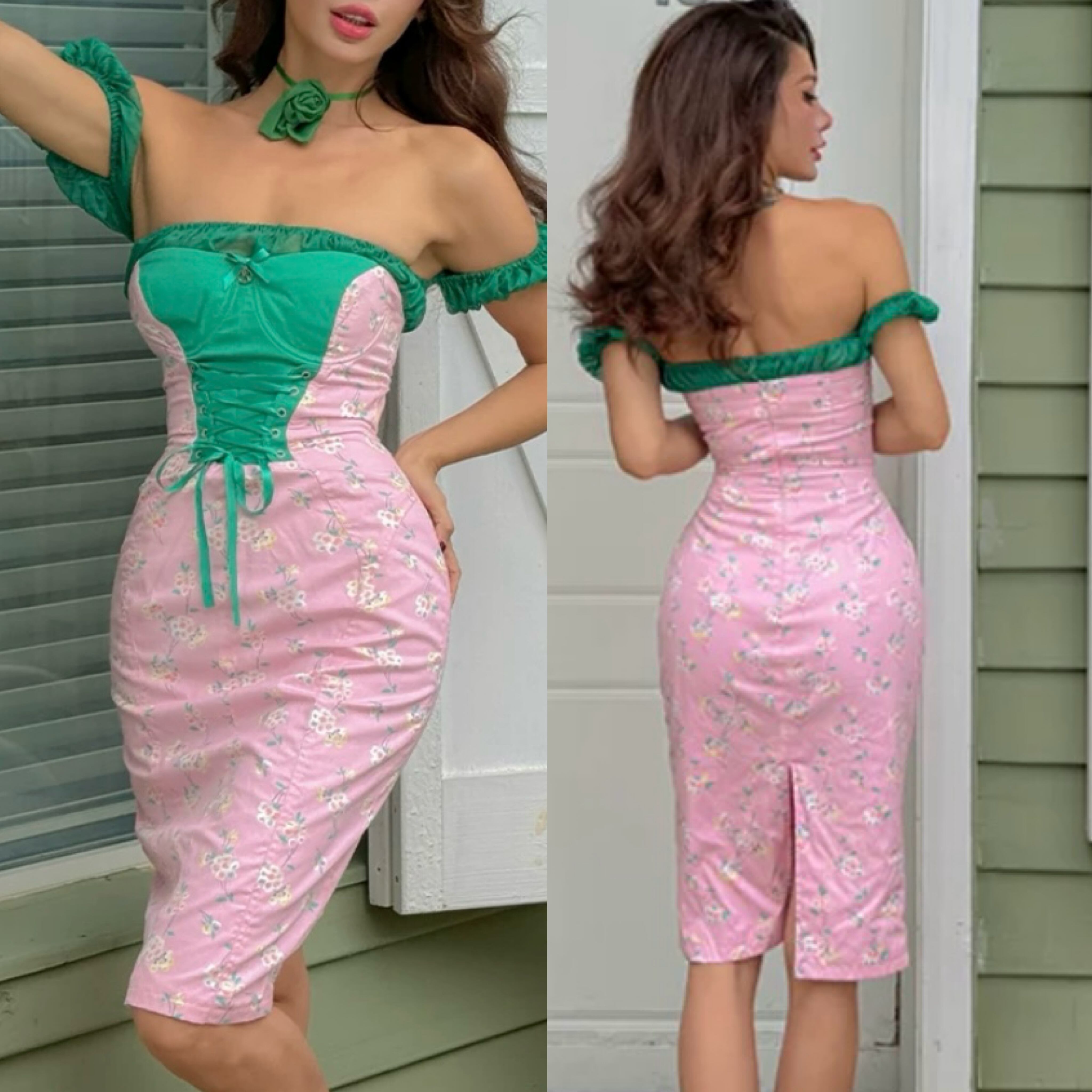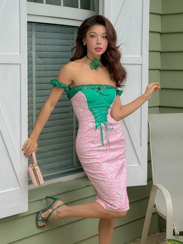 ピンク 緑 タイト ワンピース オフショルダー パーティー ドレス ガーリー