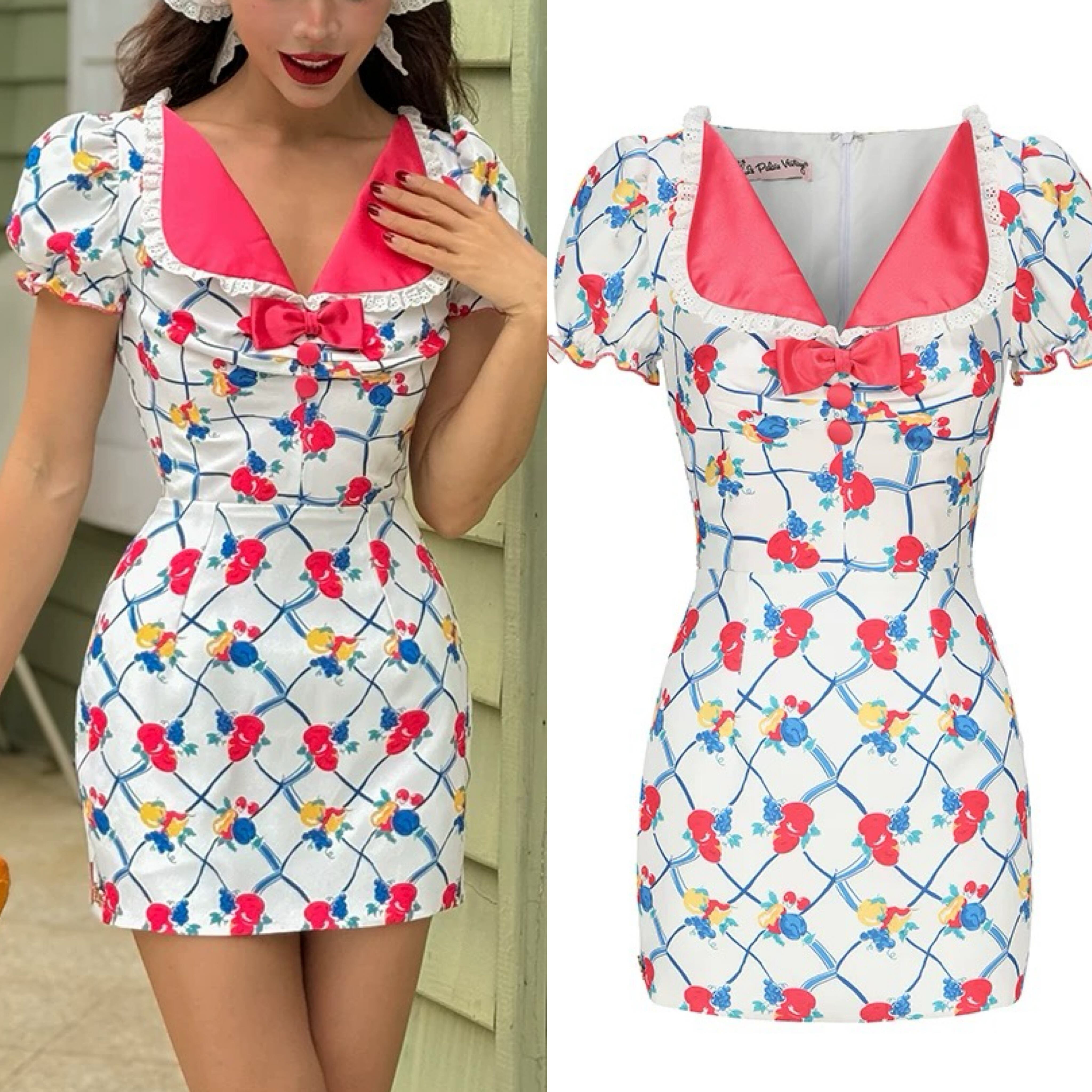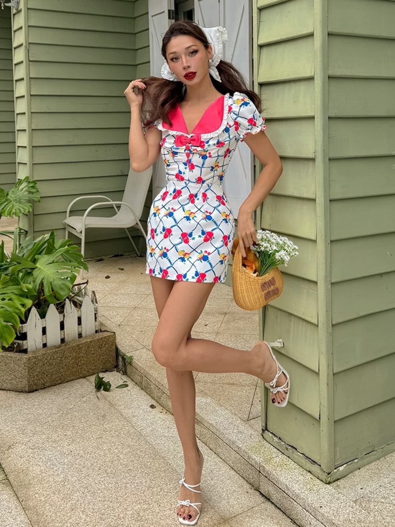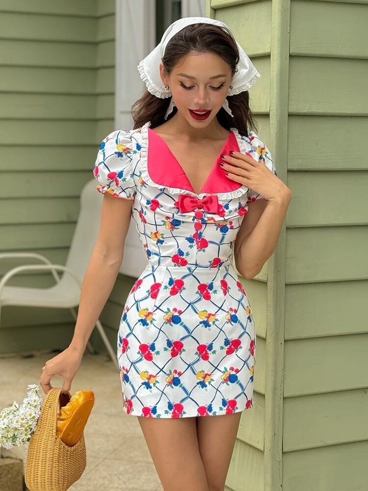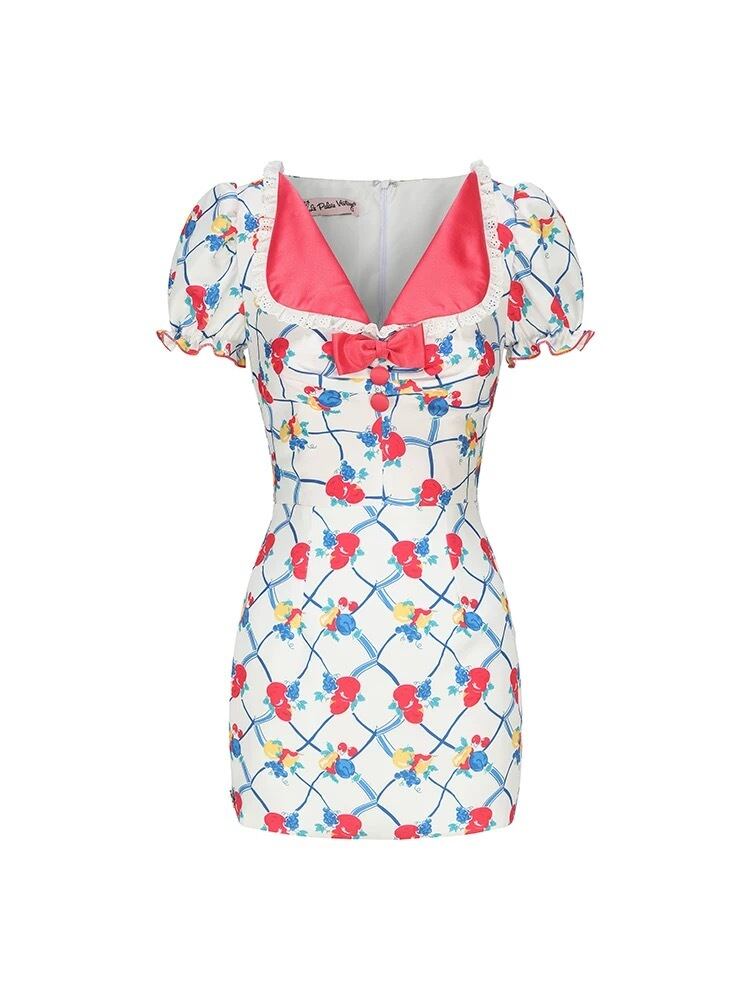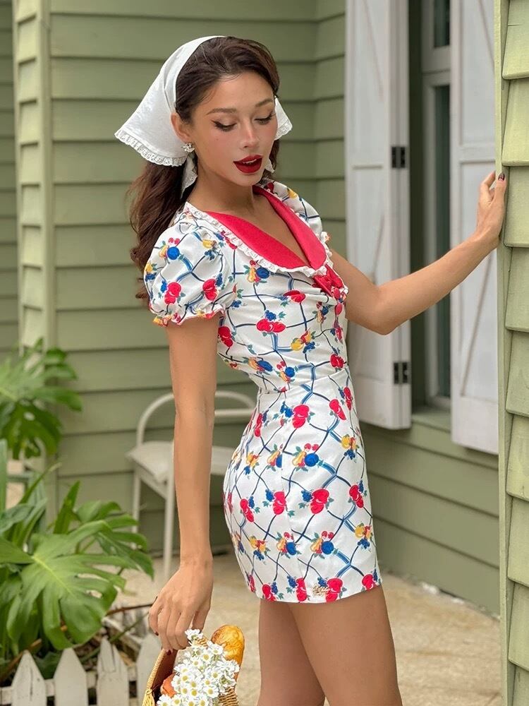 ピンク レトロ ワンピース ガーリー チェック 花柄 フラワー エプロン ウェイトレス レトロ