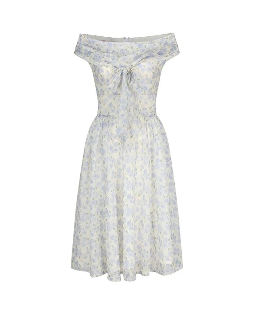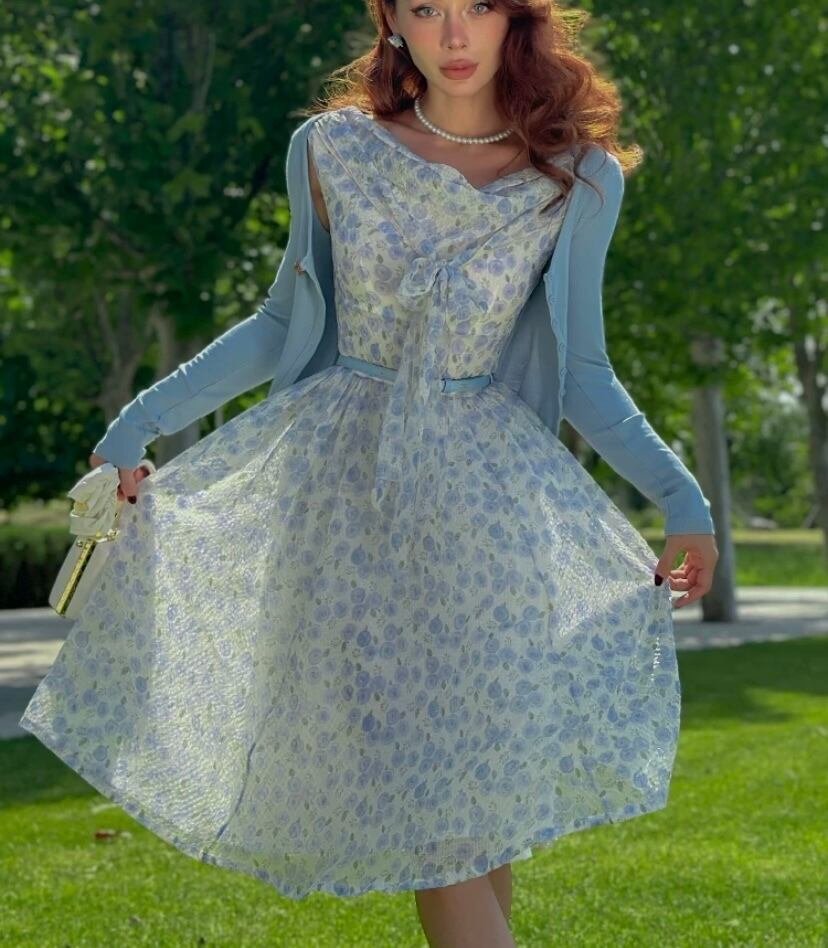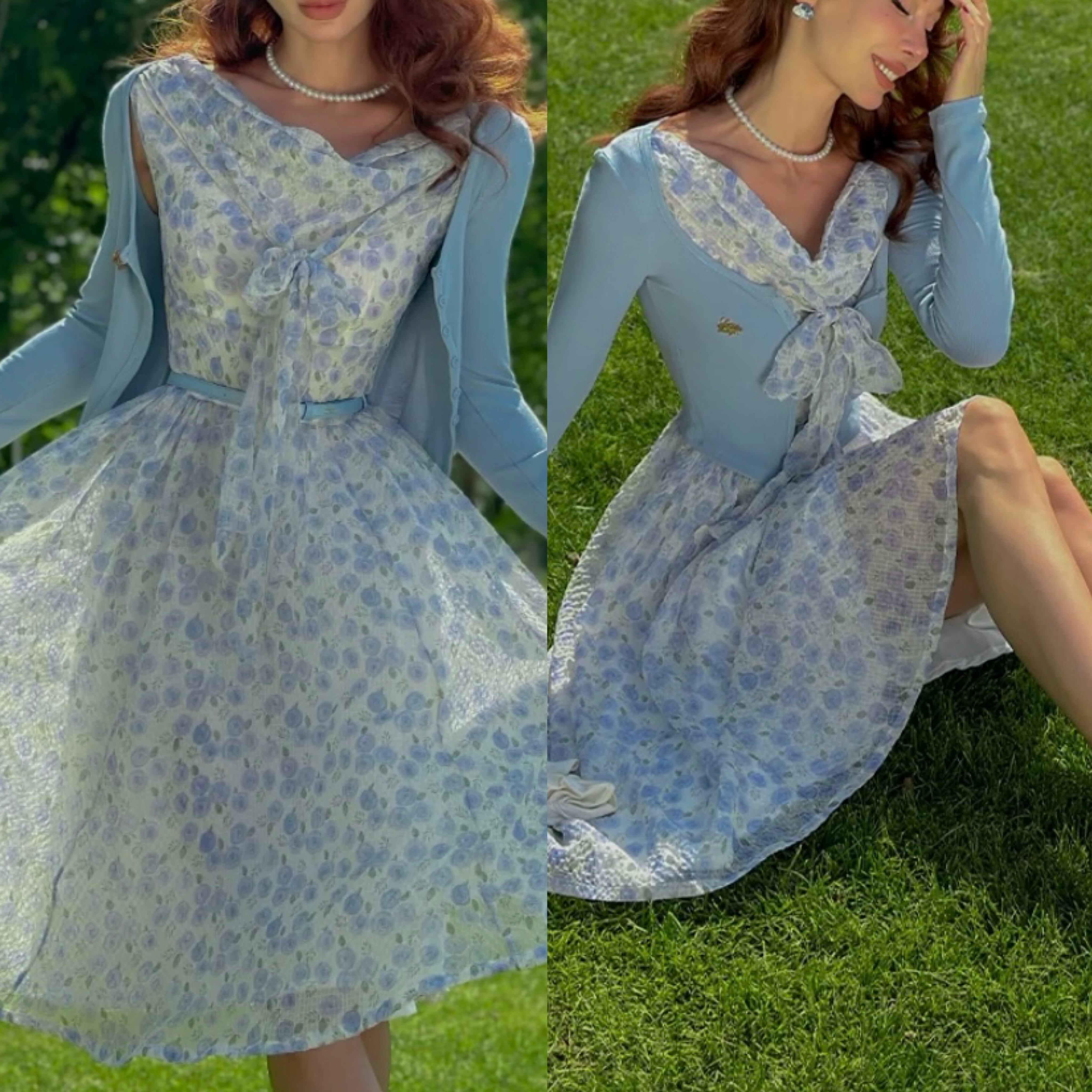 水色 花柄 フラワー クラシック ワンピース ガーリー レトロ リボン