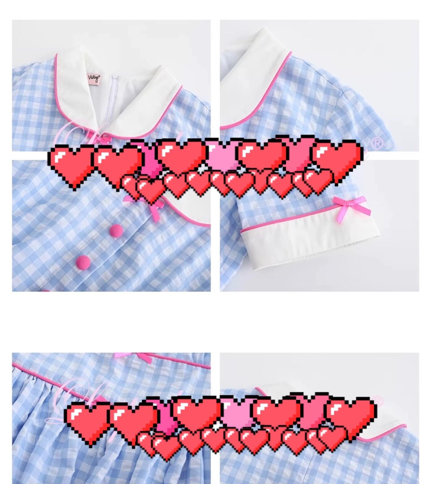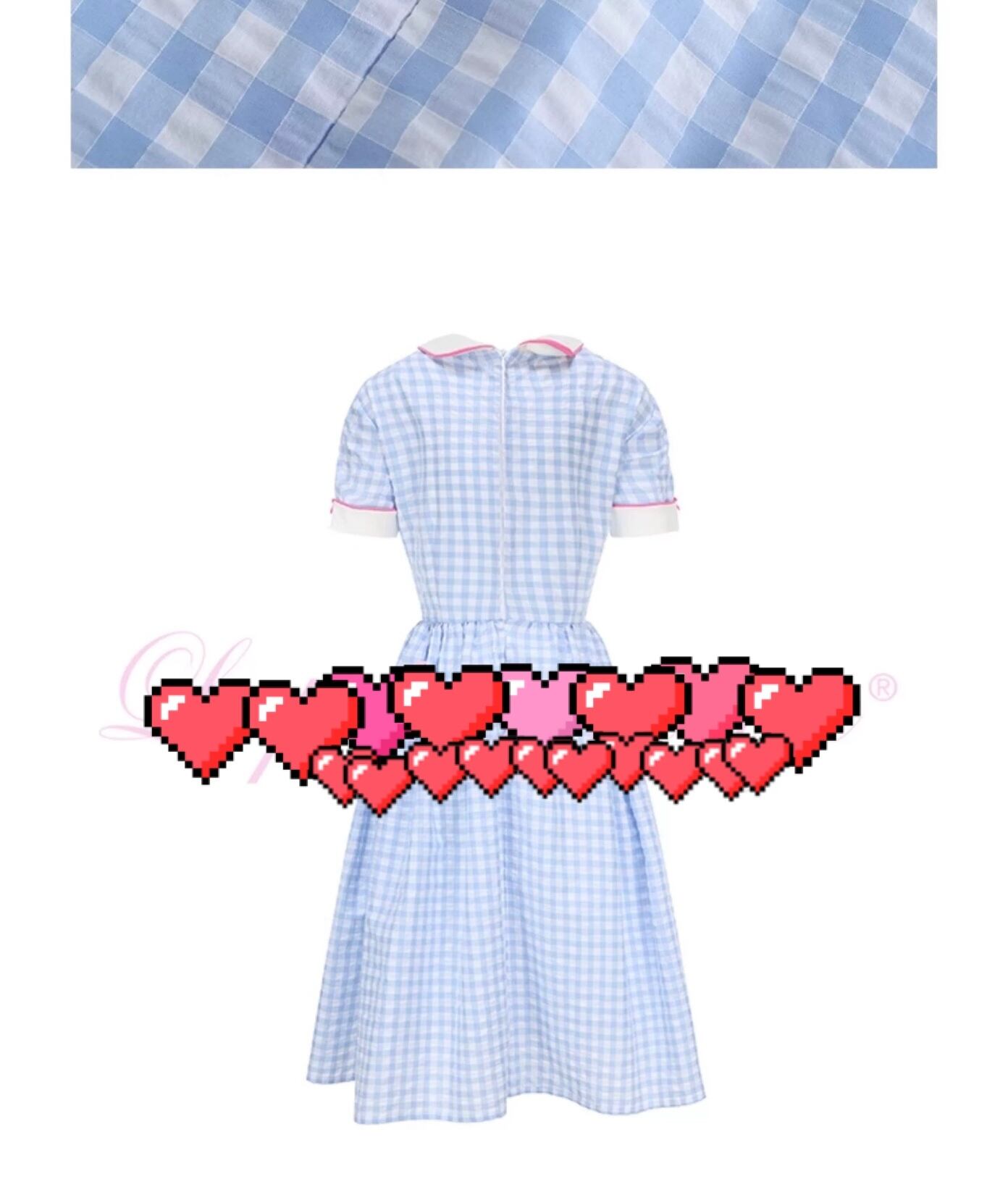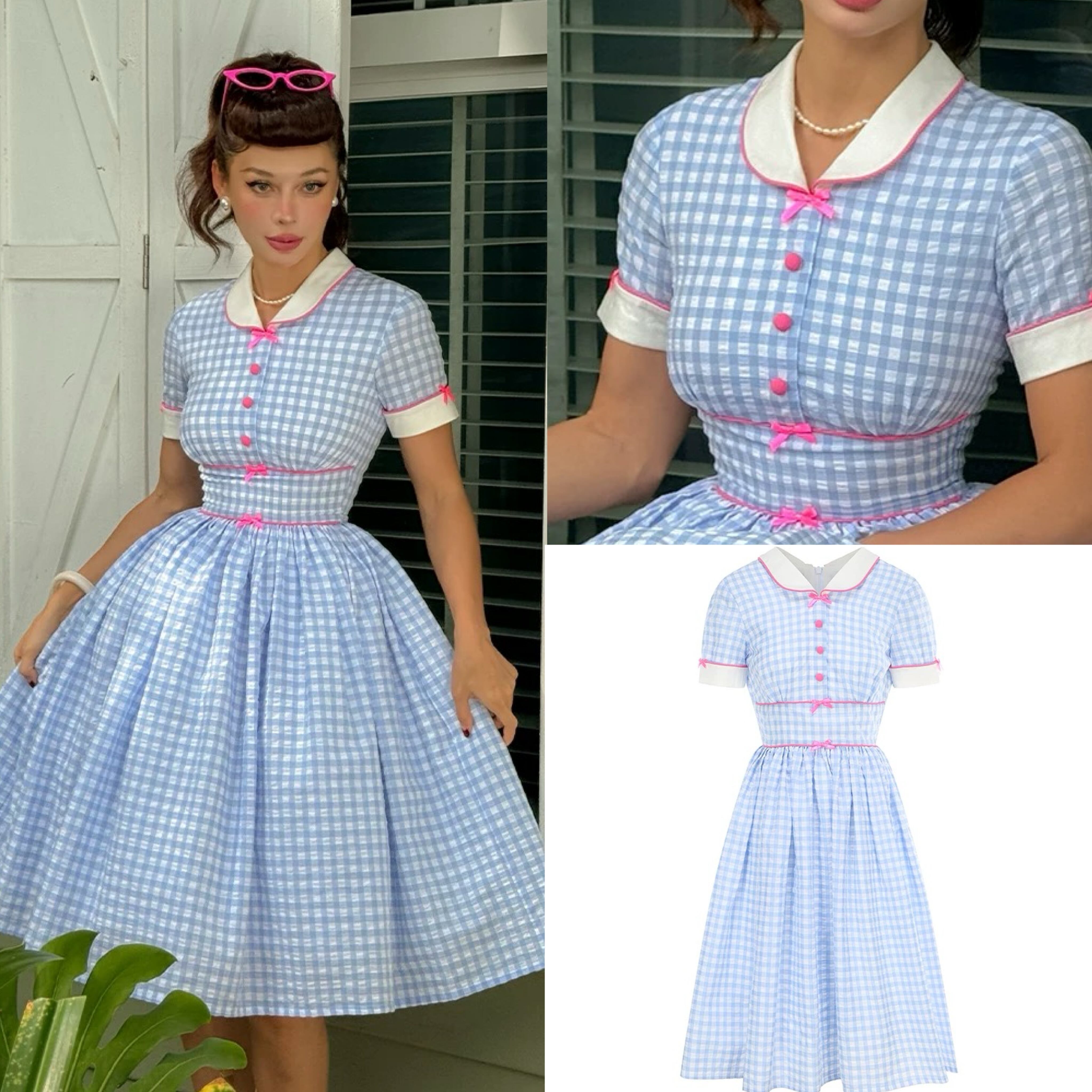 水色 クラシック レトロ チェック ピンク リボン 可愛い ガーリー 丸襟 原宿 ドレス ワンピース ブラウス