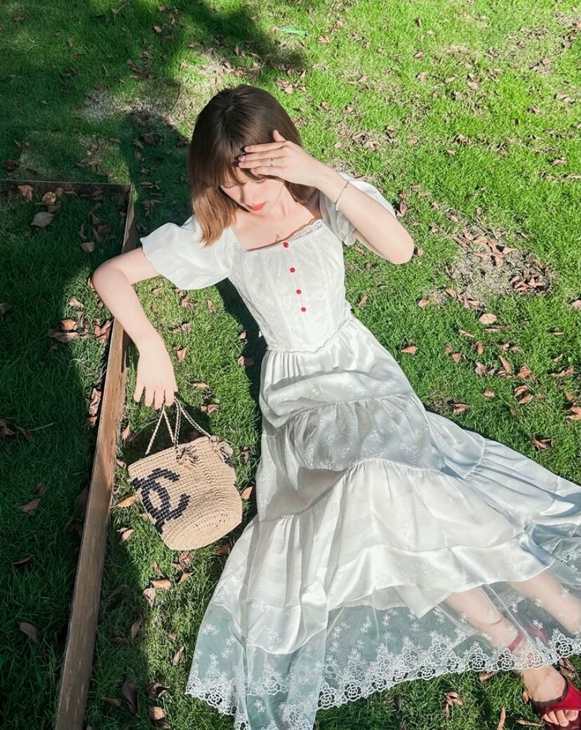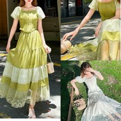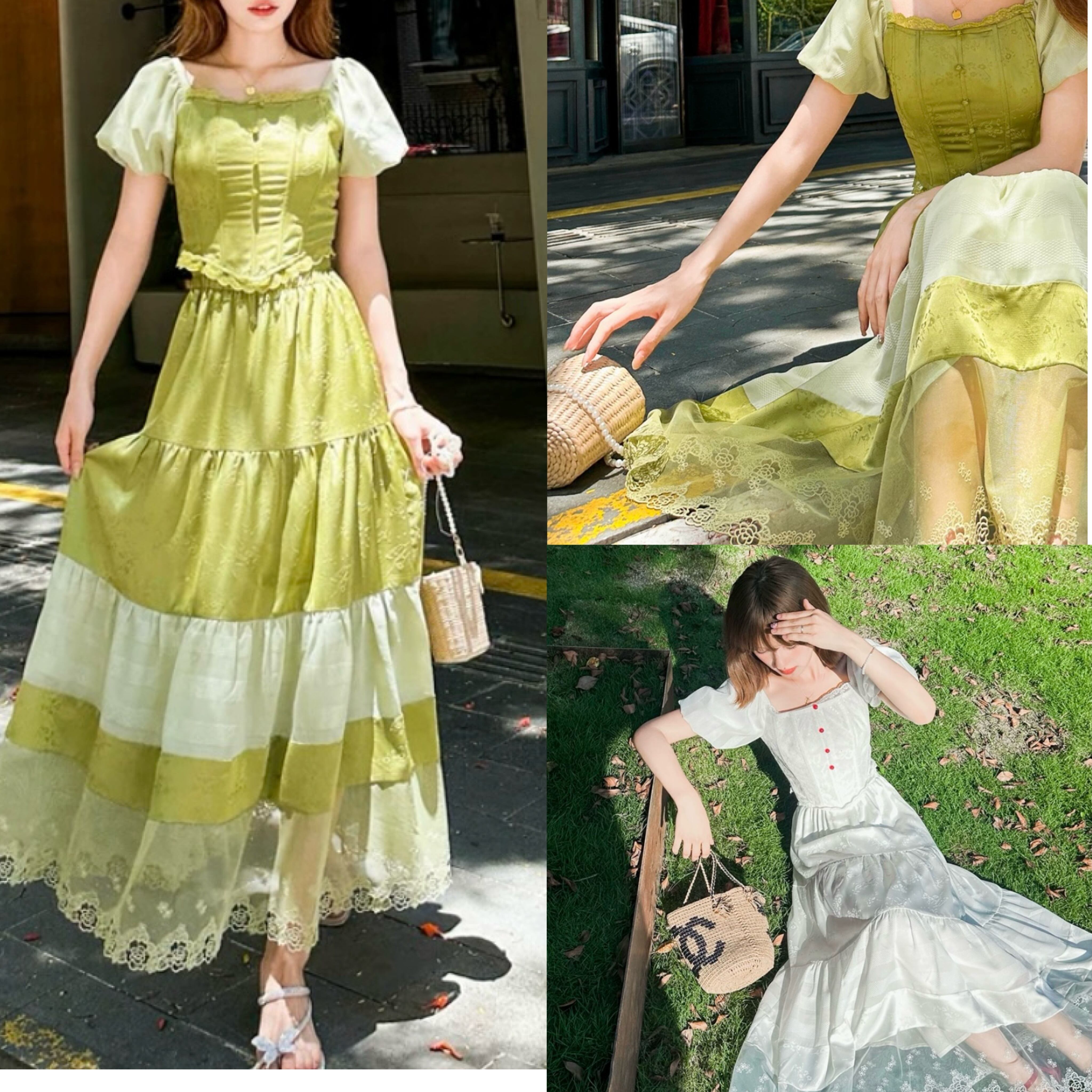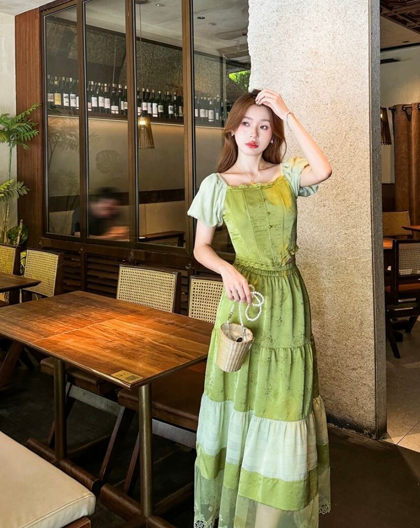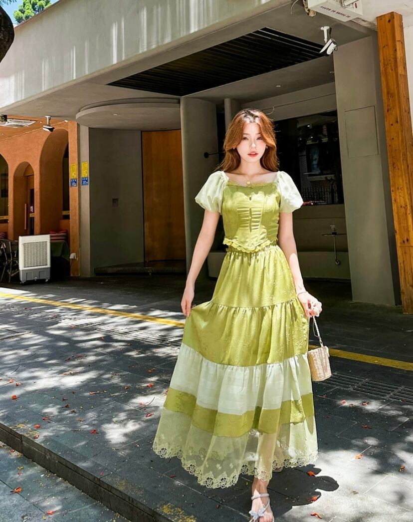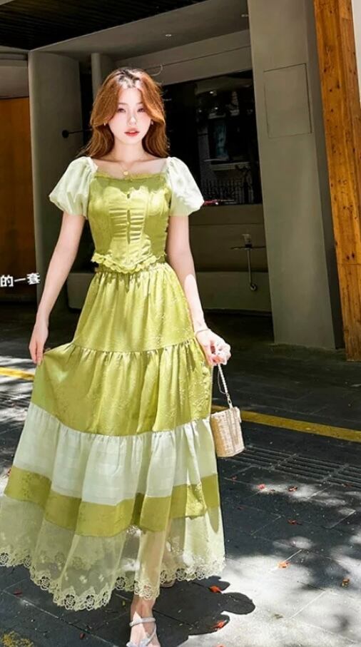 【セットアップ】緑 白 スカート ガーリー XL ブラウス シンプル ワンピース 可愛い