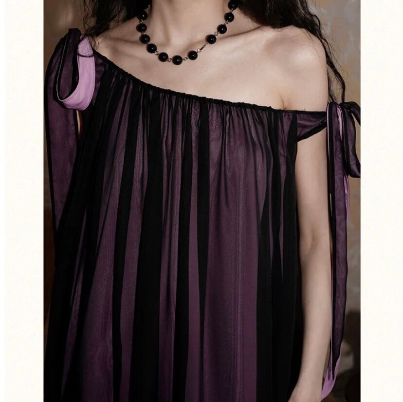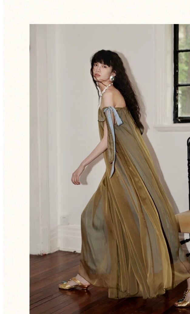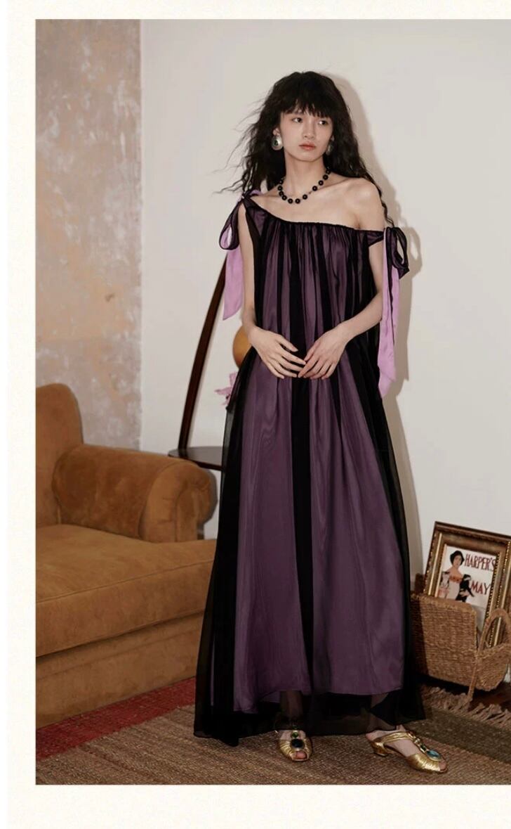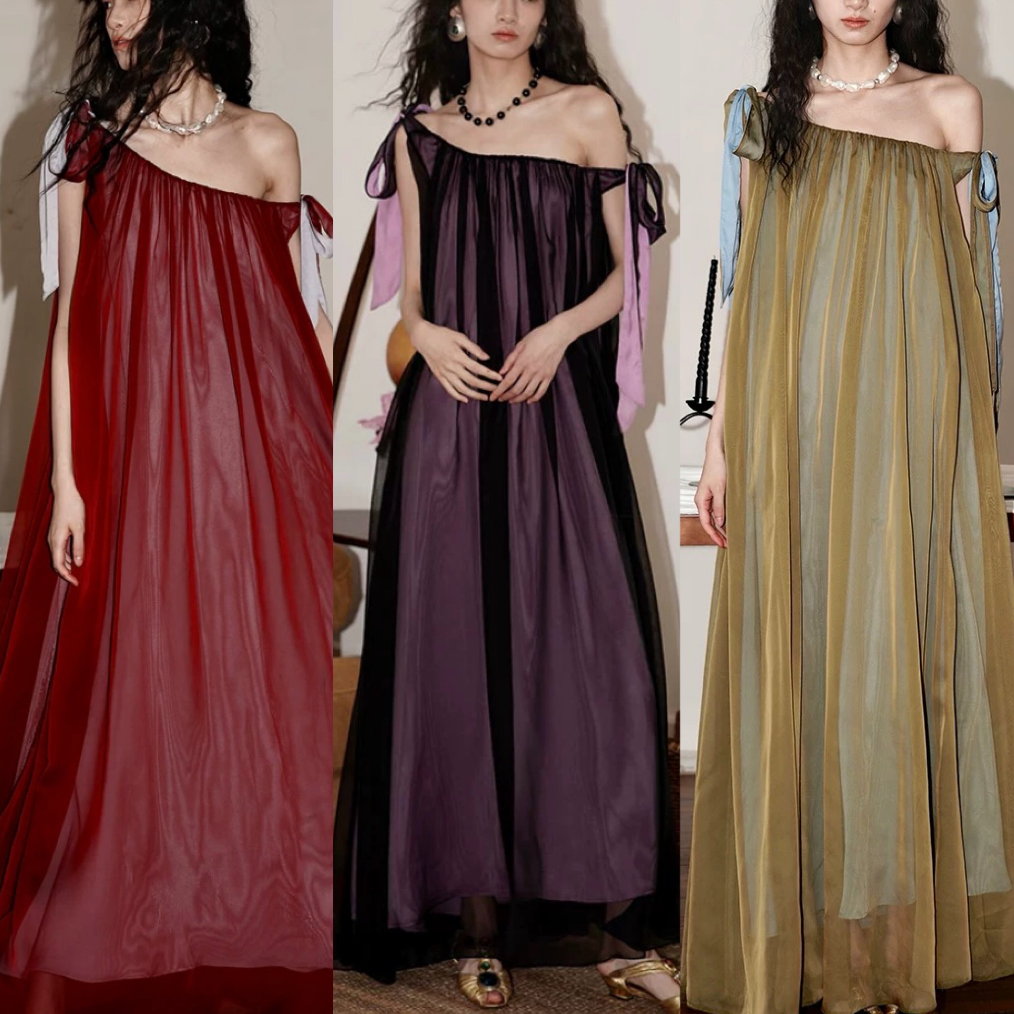 オフショルダー ドレス ワンピース リボン 茶色 ベージュ 紫 赤 ロングドレス